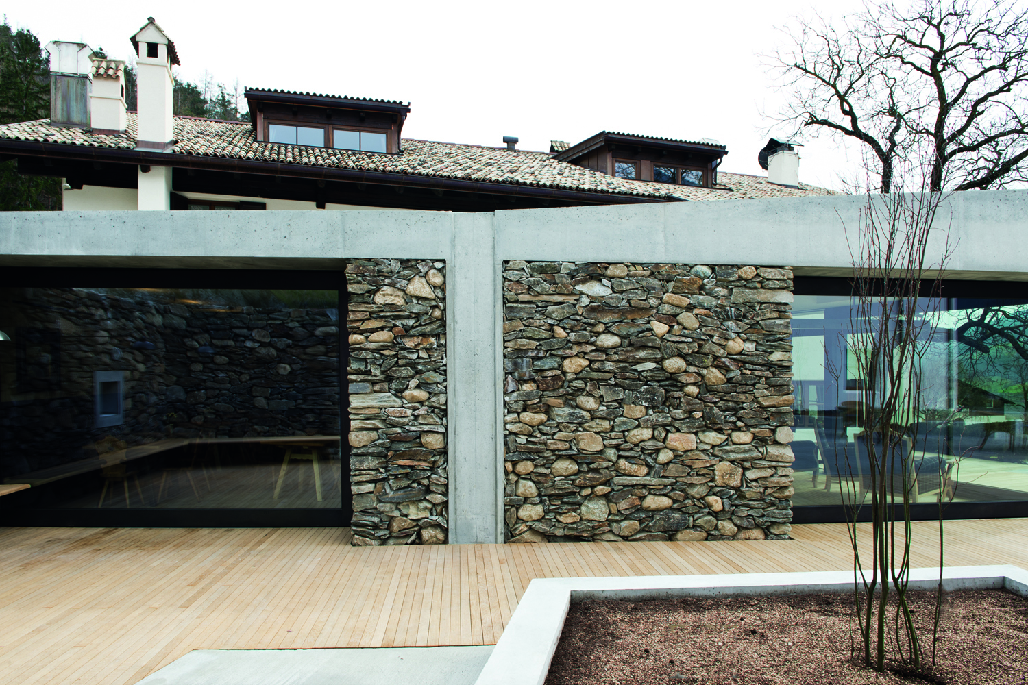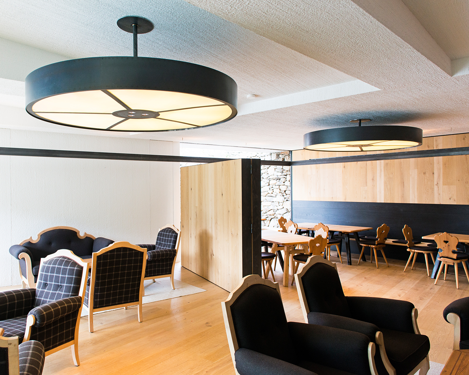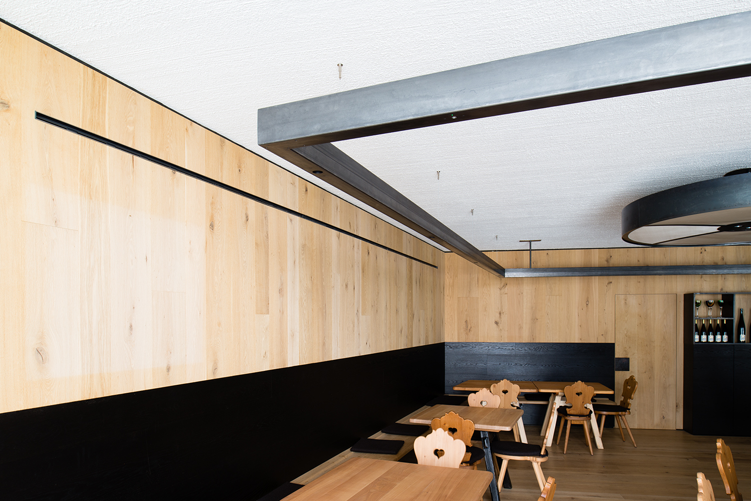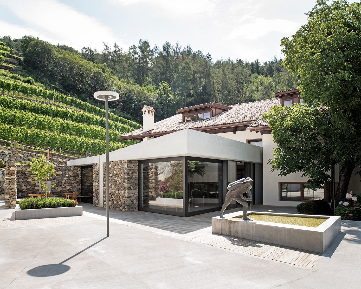 Die markante Skulptur aus hydrophobiertem Sichtbeton erscheint als sichtbare Narbe im Natursteinmauerwerk, ein Übergriff in Materialität – Beton, Stein, Glas – und räumlicher Situation. Die facettenreiche Räumlichkeit wird zum Essen, zur Weinverkostung und Begegnung genutzt. Verglaste Schiebeelemente lassen sich komplett öffnen und verschwinden in der Steinwand. Der Innenraum wird zum Außenraum und es verändert sich die Wahrnehmung. Die Gemütlichkeit der Tiroler holzgetäfelten Stuben wird in Qualität von Ruhe und Behaglichkeit aufgenommen und trotzdem zeigt sich der Salon in klarer, heller, moderner Architektursprache. Das Dach bietet als deutliches Bauelement Schutz.