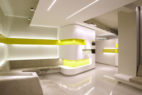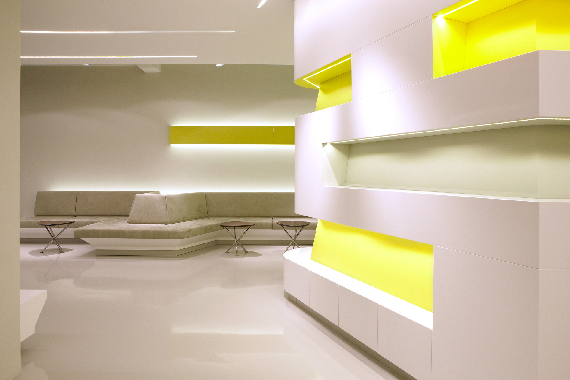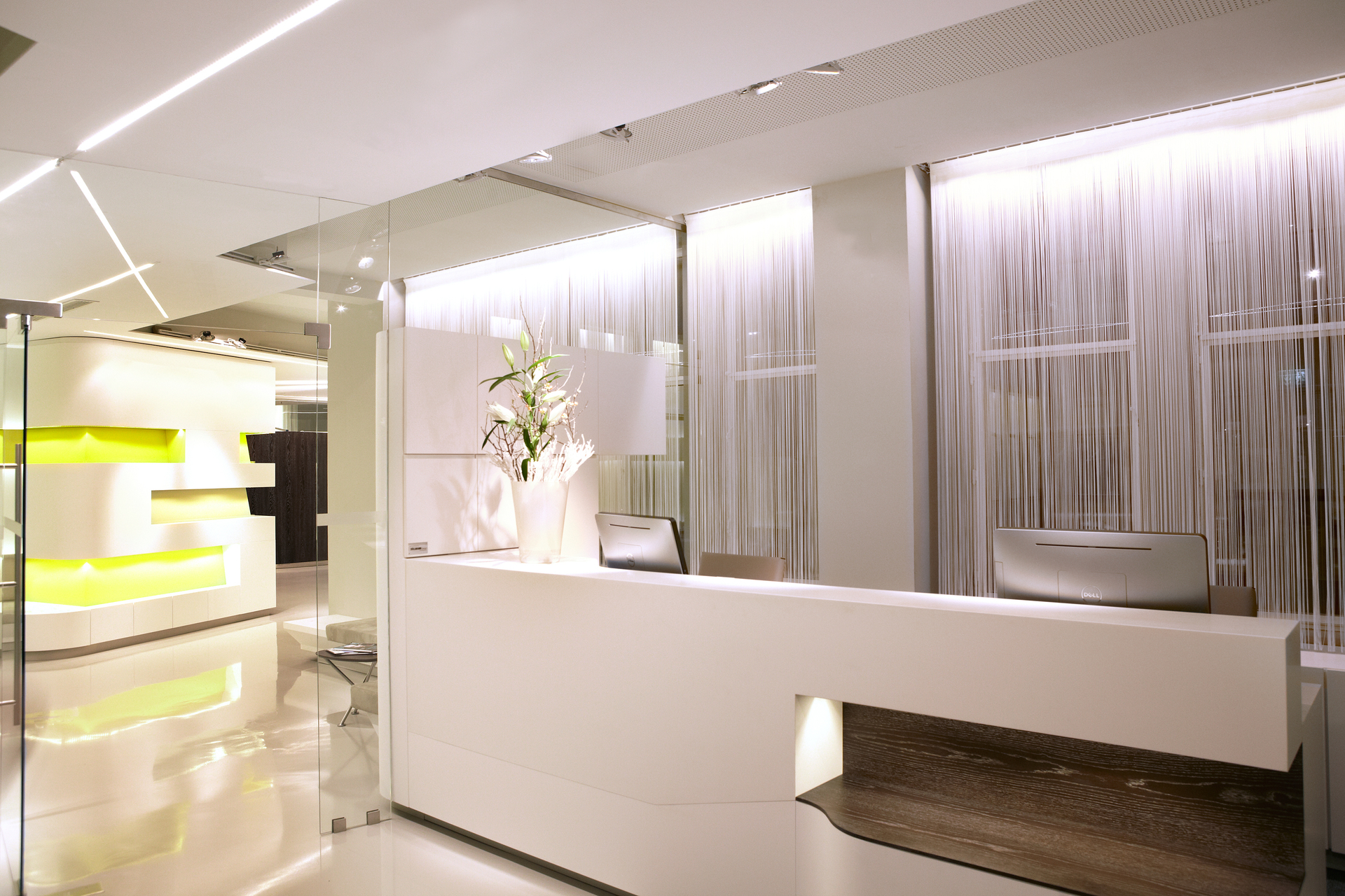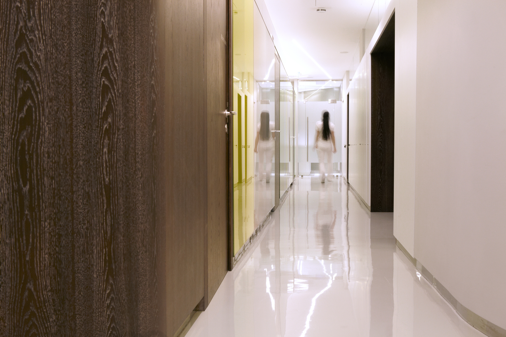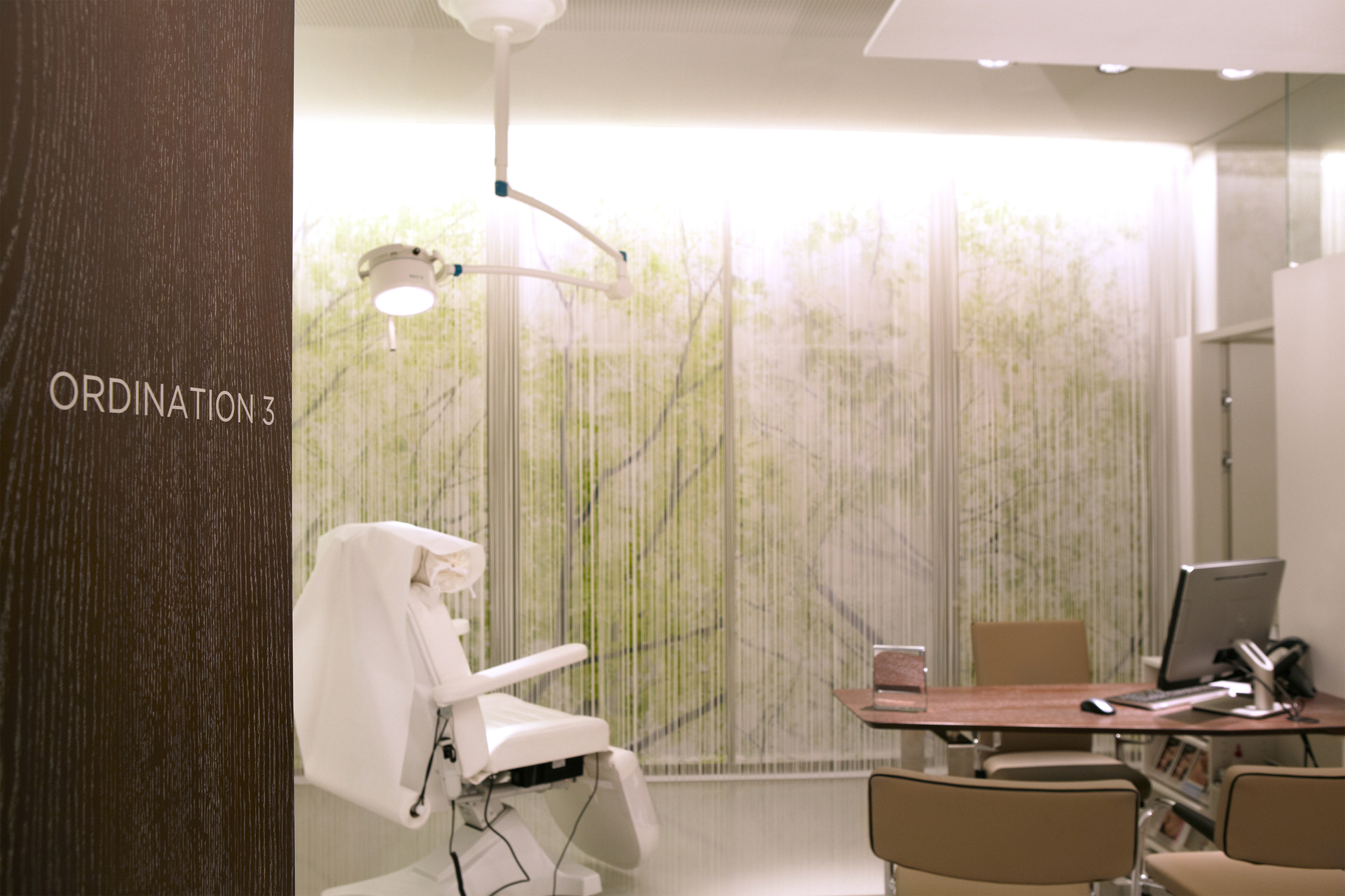 Nach außen präsentiert sich die Klinik durchwegs zurückhaltend, an der Tür findet sich kein Hinweis auf die Serviceleistungen, die hier angeboten werden. Die Diskretion wird im Anmeldebereich fortgeführt, wo eine Glaswand den Empfangsbereich vom Warteraum akkustisch trennt. Für einen diskreten Abgang nach der Behandlung sorgt ein gesonderter Ausgang. (Text: Martina Frühwirth)