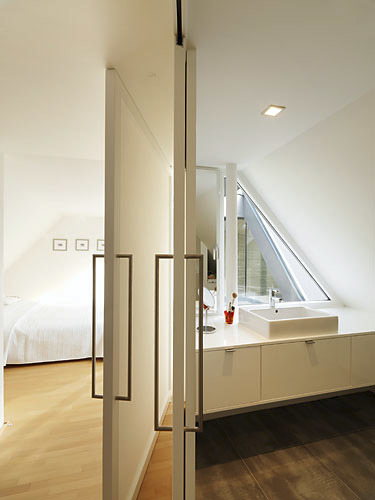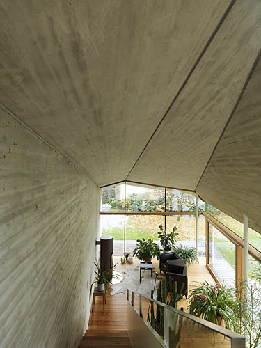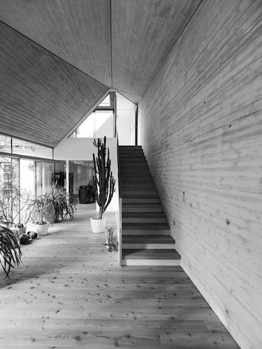 Ganz wesentlich aber ist die Treppe im Wintergarten, die innerhalb des Gebäudes neue Wege und damit eine veränderte Nutzung ermöglicht. Die Woche über bleibt Frau SH meist allein, der Wintergarten wird abgeteilt und überwiegend an den Wochenenden benutzt. Dann wird er zum Gartenzimmer mit Blickbeziehung in den Wohnraum, aber auch mit Blick hinauf, zum Atrium im Obergeschoß.