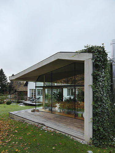 Thema des Entwurfs wird der Zubau des Wintergartens. Er nimmt die Form des vorhandenen steirischen Gegengiebels auf, verzieht ihn aber soweit, dass das gesamte Gebäude durch seinen L-förmigen Grundriss einen Gartenabschluss zur Straße bildet. Der Wintergarten öffnet sich nach Süden und über seine Längsseite nach Westen in die Tiefe des Gartens. Zur Straßenseite ist er vollkommen geschlossen und wird im Laufe der Zeit einen grünen Efeupelz bekommen.