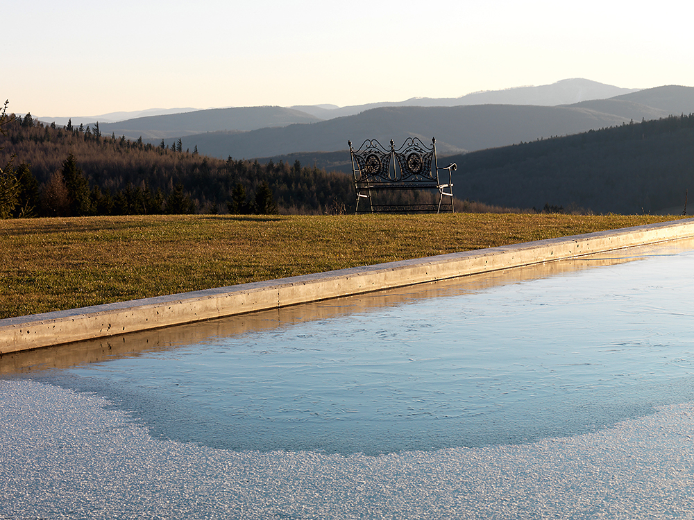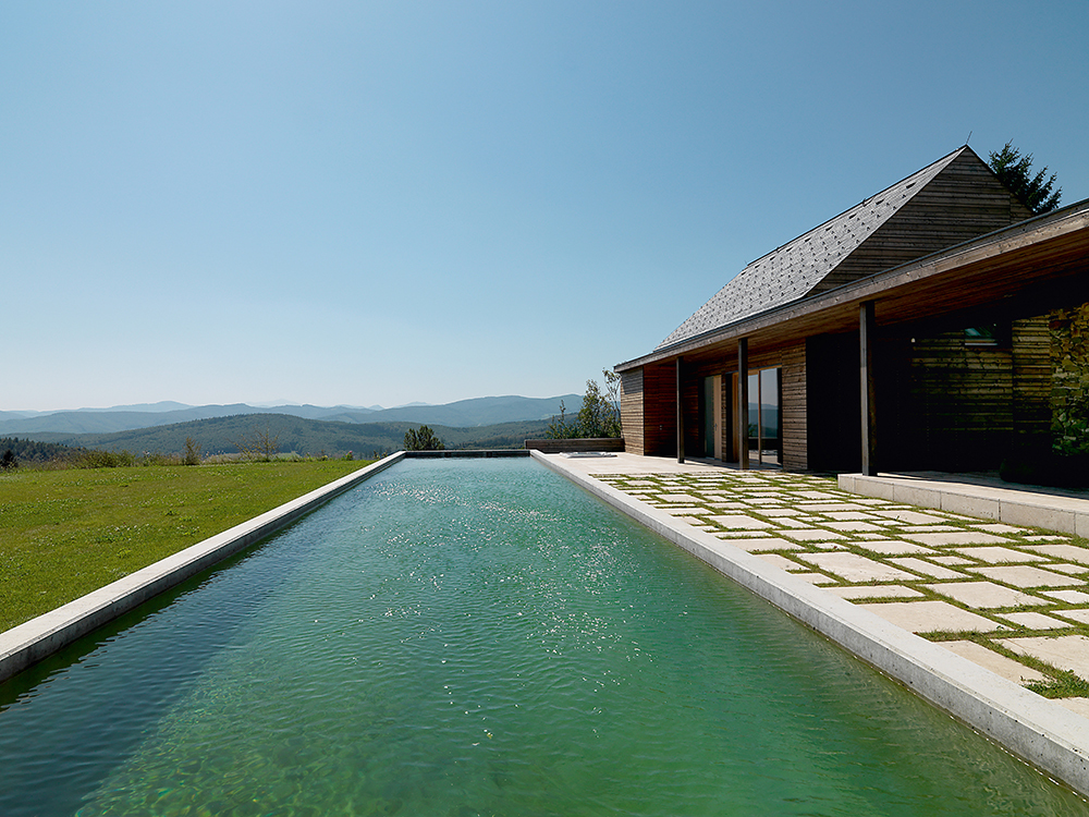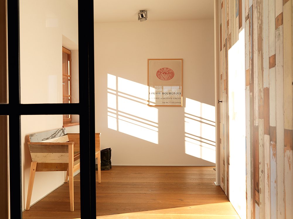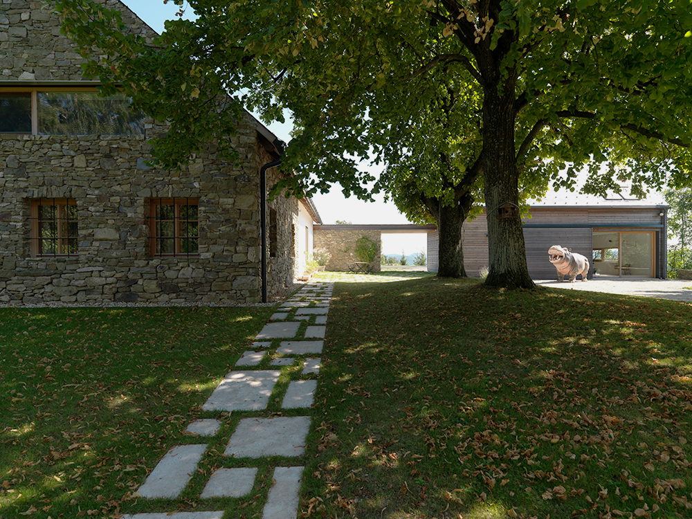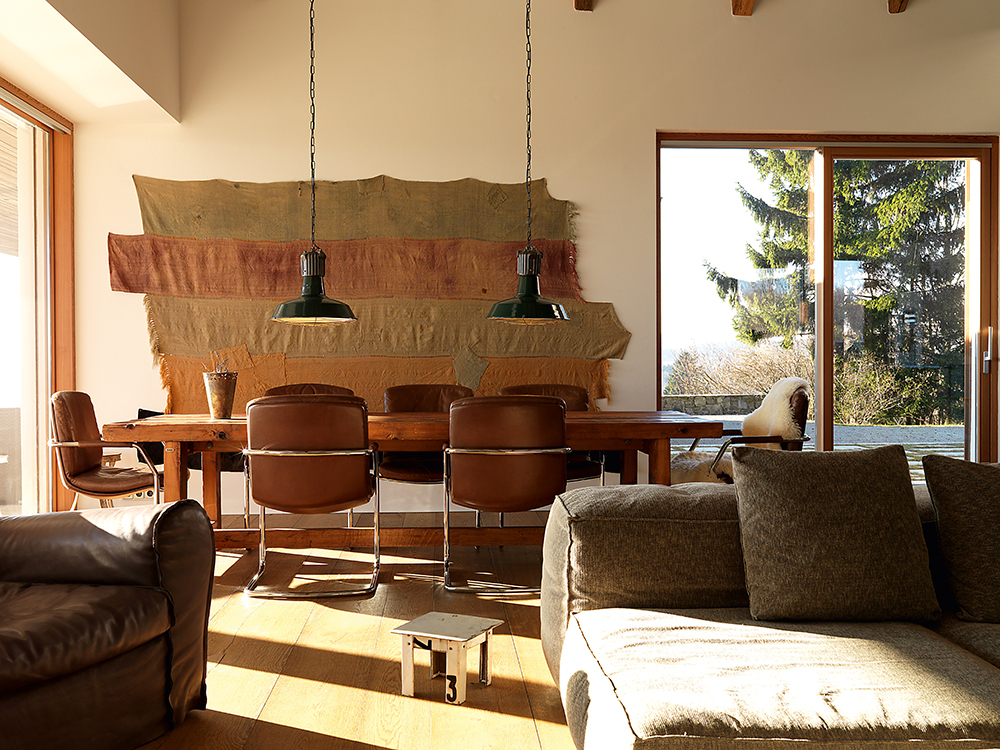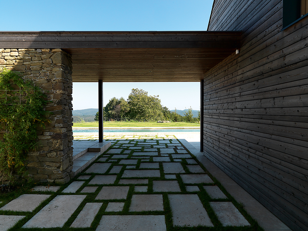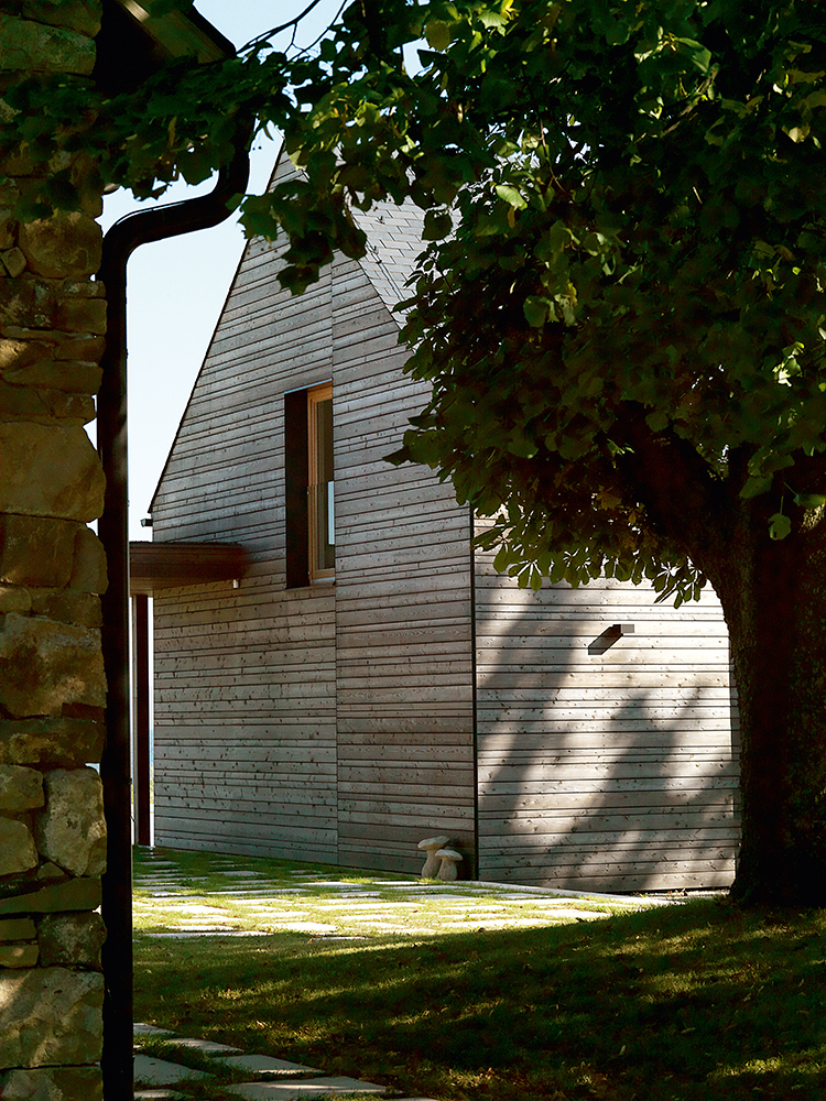 Sowohl im Äußeren als auch im Inneren besteht die Gebäudegruppe aus natürlichen Materialien: Stein, Putz und Holz. Die präzise Fügung der Materialien und die harmonische Eingliederung in die Landschaft verleihen dem Haus eine atmosphärische Vielfalt.