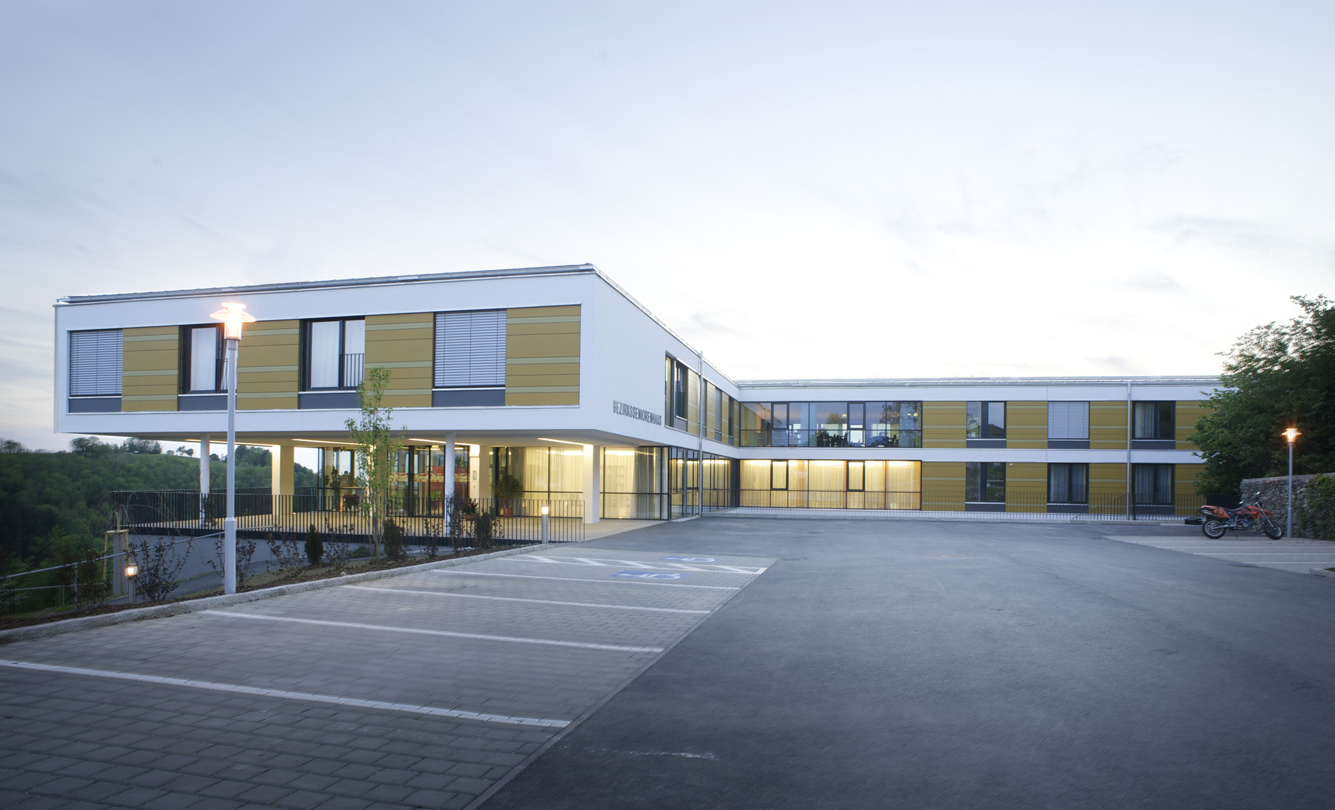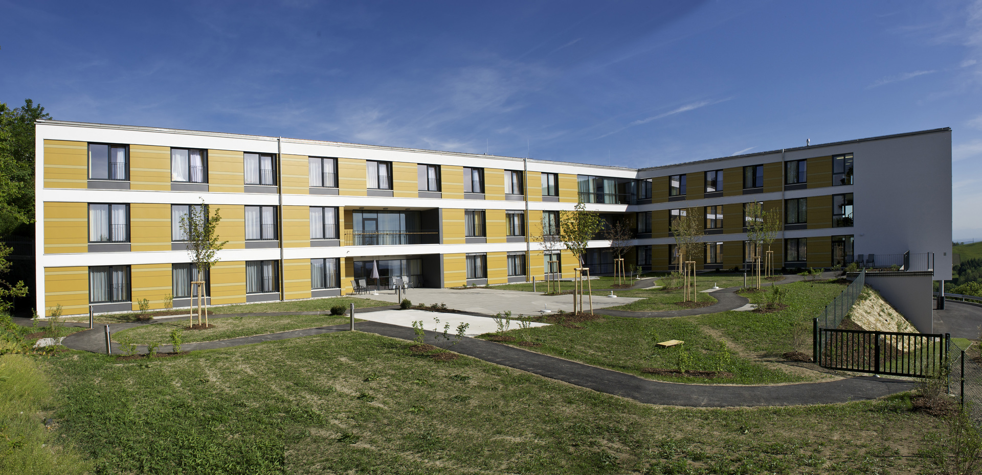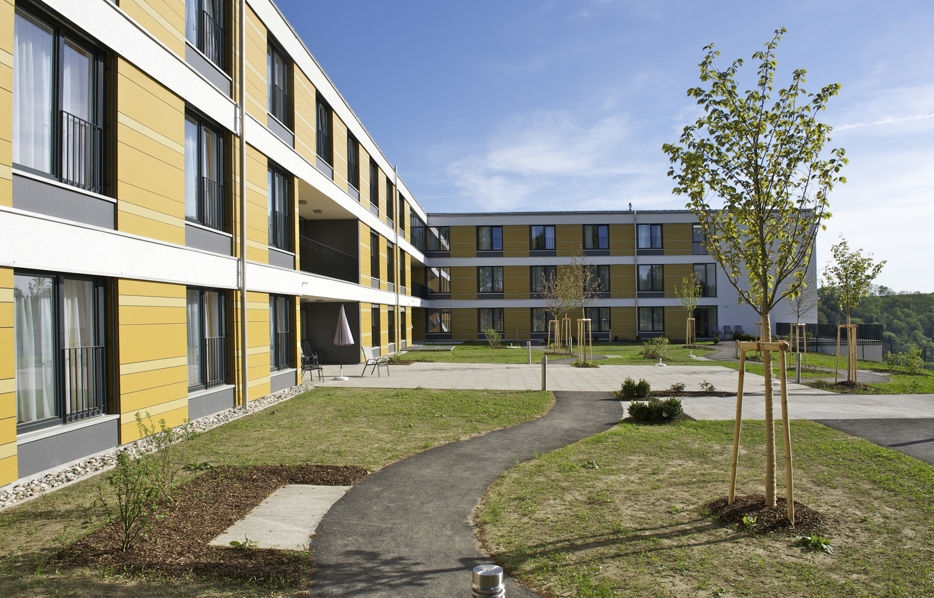 Der nördliche Hofbereich eignet sich als Dementengarten und ermöglicht unterschiedlichste Aktivitäten im Freien. Die gesamte Zulieferung und Entsorgung erfolgt über die neue Straßenverbindung im Westen ein Geschoß unter den Wohngeschossen und ist von Besuchern und Anrainern weitgehend entflochten.