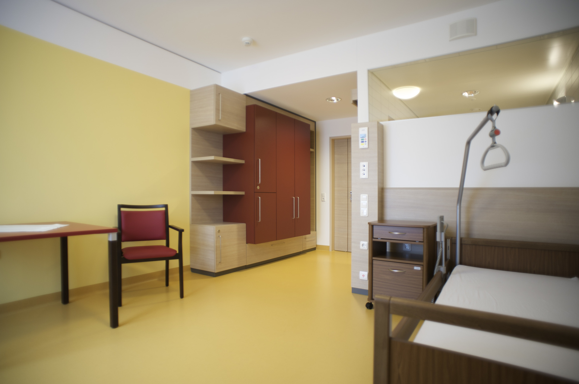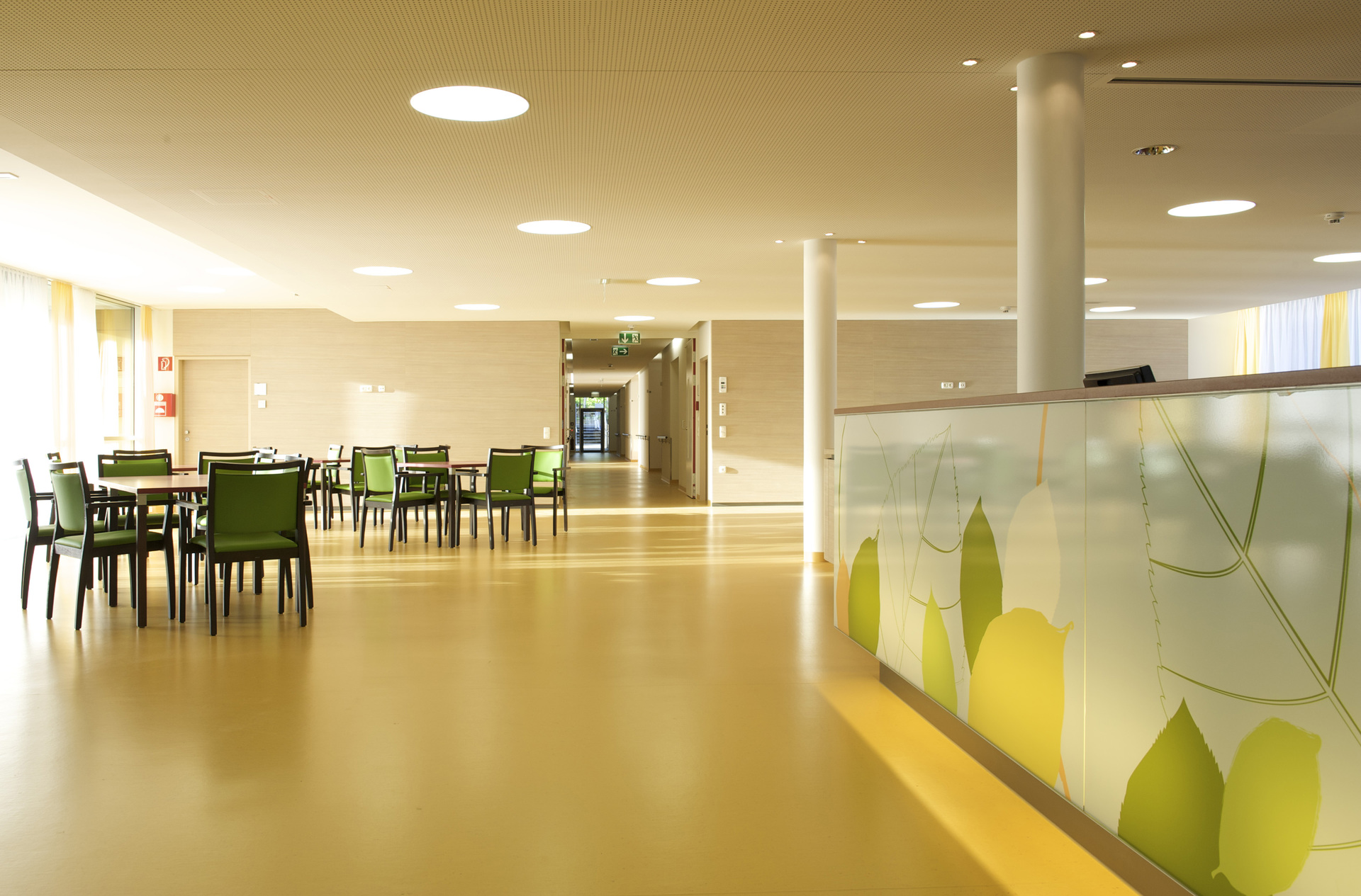 Das Altenheim verfügt über insgesamt 96 Bewohnerzimmer, die sich auf drei Wohngeschosse aufteilen. Die Bewohnergruppen arrangieren sich dabei jeweils um den zentral situierten Pflegestützpunkt und die Aufenthaltszonen. Die Gruppengrößen von jeweils 12-16 Bewohnern orientieren sich dabei an den Pflegebedürfnissen der Bewohner. Den einzelnen Gruppen sind kleinere Kommunikationsbereiche mit privatem Charakter und Loggien mit attraktiven Ausblicken direkt zugeordnet.