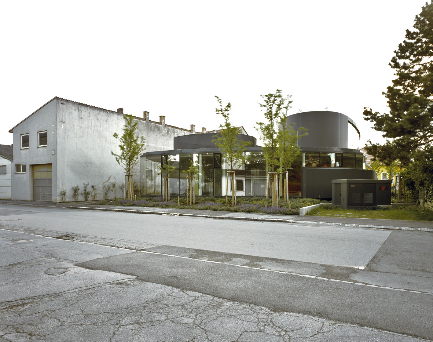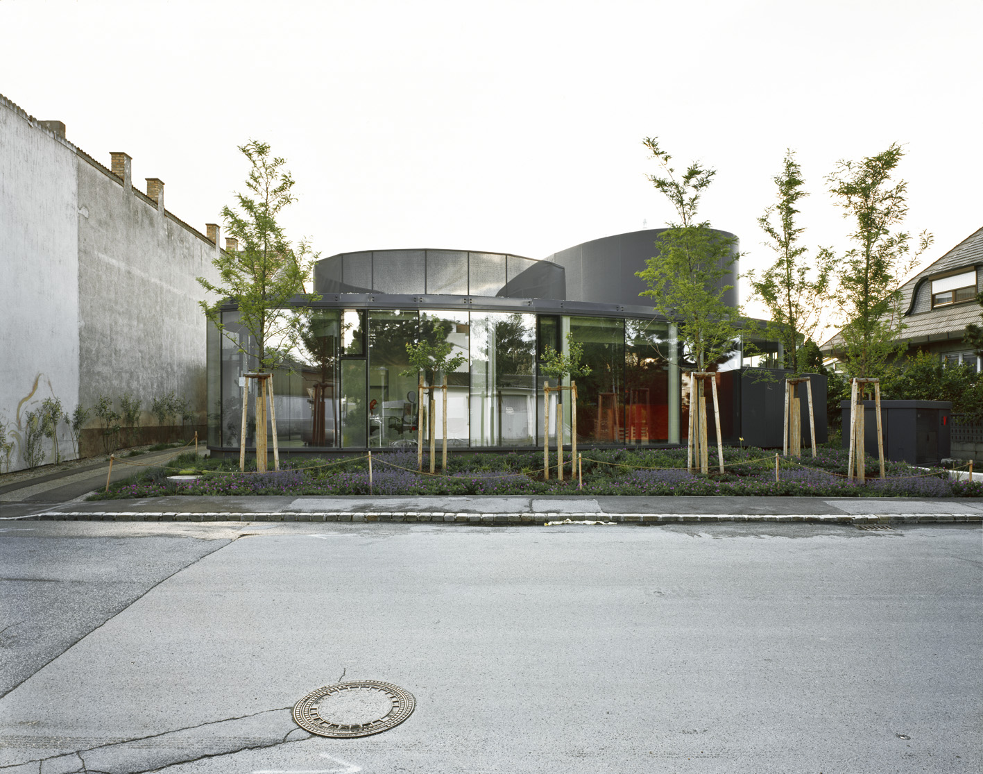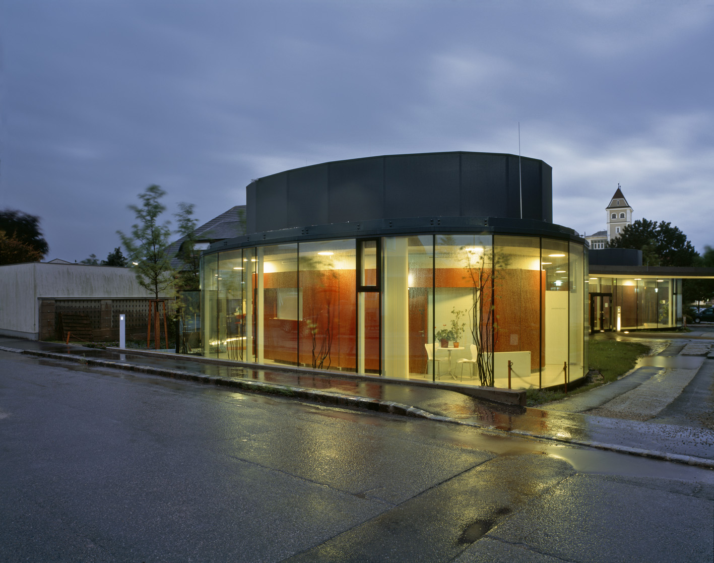 Das Gebäude ist von außen durch seine anthrazitfarbige, textile Membranverkleidung und den großformatigen, raumhohen Glasflächen sehr dezent und integriert sich zurückhaltend in die heterogene Nachbarschaft. Im Innenraum werden die eingesetzten Materialien – dort wo es die Funktionalität erlaubt – in ihrer Originalität gezeigt: Sichtbetonwände, geschliffene und versiegelte Estriche als Bodenoberfläche, Glas, textile Membrane und Holz. In den Untersuchungsräumen wurden – jeweils den gesetzlichen Vorgaben entsprechend – ableitende Böden und Zwischenwände mit Bleieinlagen ausgeführt. (Text: Architekt:innen; bearbeitet)
