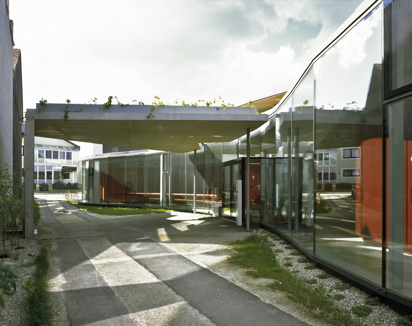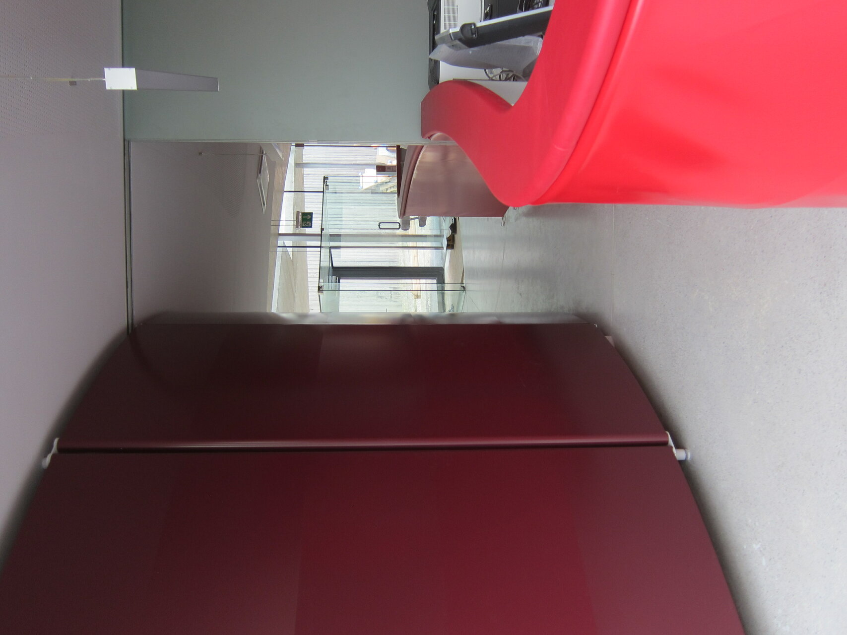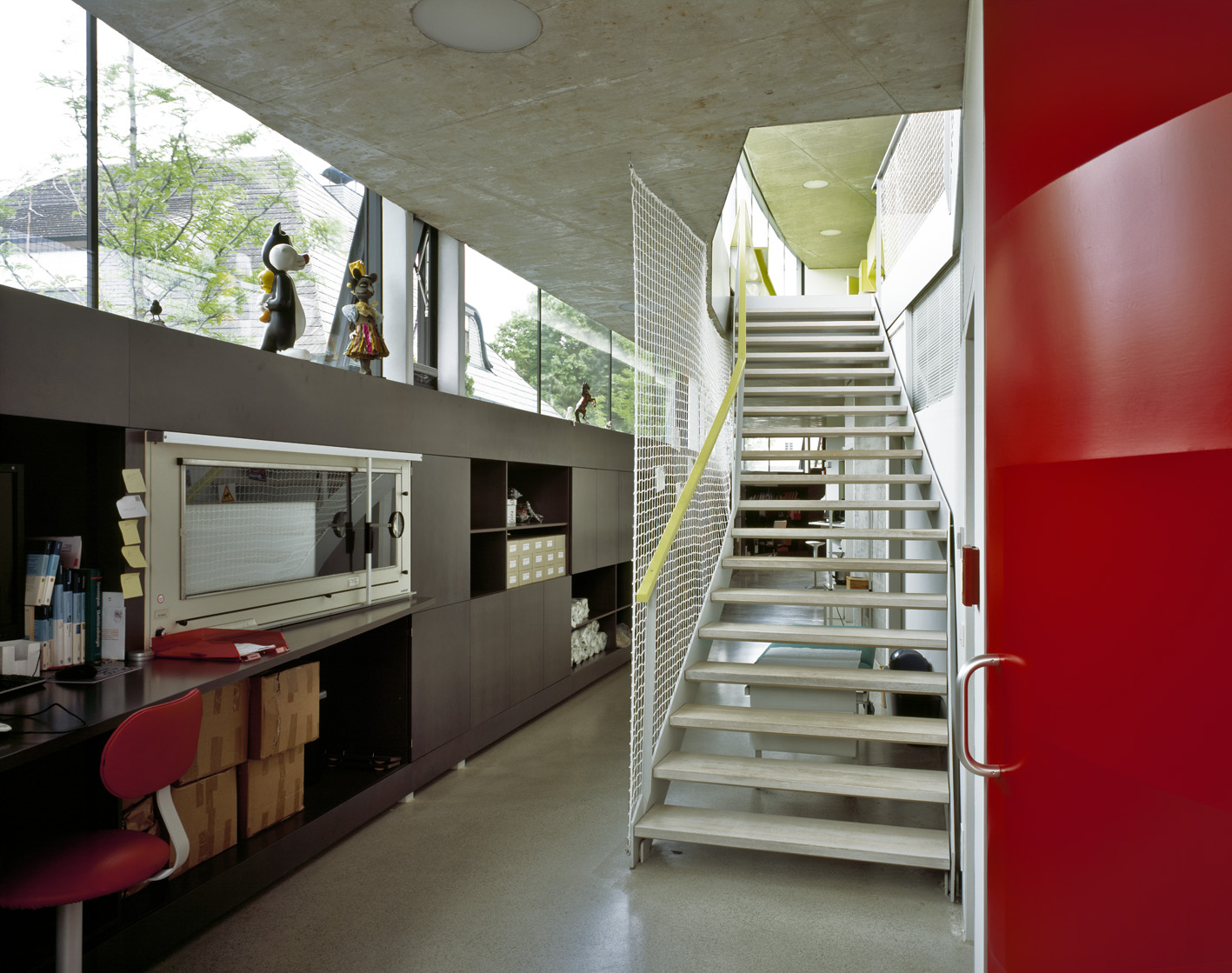 Über einen Windfang betreten die Patientinnen und Patienten den Wartebereich, im unmittelbaren Blickfeld befindet sich das Empfangspult zur Anmeldung. Das Pult wächst formal aus der größten, in der Gebäudemitte liegenden Rauminsel heraus und wurde mit einer roten Membran bespannt.