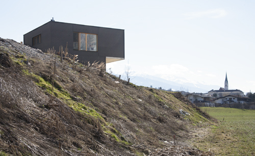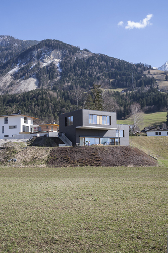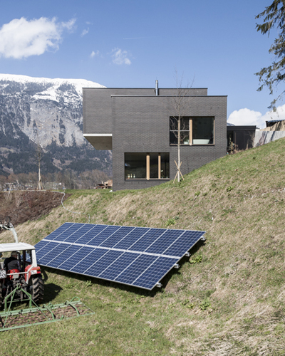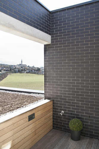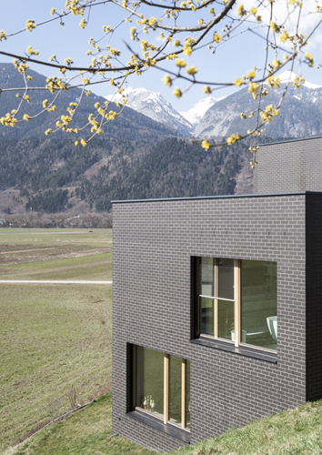 Einer nachhaltigen Herangehensweise folgend wurde die in Tirol in „Vergessenheit“ geratene Bauweise mit vorgemauerter NF-Ziegelfassade und dahinterliegender Kerndämmung mit Mineralwolle ausgeführt. Sorgfältige Planung von Lager-, Stoß- und Bewegungsfugen und die strikte Beschränkung auf ganze und halbe Steine bis hin zur Ausbildung der Fensterleibungen ohne Verschnitt erzeugen im Zusammenspiel mit den anthrazitfarbenem Klinker, dem Sichtbeton und den geölten Eichenholzoberflächen für Fenster und Türen ein elegantes und hochwertiges Erscheinungsbild. (Text: Architekten)