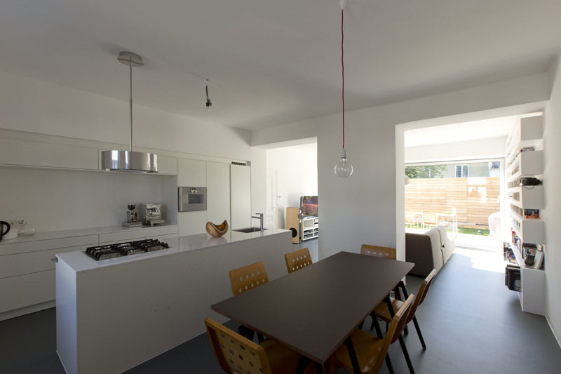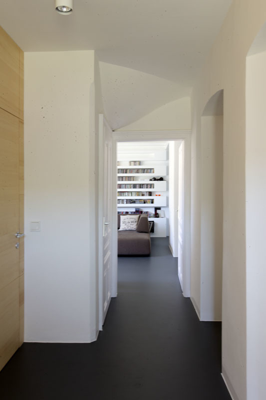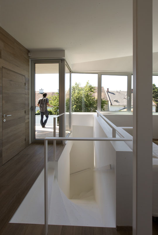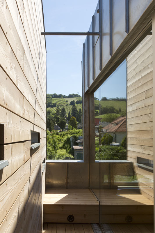 Die restlichen Teile sind in ihrem Originalzustand belassen und saniert. In Kontrast dazu wird eine neue Dachlandschaft erschaffen. Die Stahlstruktur bedingt sich aus den räumlichen Anforderungen, den Behördenregulierungen und auch als Reaktion auf die Umgebung. Durch diese gefaltete Dachform entsteht eine Verbindung von Innen- und Außenräumen. Sie beinhaltet einen weiteren Wohnbereich, den Schlafbereich und das Badezimmer. Von außen sind diese Bereiche uneinsehbar. Bewußt geführte Sichtschlitze gewährleisten spezielle Ausblicke in die umliegenden Weingärten, den Wienerwald und den eigenen Garten.