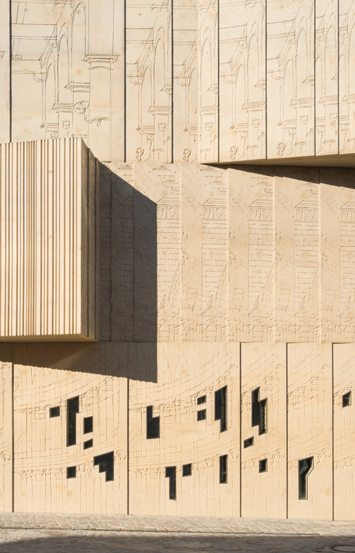 Konsequent und leidenschaftlich, wie das Museum vom ersten Anblick an erscheint, wurde die Thematik Architekturzeichnung weithin sichtbar in den Bau integriert. Als hätte jemand etwas in den Beton geritzt, sind an der Fassade Säulen, Bögen, Kapitelle und Kassettendecken zu erkennen. Es sind stark vergrößerte Ausschnitte aus einer Zeichnung des italienischen Bühnenbildners Pietro di Gotardo Gonzaga (1751-1831), der erst an der Mailänder Scala und später für den russischen Fürsten Nikolai Jussupow arbeitete. Am Prenzlauer Berg, umgeben von altem Hopfencharme und künstlerischem Flair, kommen Gonzagas Striche zu spätem, unerwartetem Ruhm.