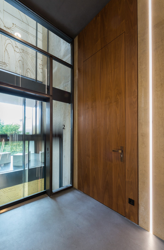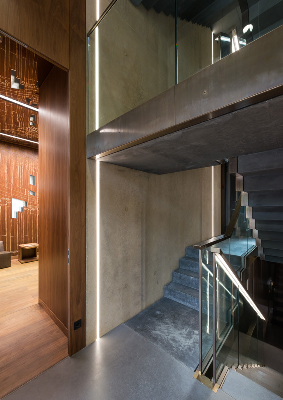 Auch hier ist der Beton eingefärbt. Die Kolorierung ist der Versuch, dem Haus einen Hauch von altem Papier, von brüchigem, vergilbtem Pergament zu verleihen. „Wir haben viele Farbproben gemacht, bis wir den richtigen Ton gefunden haben“, erklärt Projektleiter Philipp Bauer von nps tchoban voss. Während das Moskauer Büro Speech Tchoban & Kuznetsov nämlich für den Entwurf verantwortlich zeichnet, hat sich die Berliner Dependance nps um die Detailplanung gekümmert. „Für den perfekten Vintage-Touch sorgen natürliche Farbpigmente und gemahlener Stein.“