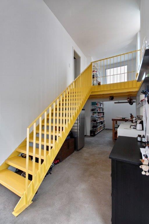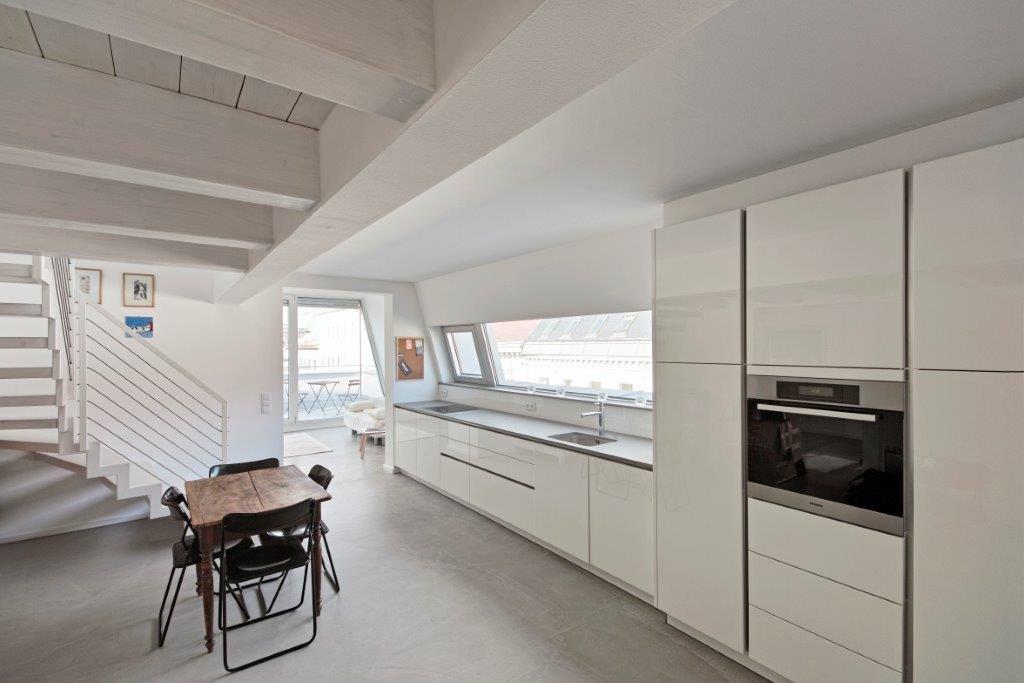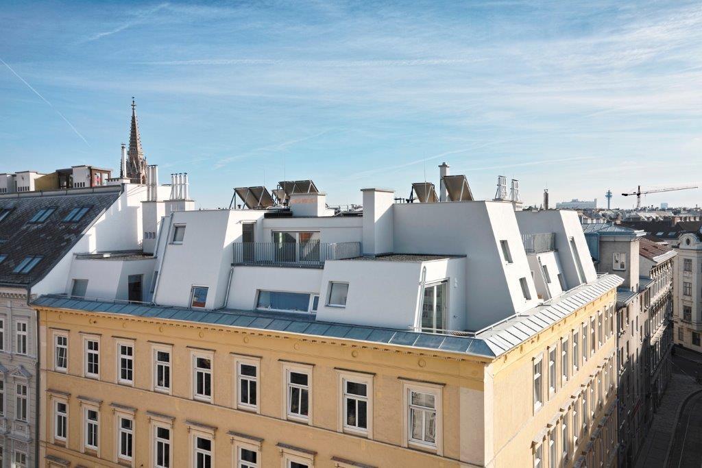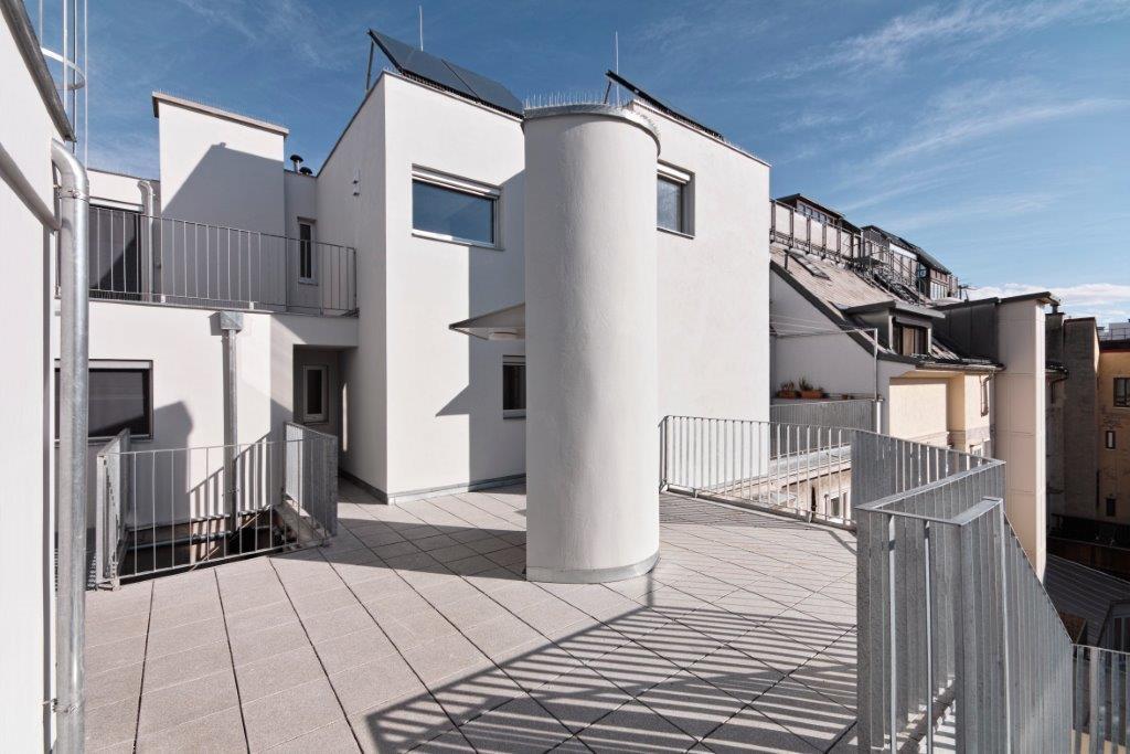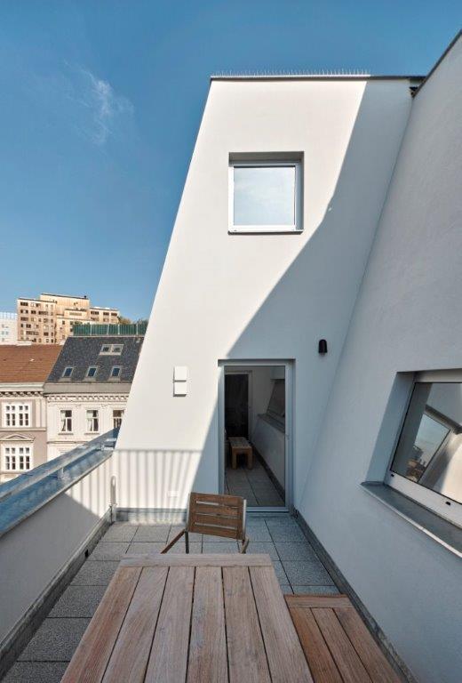 Zahlreiche Terrassen flankieren die Wohnungen. Die Außenräume dienen einerseits als Erweiterung des Wohnraums, andererseits bieten sie zusätzliche Erschließungsmöglichkeiten mit ungewohntem Bewegungsspielraum. So gelangt man z.B. von der Wohnzimmerterrasse der Bauherrenwohnung ums Eck, vorbei an Schornsteinen, direkt zur nächsten Terrasse, die wiederum der Küche vorgelagert ist. Man betritt hier sprichwörtlich neues Terrain, bildlich gesprochen einen Fuchsbau in luftiger Höhe. Der Bauherr musste zahlreiche Runden mit den Behörden aussitzen, ehe der Entwurf für den Dachausbau in der Schutzzone genehmigt werden konnte. So mussten die ursprünglich vertikal geplanten straßenseitigen Wände geneigt werden, damit dem geforderten Straßenbild entsprochen wird. Einheitliche Oberflächen (Putz) gewährleisten die für die Schutzzone geforderte homogene äußere Erscheinung und lassen die Körper miteinander verschmelzen.