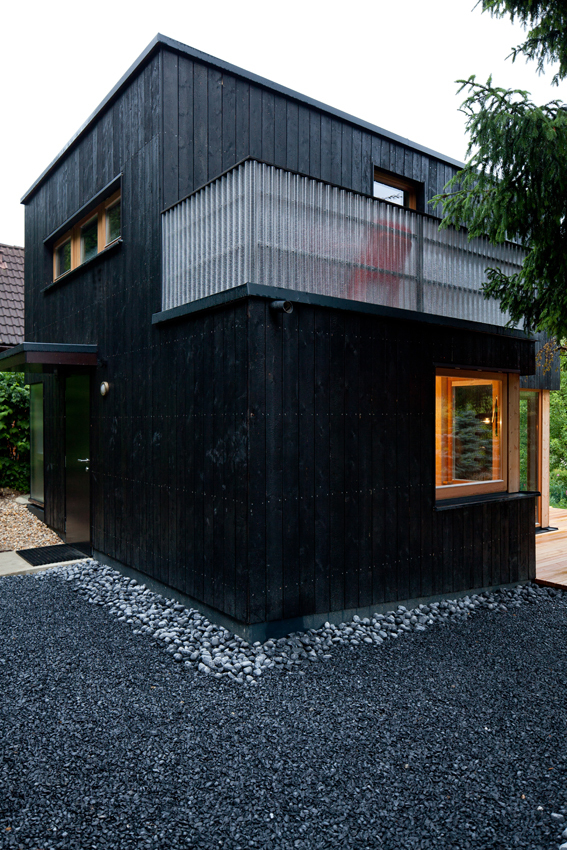 Ursprünglich wollte der Bauherr ein Sommerhaus aus den 20er Jahren kaufen. Als aus dem Vorhaben nichts wurde, entschloss sich der Bauherr statt dessen, auf einem Hanggrundstück in der Kleingartensiedlung Michaelawiese am Rande des Wienerwaldes ein neues Haus zu bauen. Der Neubau sollte ruhig ein wenig schräg daherkommen, konnte gebastelt und gewachsen erscheinen. Auf den Stempel der Hochglanzarchitektur verzichtete der freiberufliche Grafiker, der das Haus vor allem während der Sommermonate gemeinsam mit der Tochter bewohnt.Entstanden ist ein reduzierter, schwarzer Kubus, der dem bunten Formengewitter der umgebenden Kleingartensiedlung entgegensteht. Ein Nebengebäude schirmt das Häuschen von der angrenzenden Straße ab, die von vielen Spaziergängern genutzt wird. Es gleicht einem langen, begehbaren Schrank und bildet zum Haus hin einen intimen Vorplatz. Die zurückgenommene Formgebung des Hauses unterstreicht das ungewöhnliche Fassadenmaterial: verkohlte Lärchenholzbretter. Diese alte Technik wurde in vergangenen Jahrhunderten vor allem in Japan und Finnland angewendet, um das Holz vor Witterungseinflüssen zu schützen. Je nach Lichteinfall changiert die Farbe von Matt-Schwarz bis Silber.