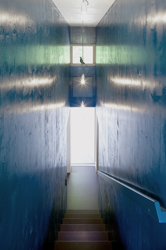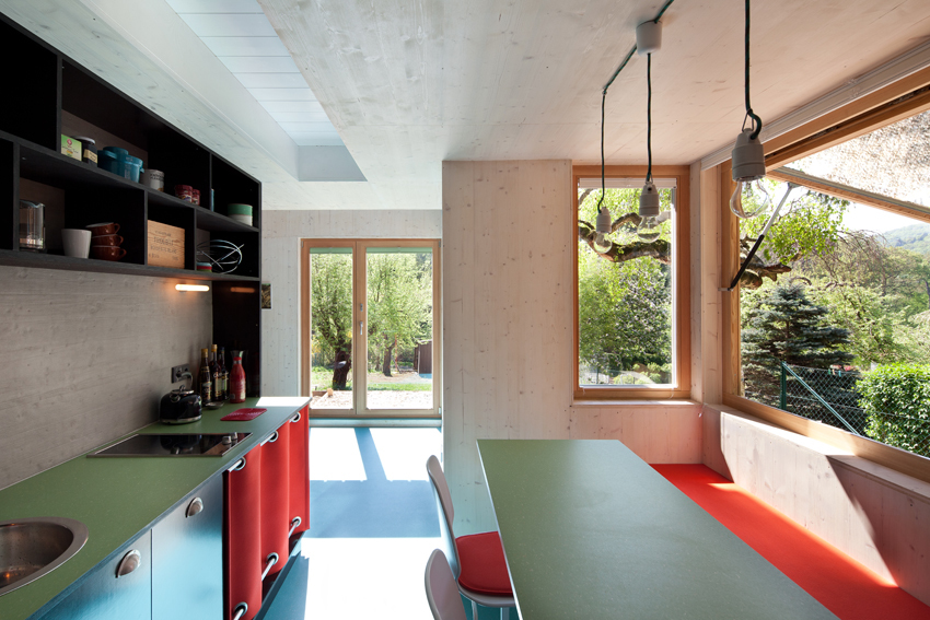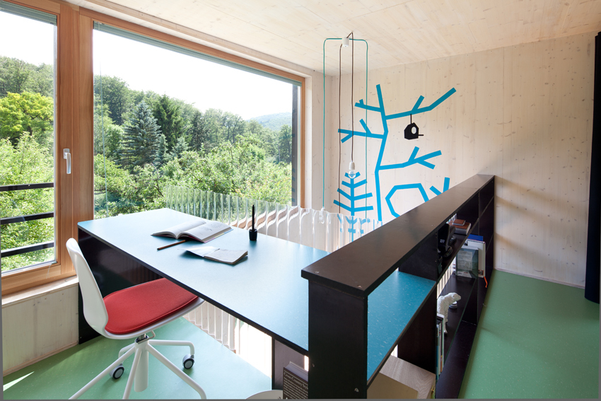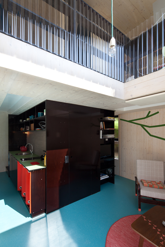 Der schwarze Kubus außen steht im Gegensatz zu den hellen, bunten Innenräumen, wobei sich die Bunttöne auf die Einbauten beschränken, die Außenwände sind zurückhaltend, in weiß lasierten 2-Schichtplatten aus Fichte ausgeführt. In der Mitte des Hauses befindet sich nahezu ausgeblendet und darum umso überraschender das 2-geschossige, dunkelblaue Stiegenhaus. Bei der Materialauswahl wurde großes Augenmerk auf Haptik und Struktur gelegt: Linoleum für Boden und Tischbeläge, Filz als Schrankvorhang, Siebdruckplatten für den Kern, Kunststoffwellplatten als Galerie- und Balkongeländer, an den Wänden 2-Schichtplatten aus Fichte weiß lasiert.