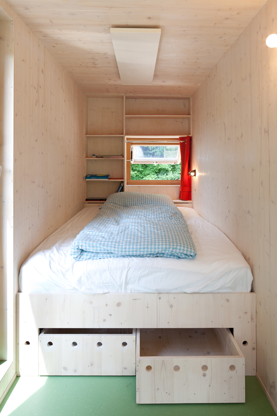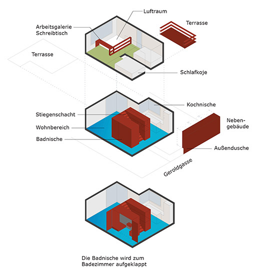 Um alle Anforderungen unterzubringen, sind viele Möbel mit zwei Nutzungen versehen: eine in den Kern eingebaute Badnische, die durch Klappen und Schieben zweier raumhoher Türen die Gangfläche mitbenützt und so erst zu einem richtigen Raum mit natürlicher Belichtung wird. Der Esstisch dient auch als Küchenarbeitsplatte, gesessen wird auf einem offenen Regal. Der Raum unter den Betten wird durch große Bettladen genutzt. Die Stiege ist gleichzeitig auch Schuhregal, das Geländer zum Luftraum hin ist als Bücherregal ausgebildet.