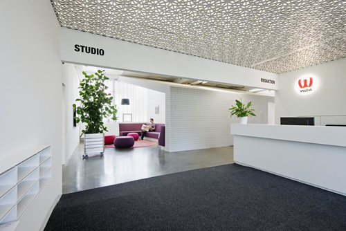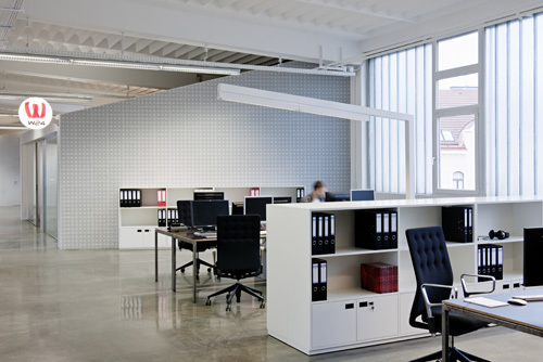 So schön offene Räume anzusehen sind, ganz ohne Stauraum für die weniger ansehnlichen Dinge im Büroalltag wird man auf Dauer nicht glücklich. Für die Redaktion wurde eine raffinierte Lösung entwickelt: Der Stauraum ist solcherart in die Boxen integriert, dass er weder von außen noch von innen erkennbar bzw. ablesebar ist. Der Grundriss entschlüsselt das „Geheimnis“ der Boxen: vermeintlich rechtwinkelige verfügen sie über stumpfe Winkel. Hinter diesen „Extragraden“ verbirgt sich das erweiterte Stauraumangebot. (Text: Martina Frühwirth nach einem Text der Architekten)