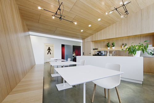 Der Dorfplatz ist der Ort für Teambesprechungen. An runden Arbeitstischen finden Redaktionssitzungen statt. Mitarbeiter begegnen sich hier zu informellen Besprechungen „en passent“. Für die Auszeit in der Arbeit wurde für die Teeküche ein eigenes Haus reserviert, welches als einziges zur Gänze mit Holz verkleidet ist. Das Holz verleiht dem Pausenraum eine gewisse Wohnlichkeit und stattet es mit einem Entschleunigungsmoment aus – ideal zum Auftanken.