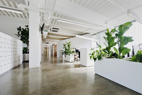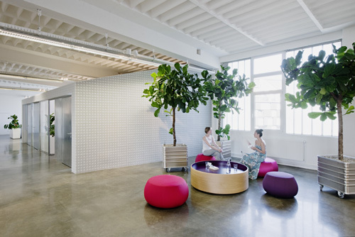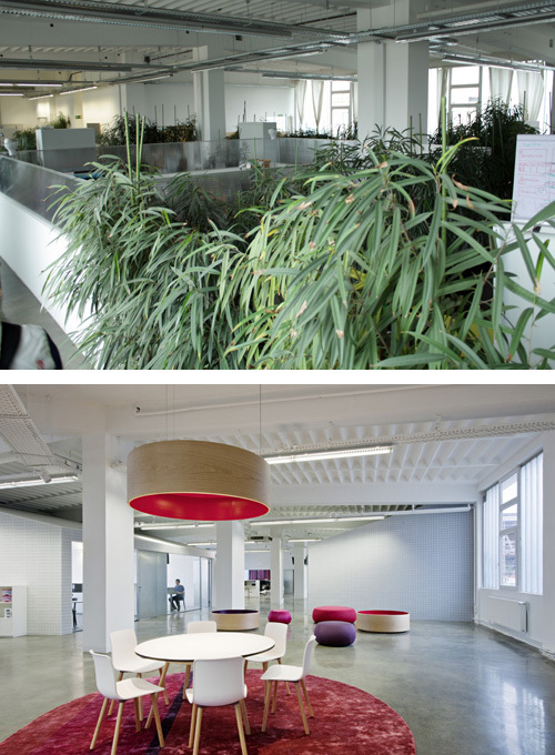 Einzelne Einbauten – die Architekten nennen sie „Häuser“ – strukturieren das Loft in übersichtliche Einheiten und gliedern den zentralen „Dorfplatz“. Für die Außenhaut der Boxen wählten die Architekten „Bergo Flooring“. Das Material wird in der Regel auf Schiffdecks als Bodenauflage verwendet. Im Loft verleiht es den „Häusern“ Struktur. Die Buchhaltung sowie der Vertrieb und die Geschäftsführung finden hier ihr zu Hause. Auch für konzentrierte konzeptionelle Textarbeit und ungestörte Telefonate stehen die „Häuser“ dem Team offen. Arbeitsinseln für einzelne Abteilungen ergänzen das Raumangebot. Sondergefertigte Leuchten bilden eine subtile Klammer für die unterschiedlichen Aufgabenbereiche.