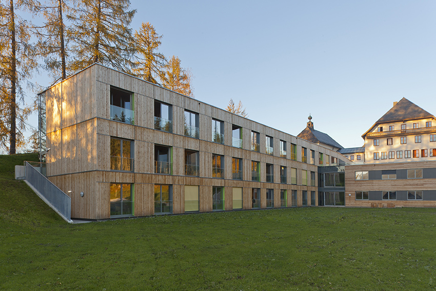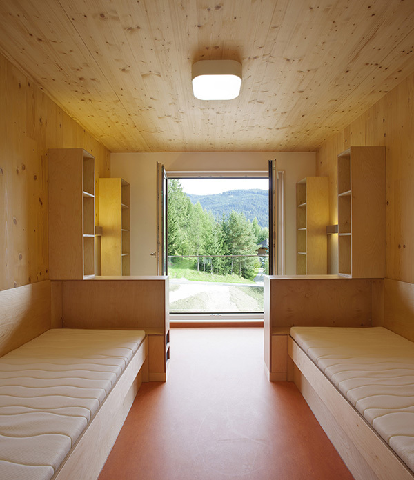Die Kuben der Zimmer wurden als Holzbau ausgeführt und werden entlang der einhüftigen Erschließung von einer schützenden Betonschale vom anliegenden Hang getrennt - eine zeitgemäße Interpretation der traditionellen Kombination Holzbau - Massivbau. Feingliedrige Holzfassaden fügen sich in gedeckter Farbe in die Landschaft ein, die „5. Fassade“ – die Ebene Dach wird begrünt.