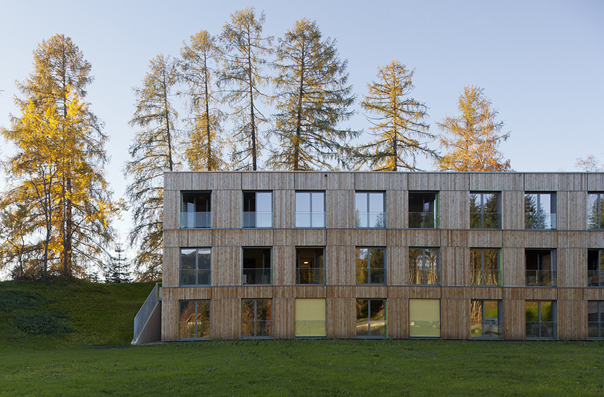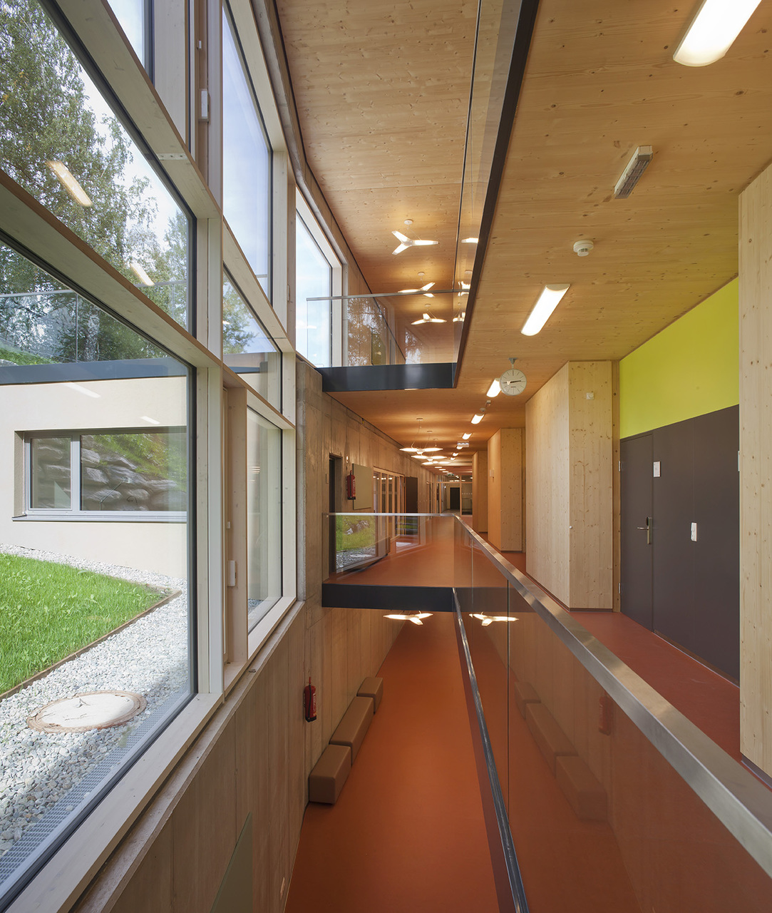 Wesentlicher Teil des gestalterischen Konzepts ist es, den konstruktiven Holzbau (Wände und Decken) in Sichtqualität zu zeigen und somit atmosphärisch in den Innenräumen wirken zu lassen. Dazu war eine detaillierte Abstimmung von Brand-, Schallschutz und Statik erforderlich, auch die Einbindung in die Landschaft, die ermöglicht, dass in jedem Geschoss mindestens zwei voneinander unabhängige Fluchtwege direkt ins Freie führen, ergibt so brandschutztechnische Synergien.
