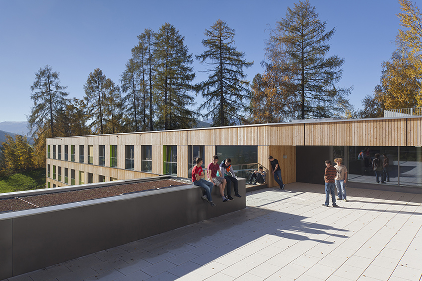 Über der abgesenkten Turnhalle entstand ein großzügiger Vorplatz mit Aussicht auf Tamsweg und bietet eine neue Kommunikationsfläche für die gesamte Schule.