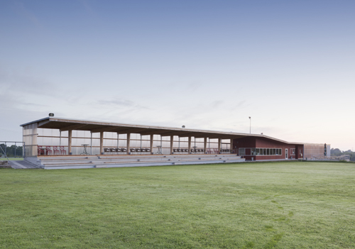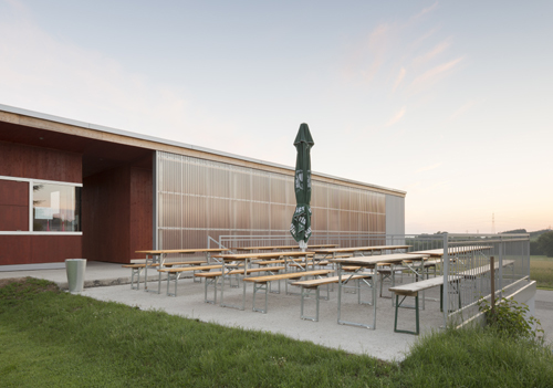 Die Tribüne und die Räumlichkeiten sind unter einer gemeinsamen, transluzenten Wand- und Dachlandschaft (errichtet in Stahl und Holz, verkleidet mit Polycarbonatwellplatten) zusammengefasst und für 150 Sitzplätze konzipiert. Entsprechend den unterschiedlichen Anforderungen an die Höhe der Überdachung, knickt diese im Bereich der Ausschank und schließt an den bestehenden und sanierten Baukörper der Kabinen an. Die WC´s die bisher im Untergeschoß des Klubhauses untergebracht waren, wurden auf die Zugangsebene verlegt.