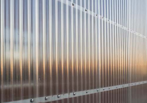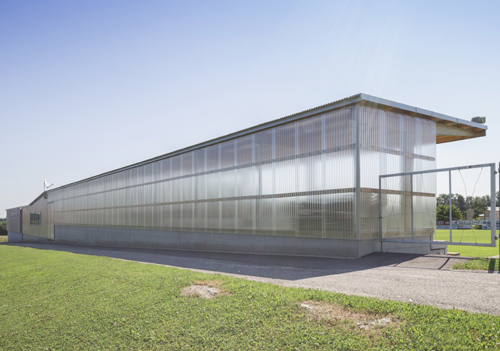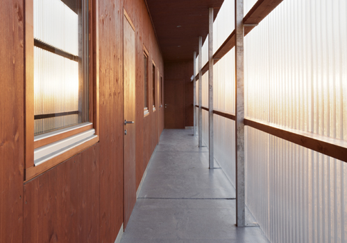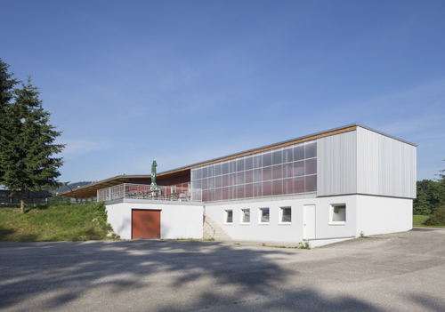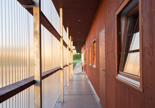 Einfache Mittel, wie die transluzente Wandverkleidungen in Kombination mit den rot gestrichenen Holztragelementen sowie der geschwungenen Dachlandschaft, machen dieses Gebäude zu einem weithin sichtbaren Identifikationszeichen.