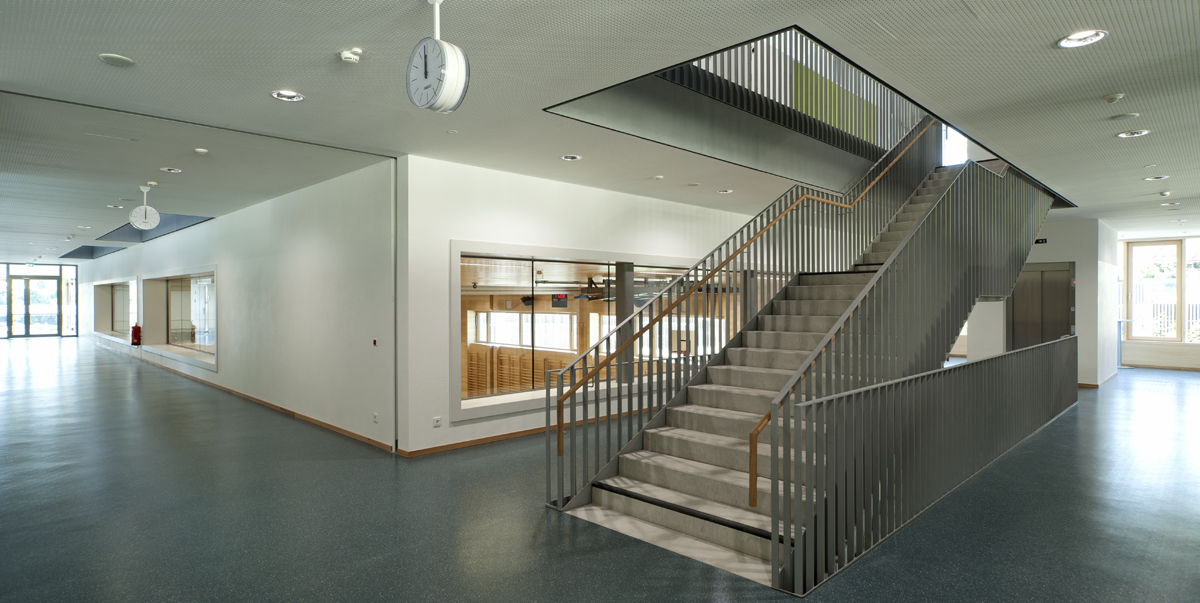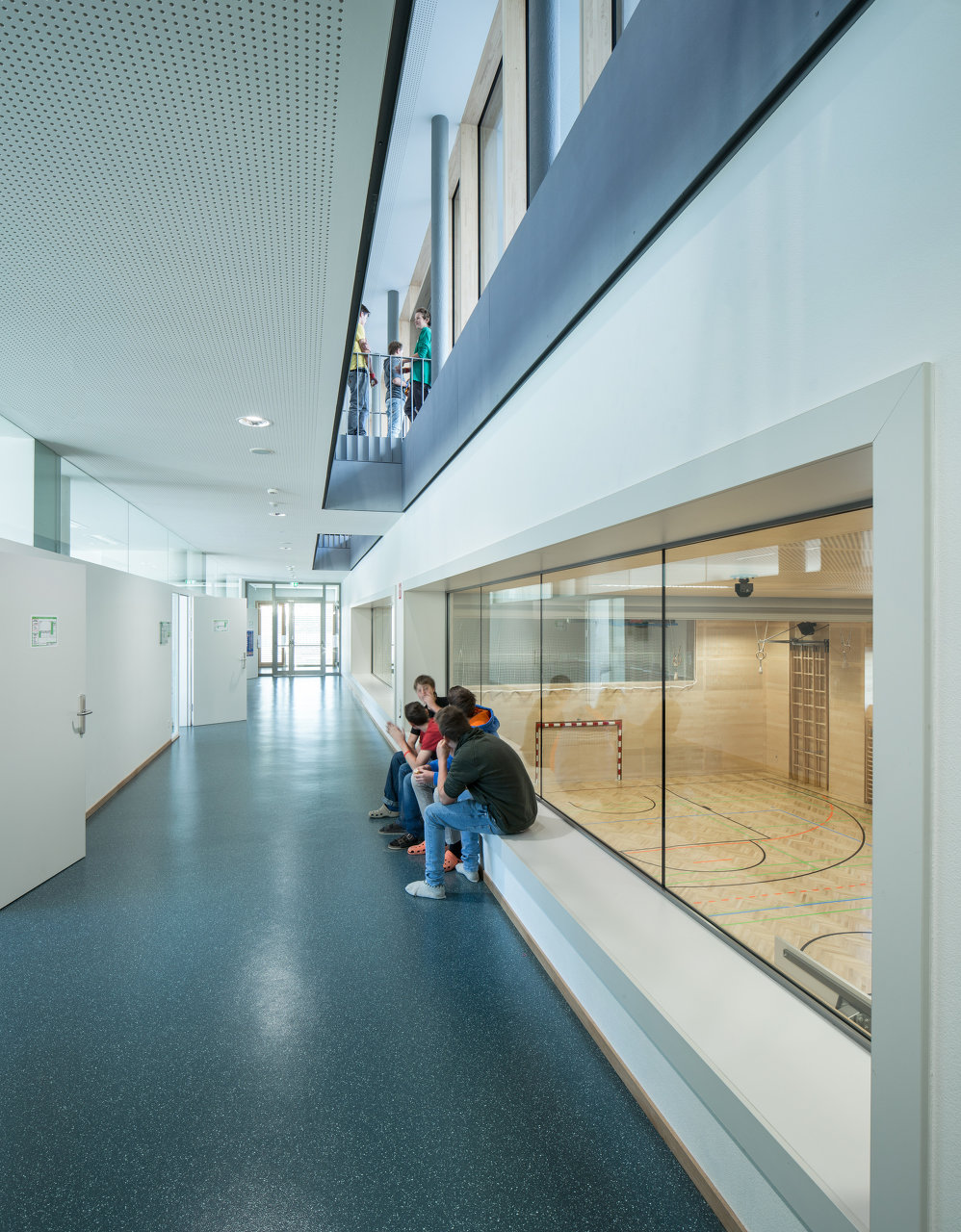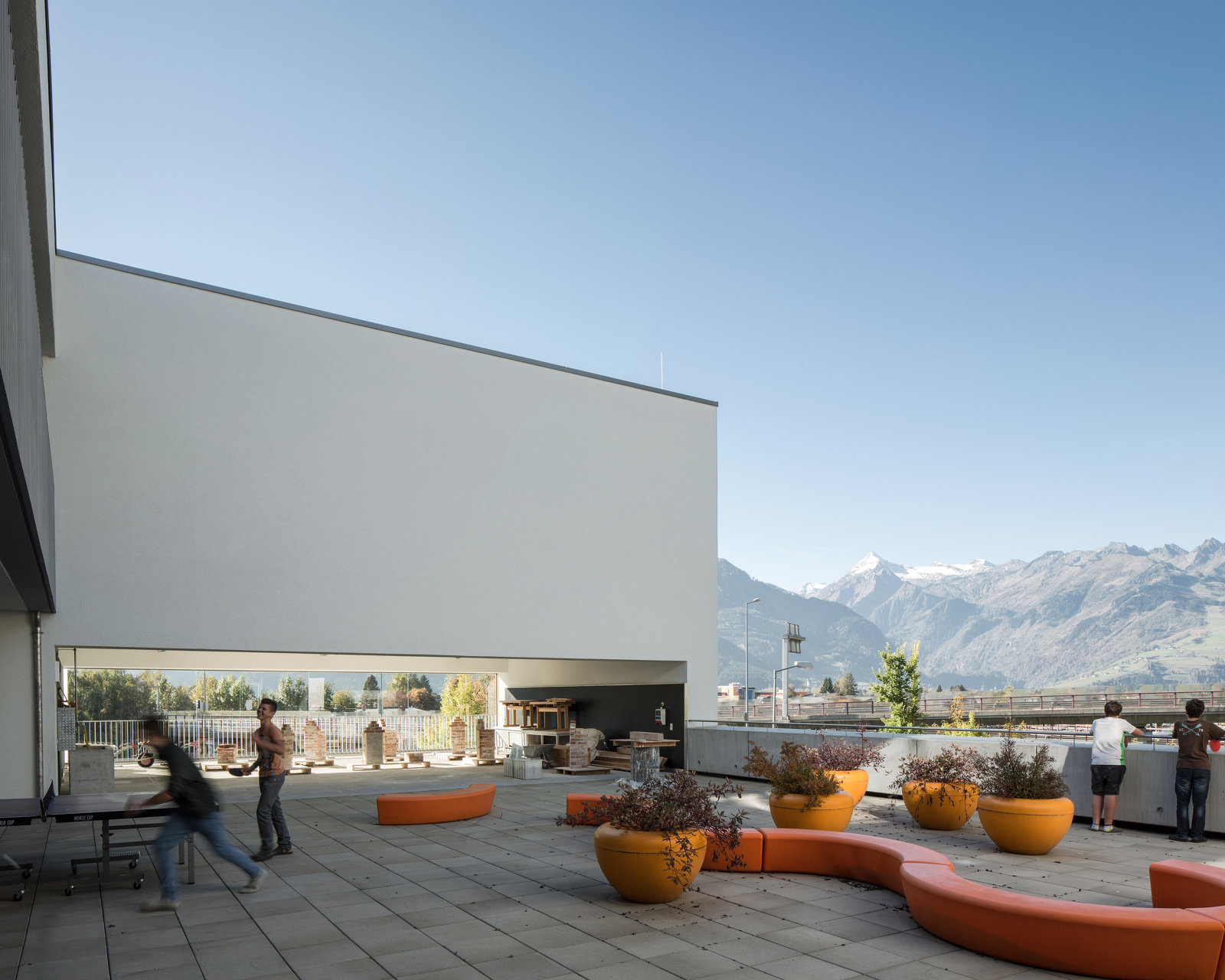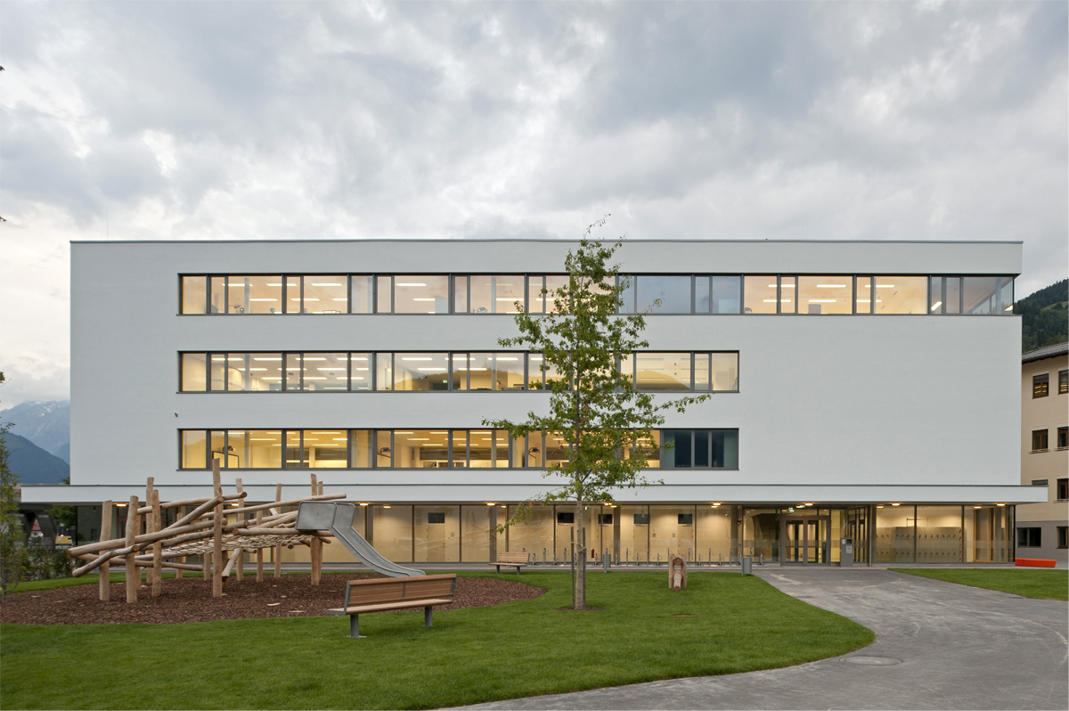 Zell am See ist ein beliebter und stark frequentierter Wintersport-Urlaubsort im ländlichen Salzburg. Bekannt ist der Ort auch für seine Architektur, die alpine Vorbilder mehr schlecht als recht in neue Funktionen und Volumen zwängt. Umso erstaunlicher ist es hier einen derart schlichten, die städtebauliche Situation beruhigenden Baukörper vorzufinden. Das Schulensemble aus Volksschule und Kindergarten wird gefasst und vor der stark befahrenen Bundesstraße geschützt. Besondere Qualität entwickelt der kleine Schulhof auf dem Dach der Turnhalle. Diese Hofsituation ist auch der einzige Einschnitt in dem ansonsten sehr kompakten Baukörper. Passivhausstandard, Qualität der Materialien im Innenausbau und hohe Ansprüche an die Innenraumluftqualität erfüllen moderne Komfortanforderungen, wie sie im Schulbau wünschenswert wären. Nachhaltigkeit wird aber nicht nur in energetischer Weise oder bei der Baustoffökologie gelebt: Statt teure neue Schulmöbel zu kaufen, werden die bestehenden Pulte und Stühle aus dem alten Provisorium einfach weitergenutzt. (Jurytext Staatspreis Architektur & Nachhaltigkeit 2014)