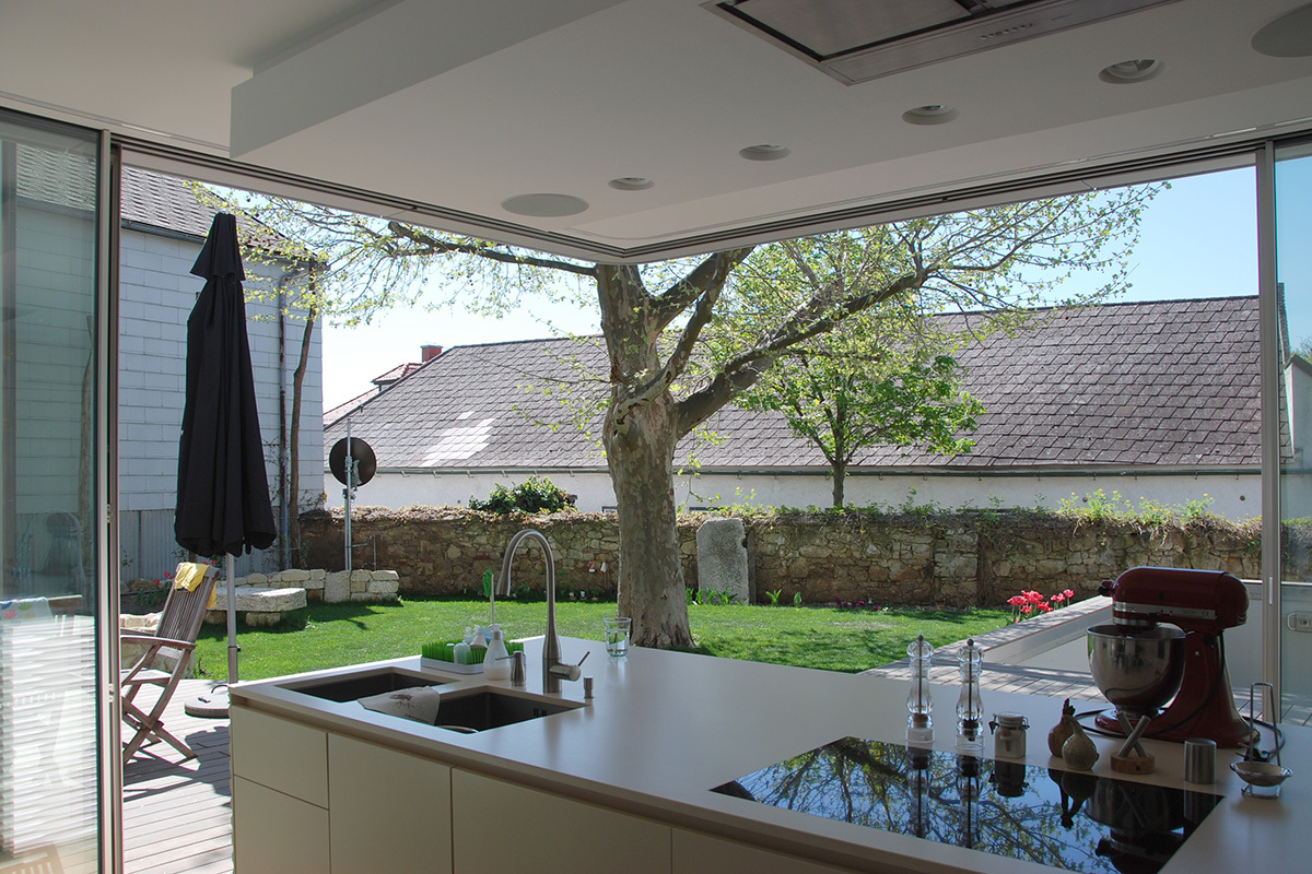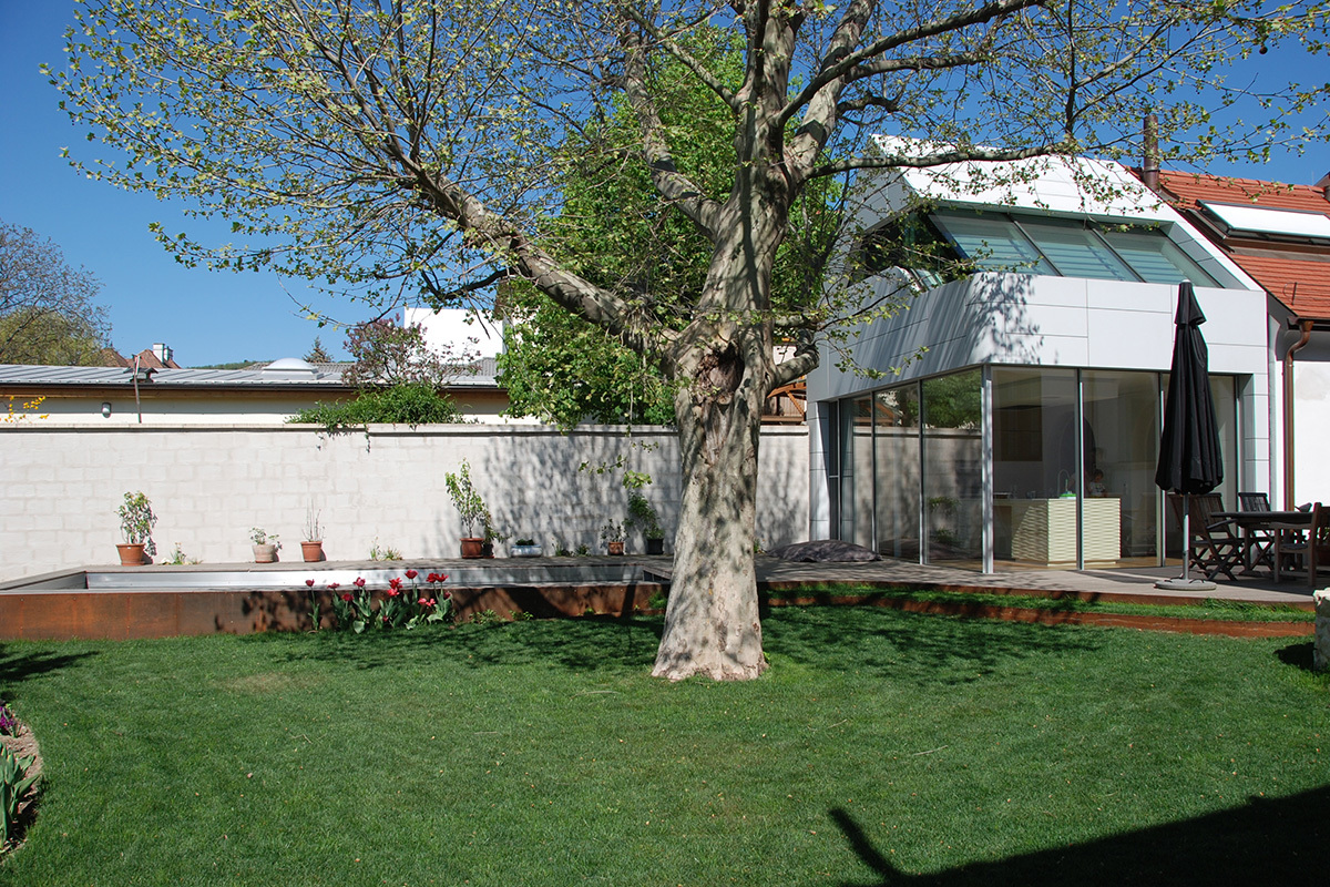 Dem nicht unterkellerten Trakt ist gartenseitig ein zwei geschossiger Zubau angeschlossen. Der Baukörper ist traditionell, das Erscheinungsbild modern. Wand- und Dachflächen sind mit glasfaserverstärkten Fassadenplatten verkleidet. Präzise geschnittene Tür- und Fensteröffnungen lassen Innen und Außen in ein spannungsgeladenes Wechselspiel gegenüber treten. (Text:Architekt)