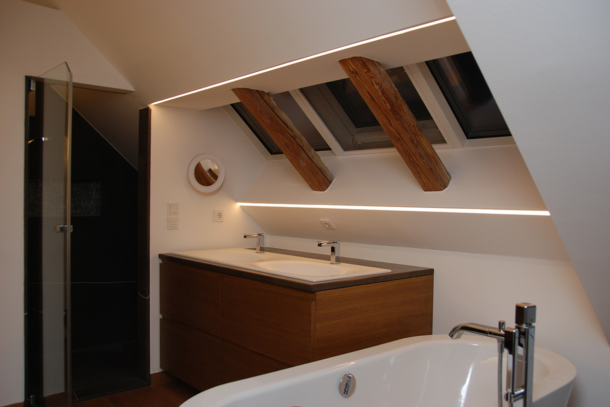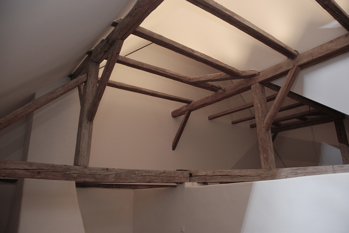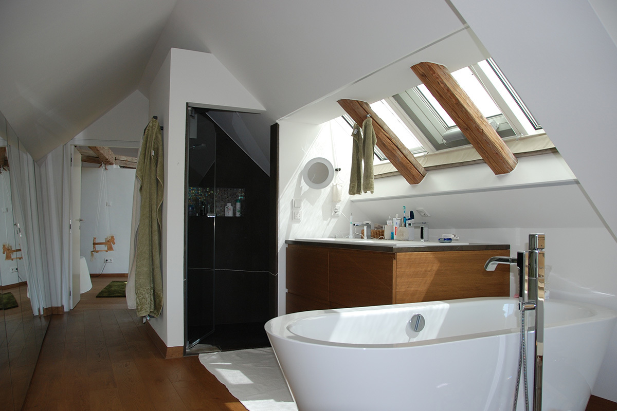 Beim Dachgeschoßausbau gilt dem Erhalt von Charakteristik, Ästhetik und Funktion des historischen Holzdachstuhls besonderes Augenmerk. Daher wird das Hauptgespärre sichtbar belassen und der Straßentrakt als fließender, offener Wohnraum konzipiert an den Bäder und Schlafräume anschließen. Die Belichtung erfolgt gartenseitig über großformatige Dachflächenfenster.