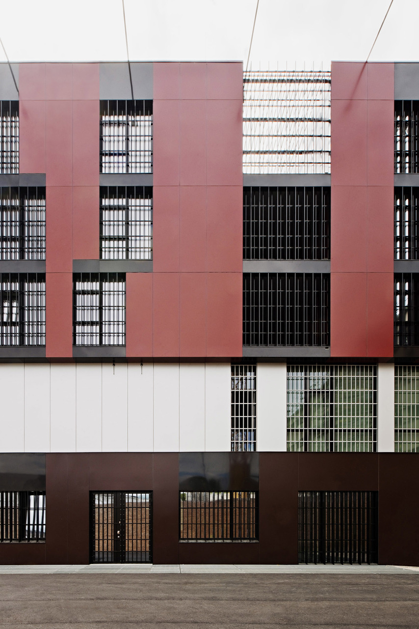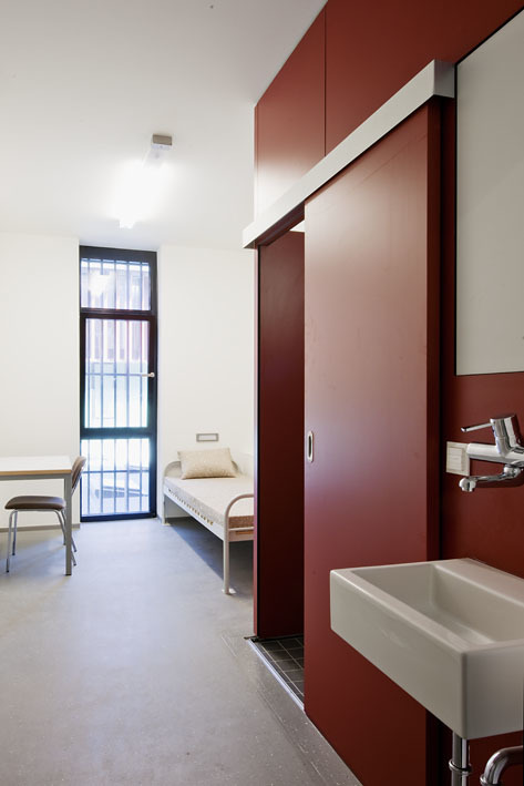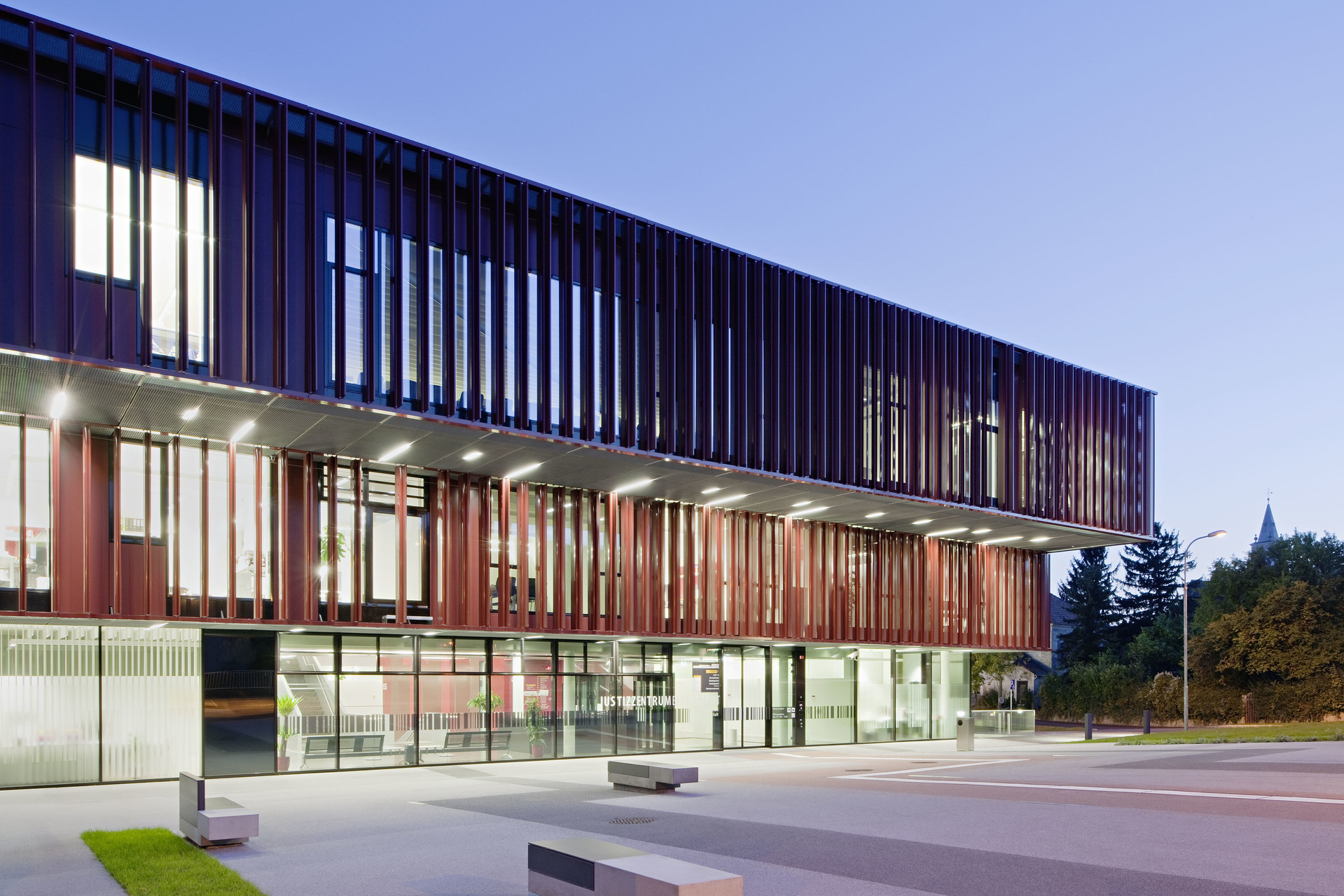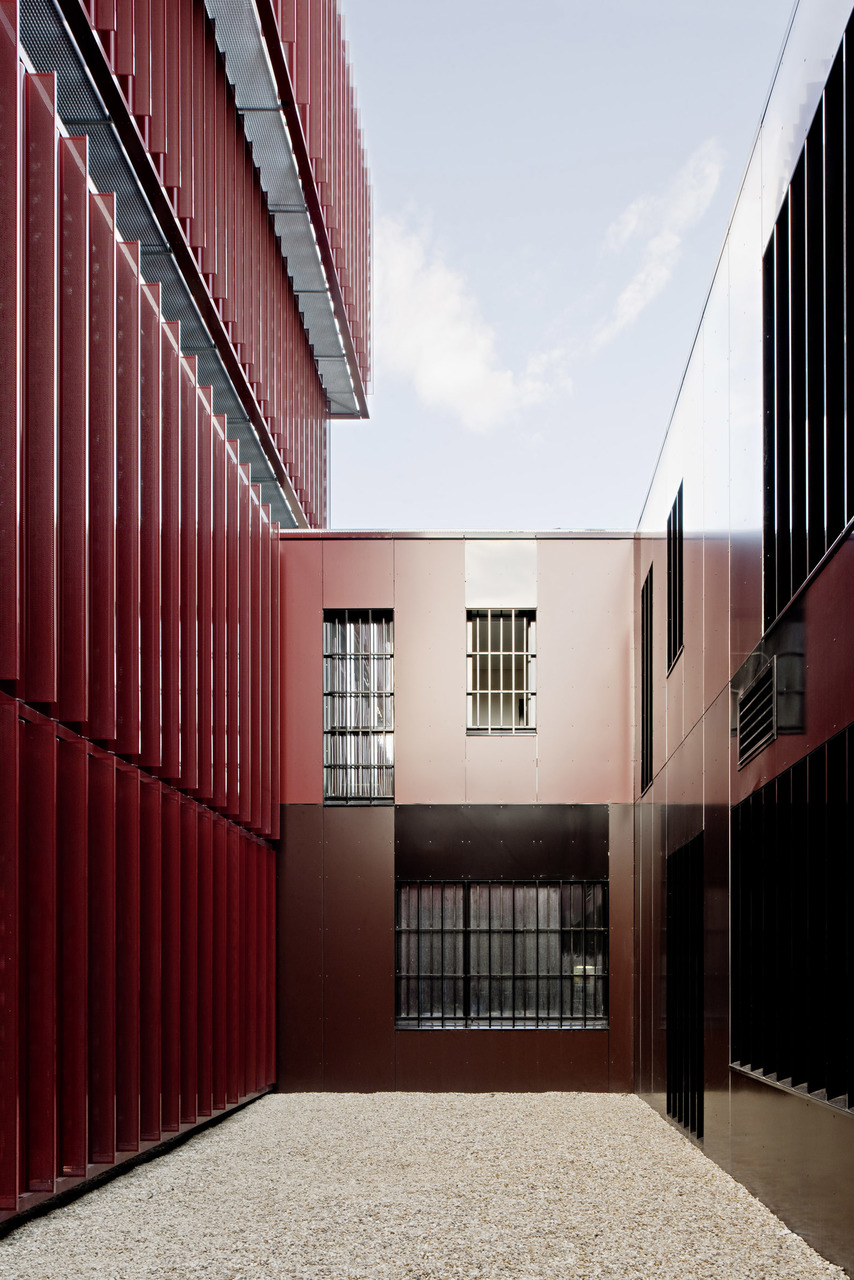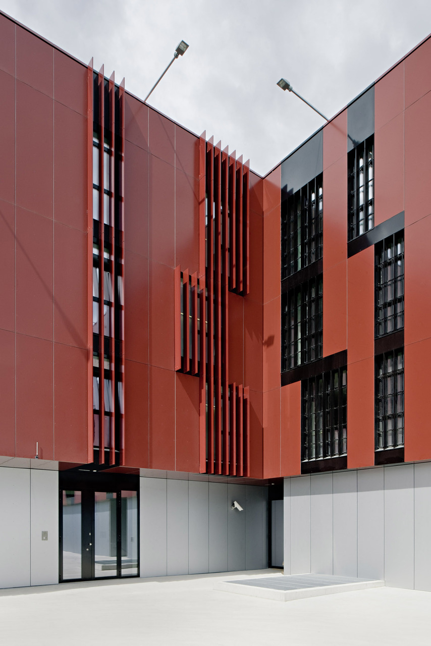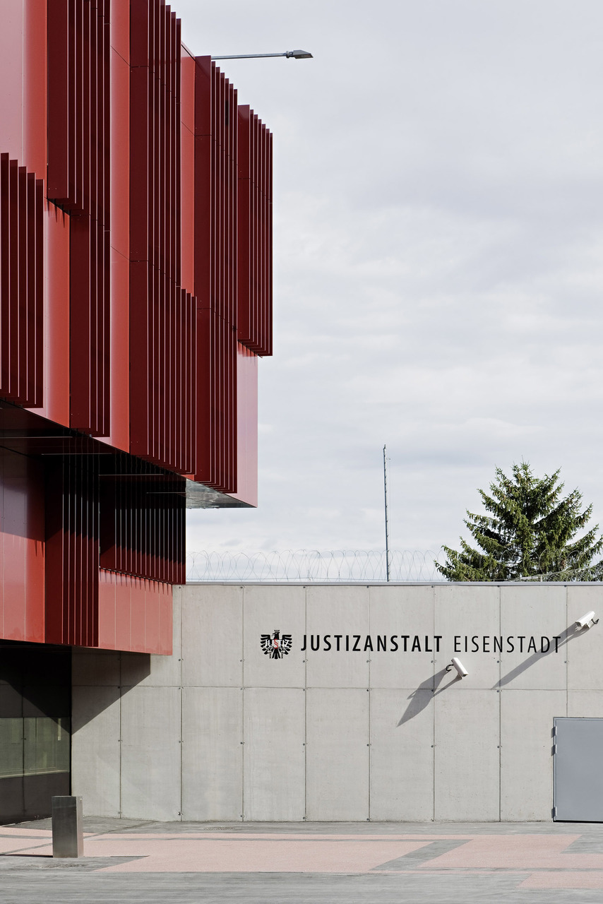 Das Gerichtgebäude, als kompakter Baukörper mit Innenhof passt sich typologisch an die bestehende Blockbebauung an und die Erweiterung der Justizanstalt führt die L-Form des bestehenden Riegels des Hafttrakts weiter.