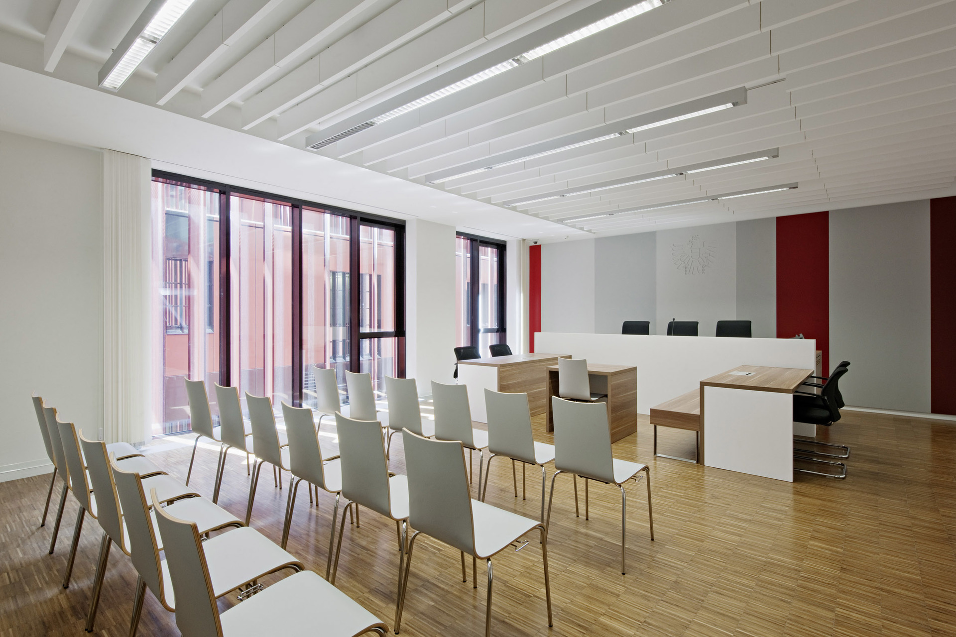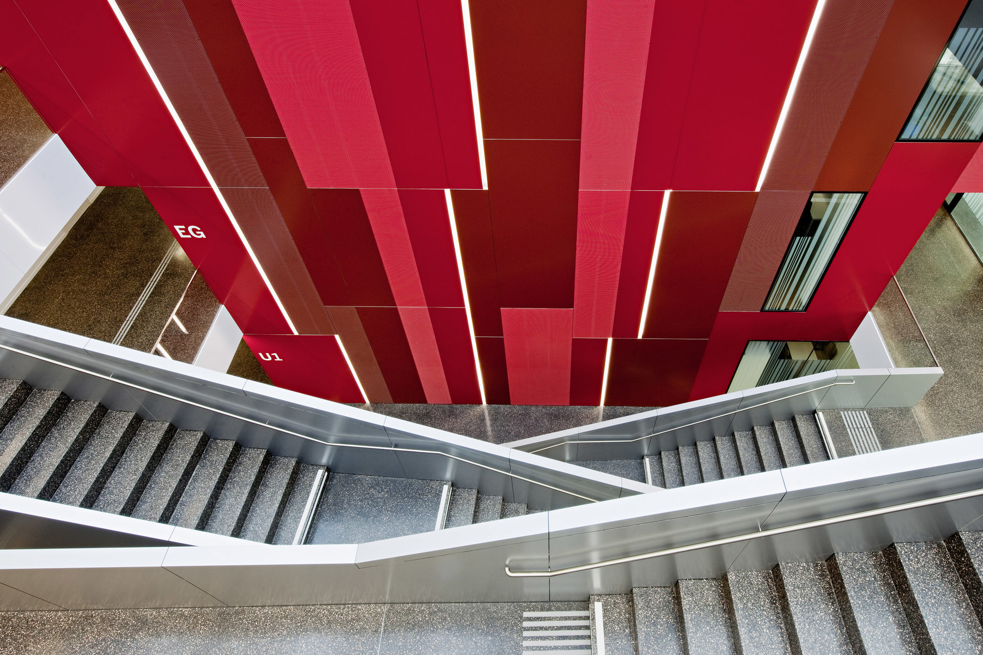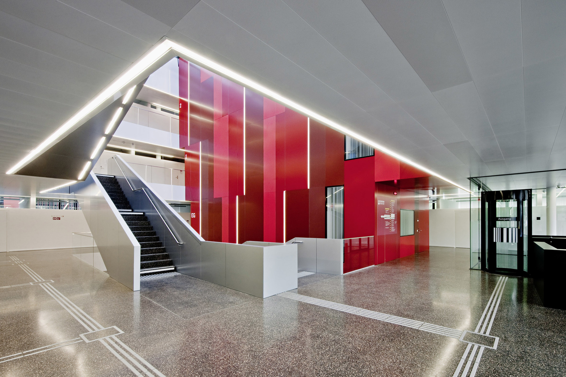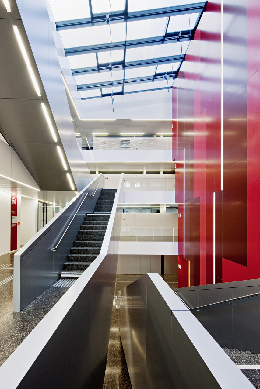 Glasdach lässt Tageslicht in das Atrium strömen und schafft eine offene und helle Atmosphäre für Mitarbeiter und Besucher. Der rote Kern verbindet die vier Geschosse miteinander und widerspiegelt die bewegte Außenfassade.