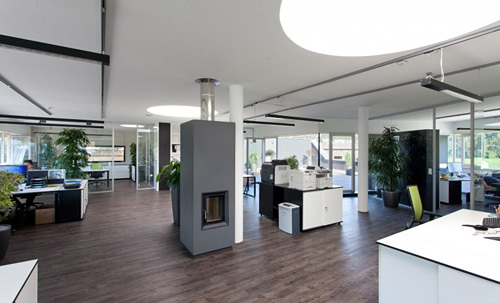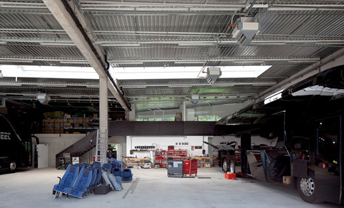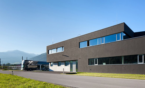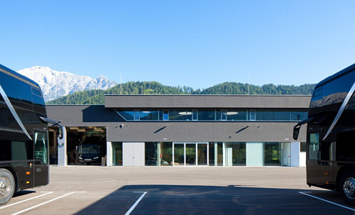 Materialität und Farbkonzept orientieren sich stark am Design der firmeneigenen Busse und stellen die Verbindung zwischen Gebäude und Firmenidentität her. Die großen, anthrazit eingefärbten Putzflächen mit ihrer groben Kratzstruktur erinnern an Asphaltbelag, glatte Flächen in silberner Metallicfarbe an die Metallteile und Spiegelungen bei den Bussen. (Text: Claudia Wedekind)