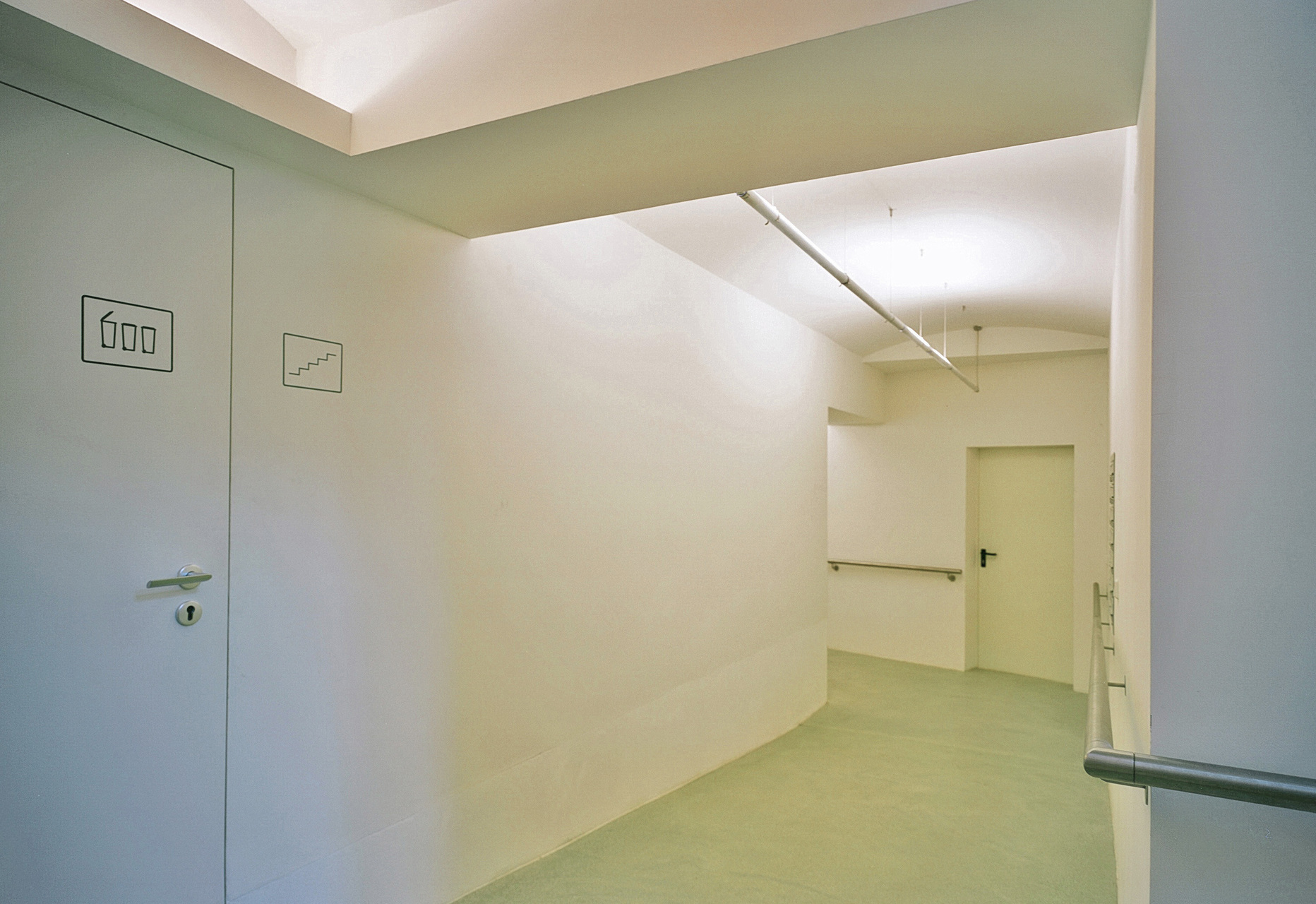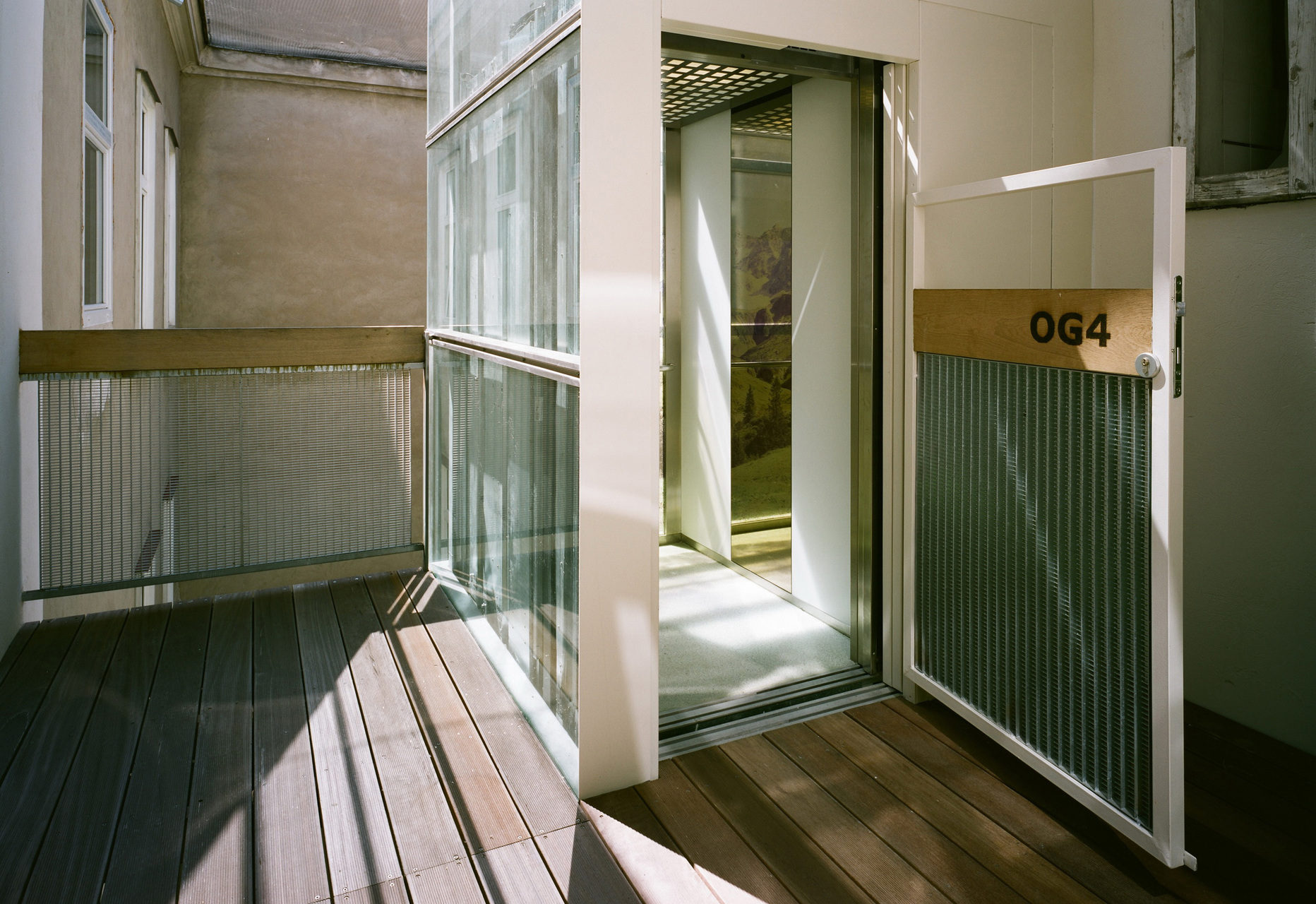 Der Mangel an Grünraum und Freiflächen im dichtverbauten Wiener Gründerzeitquartier wird durch einen Glasdruck an der Aufzugskabinenrückseite kompensiert - nachmittags strahlt die Sonne durch ein Bildmotiv aus dem Bregenzerwald des Vorarlberger Fotografen Christoph Lingg. (Martina Frühwirth nach einem Text des Architekten)
