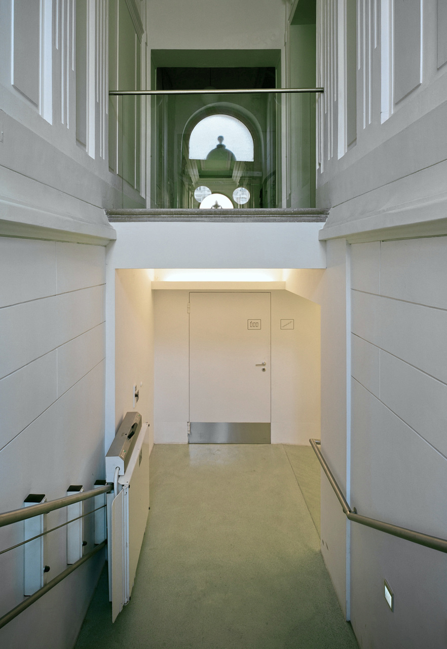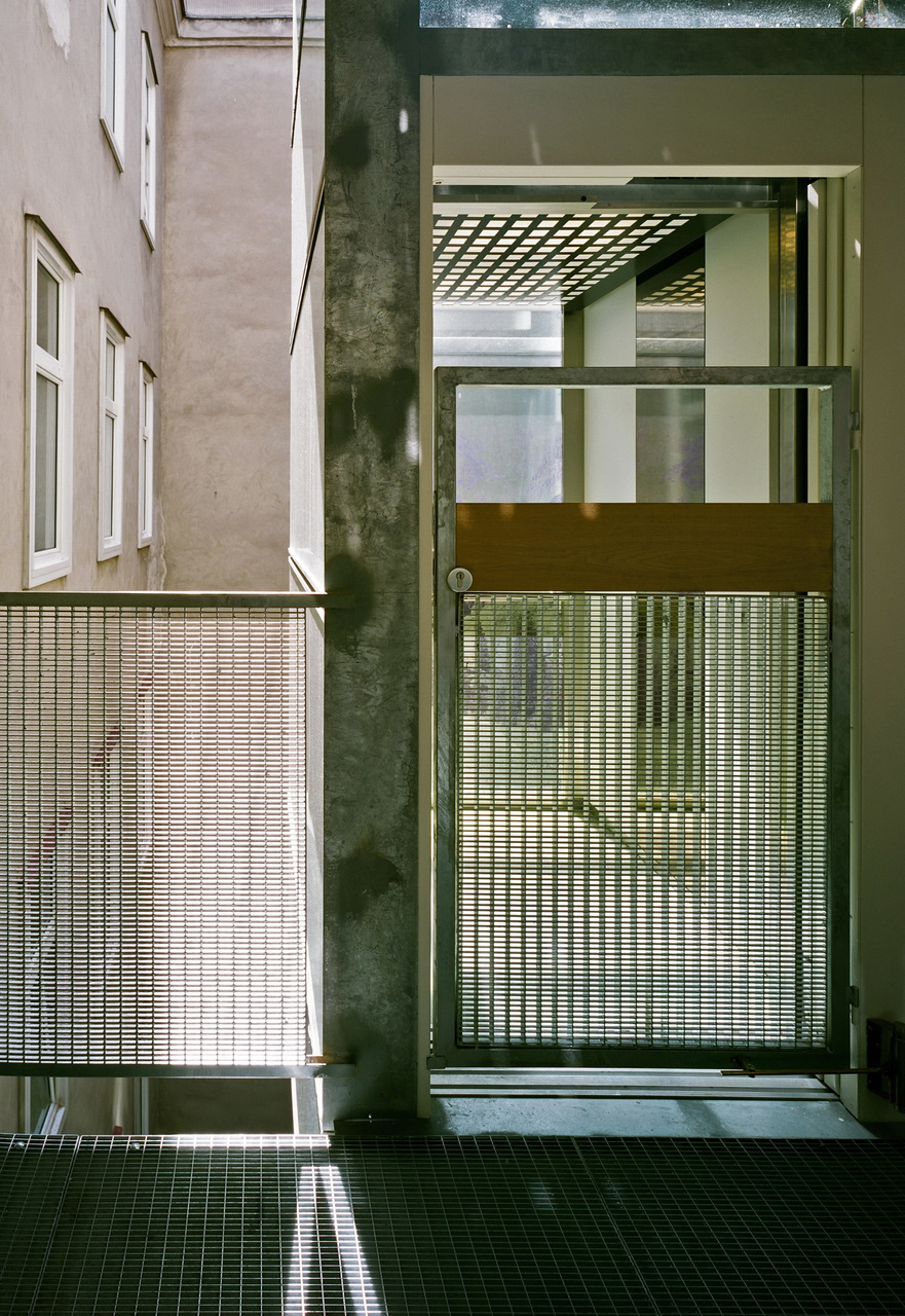 Im Innenhof des doppeltraktigen Gründerzeithauses wird mit einem Panoramaaufzug eine vertikale Raumschicht vor die Fassade gestellt. Die einzelnen Geschosswohnungen werden über die Aufzugspodeste barrierefrei erschlossen. Der Weg vom Lift zur Wohnung ist verbreitert und bietet als witterungsgeschützter Außenraum Platz für ein wenig Individualität außerhalb der eigenen vier Wände. Wo zuvor nur ein Außenthermometer am Fensterrahmen einen Bezug zum Außenraum herstellte, bietet das neu errichtete Geschosspodest vor dem Küchenfenster Platz für Tischchen, Pflanzentöpfe u.v.m.Um die bescheidenen Belichtungsverhältnisse zu erhalten, wird der Aufzugsschacht ab dem Hochparterre als Stahl/Glasturm hochgeführt und die Geschosspodeste in den Regelgeschossen wurden mit Gitterrosten versehen.