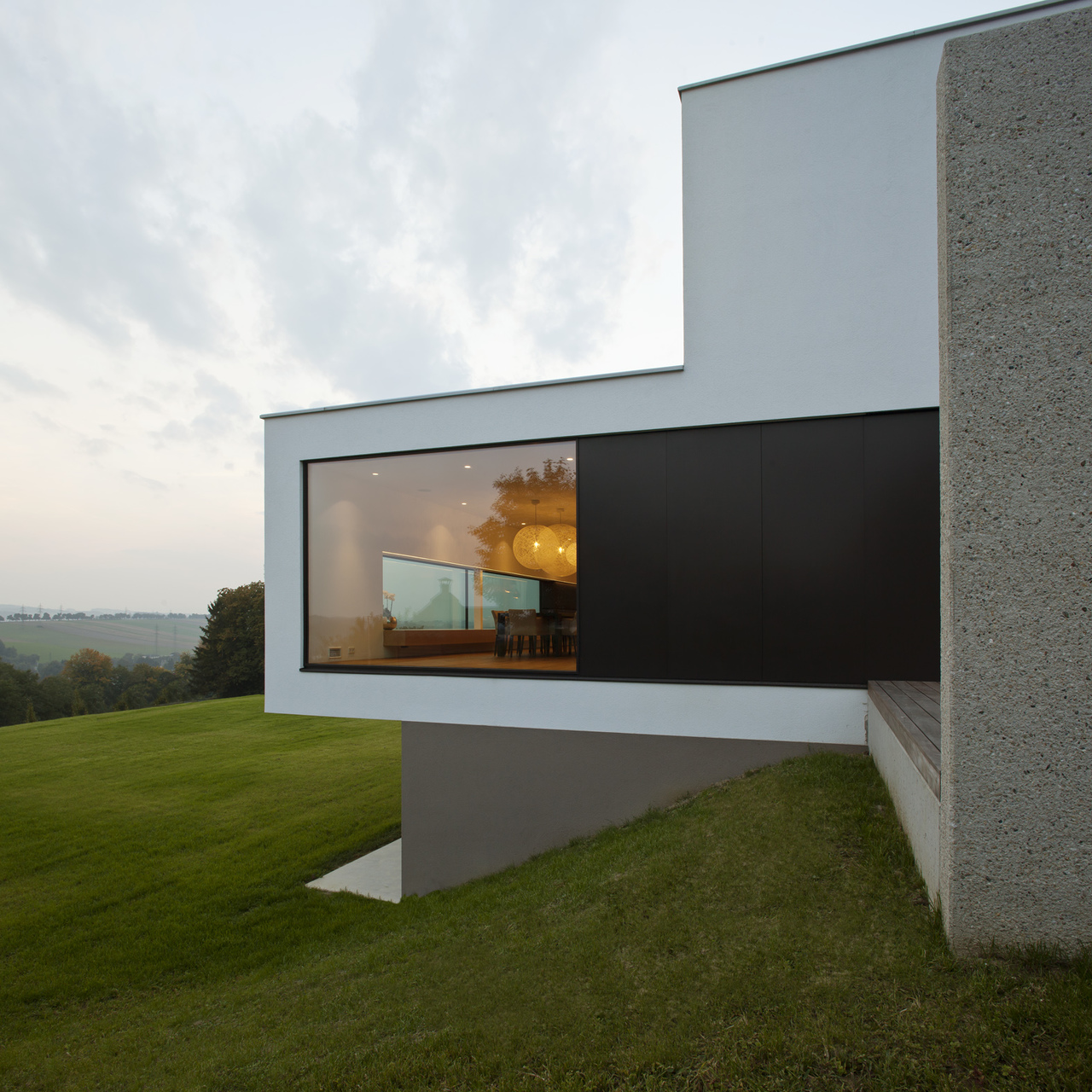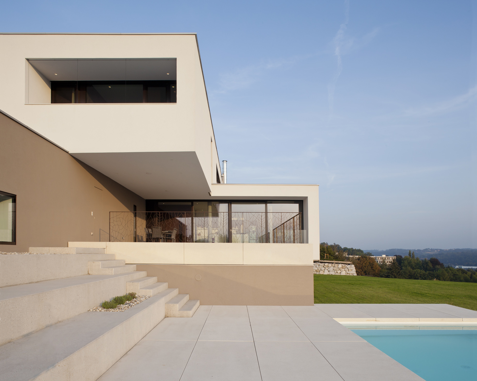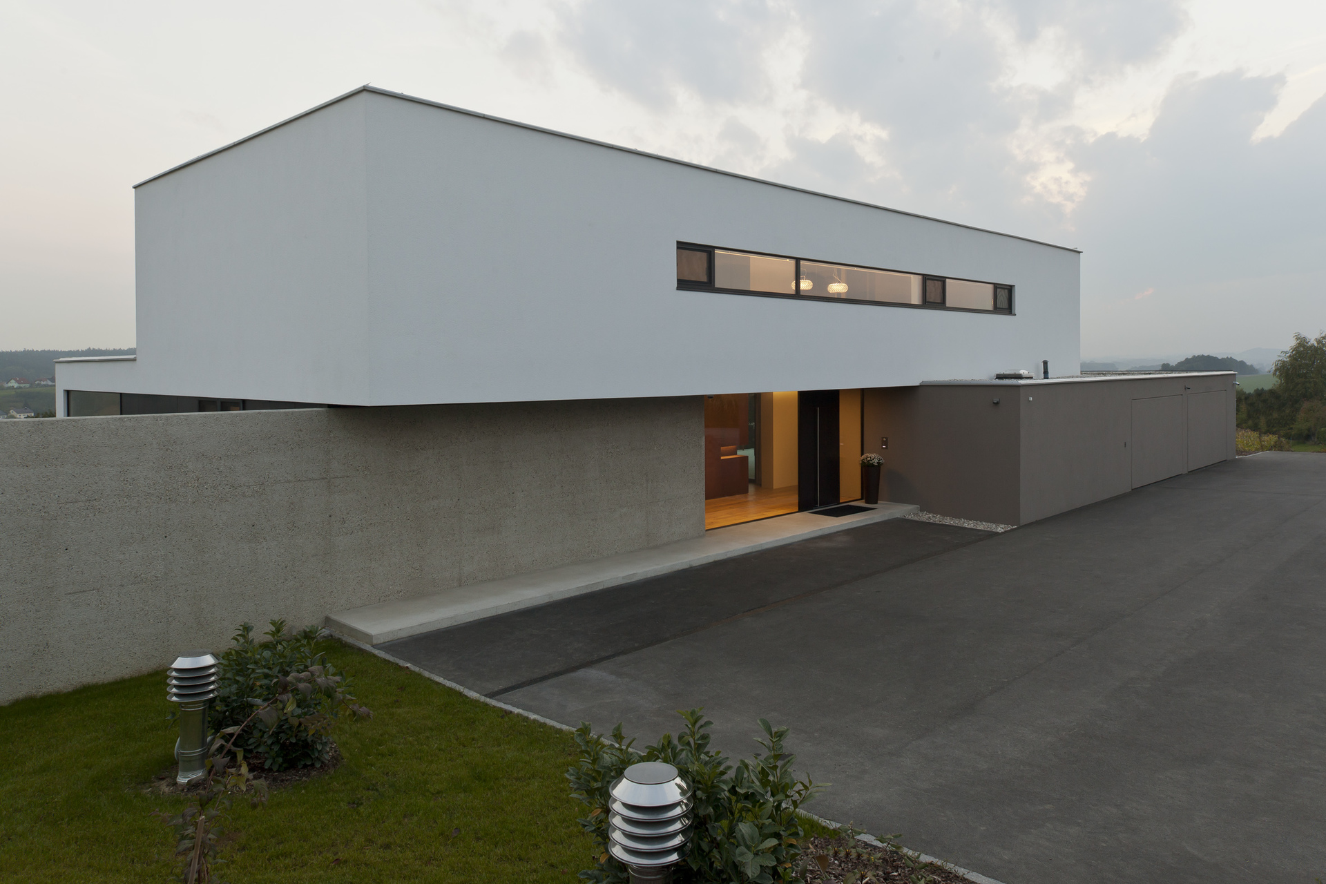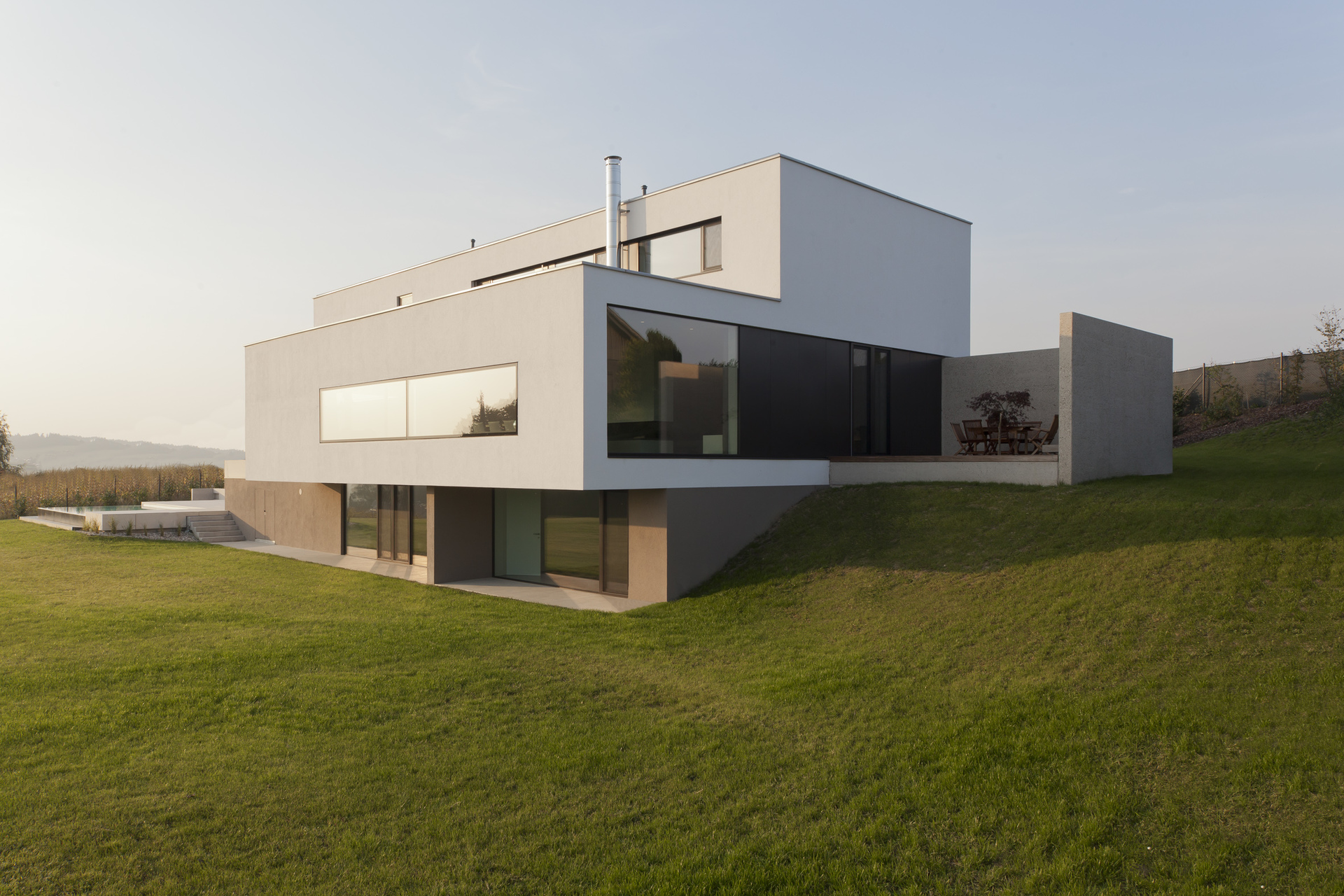 Aufgrund der Hanglage konnten die einzelnen Funktionen des Hauses (Schlafen / Wohnen / Freizeit) übereinander gestapelt werden, was von Anfang an ein Wunsch der Bauherren war, ohne Verzicht auf großzügige natürliche Belichtung und verbunden mit differenzierten Ein- und Ausblicken. Die gastfreundliche Familie wollte eine klare Abgrenzung zwischen allgemeinen, den Gästen zugänglichen, Bereichen und privaten Räumen.