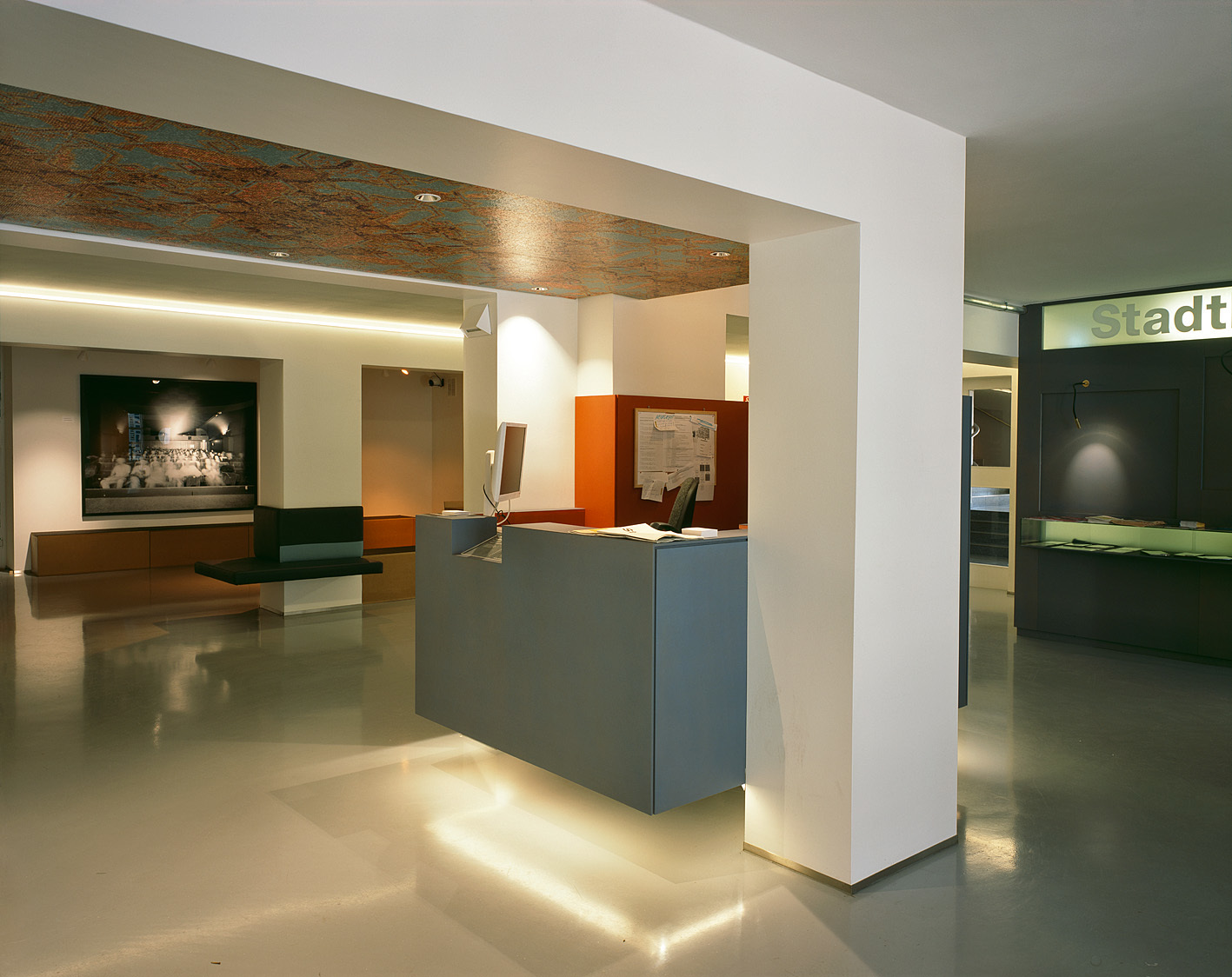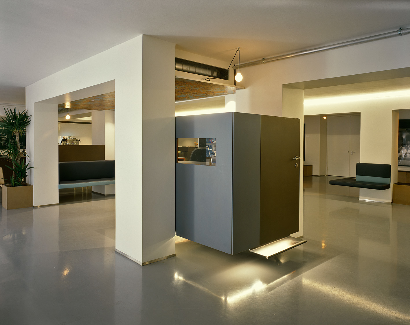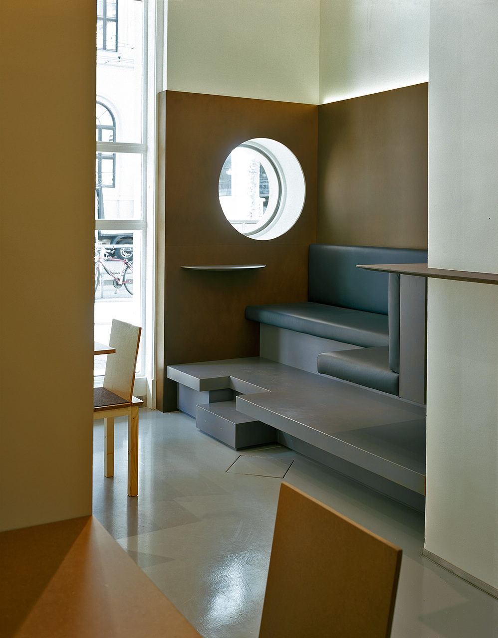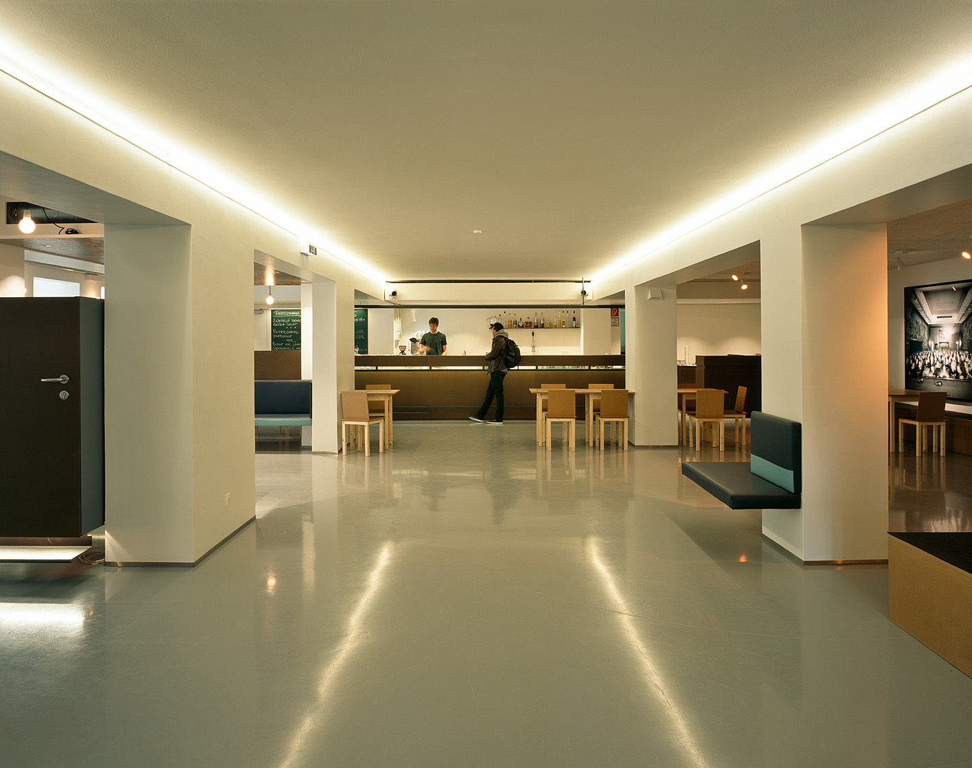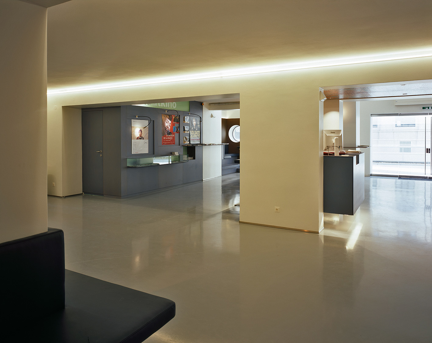 Wo zuvor Stellwände, Caféhaus-Tische und -Stühle den Raum verstellten, bietet das Foyer jetzt viel Platz zum Rein- und Durchgehen. Das Rein- und Durchgehen meint allerdings nicht schnelles Durchlaufen, sondern eine Zone des Wartens, wobei sich an unerwarteten Stellen Nischen auftun und im Nutzungsoffenen alles Mögliche passieren können soll. Die Architektin greift die vorhandene Struktur auf und arbeitet mit den Säulen, Vor- und Rücksprüngen. Direkt beim Eingang lädt ein schlanker, erhöhter Bartisch zum Sehen und Gesehenwerden ein. Weniger exponiert sitzt man in den Nischen. Wie beiläufig laden gepolsterte Sofas entlang der Säulen zum Sitzen ein. Die niederschwelligste Form der Bar-Möblierung sind Sideboards, auf denen man sein Glas abstellen kann. Diese Boards dienen bei Bedarf auch als Ablagefläche für Folder. Der Funktion entsprechend nimmt die Kassa jetzt einen zentralen Platz ein. Der Kassa-Kubus wurde zwischen zwei Säulen eingepasst und schwebt im Raum, ebenso die Bänke. So behält das Foyer seine wiedererlangte Leichtigkeit.