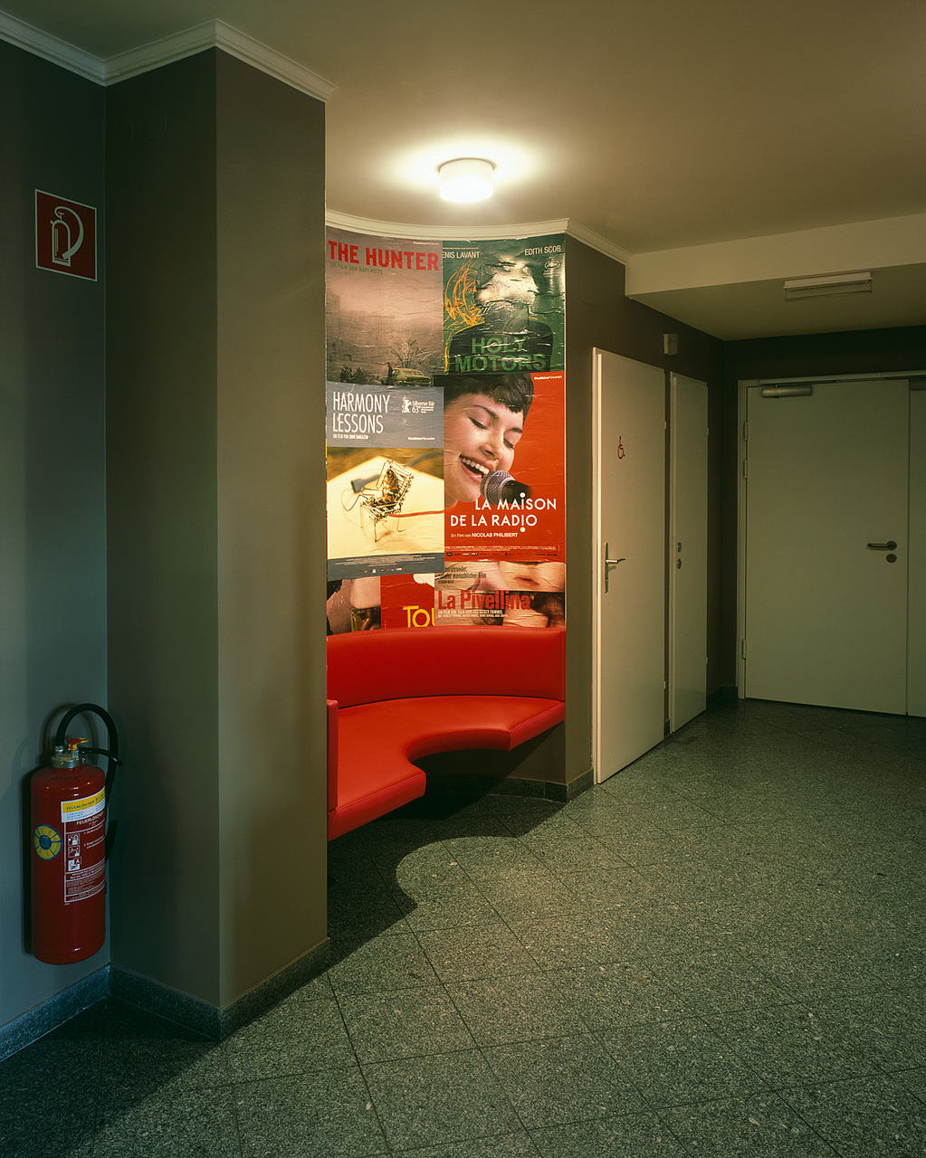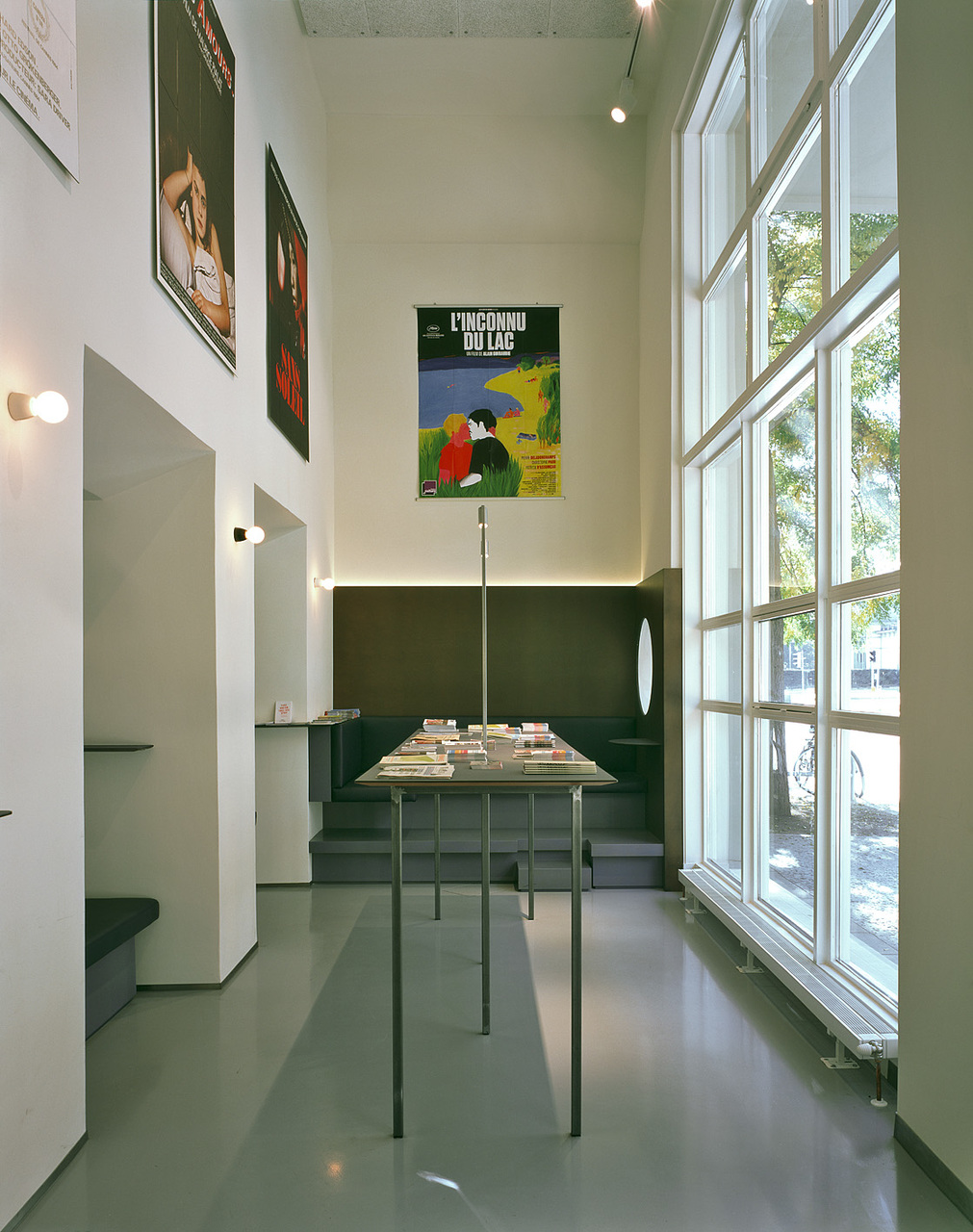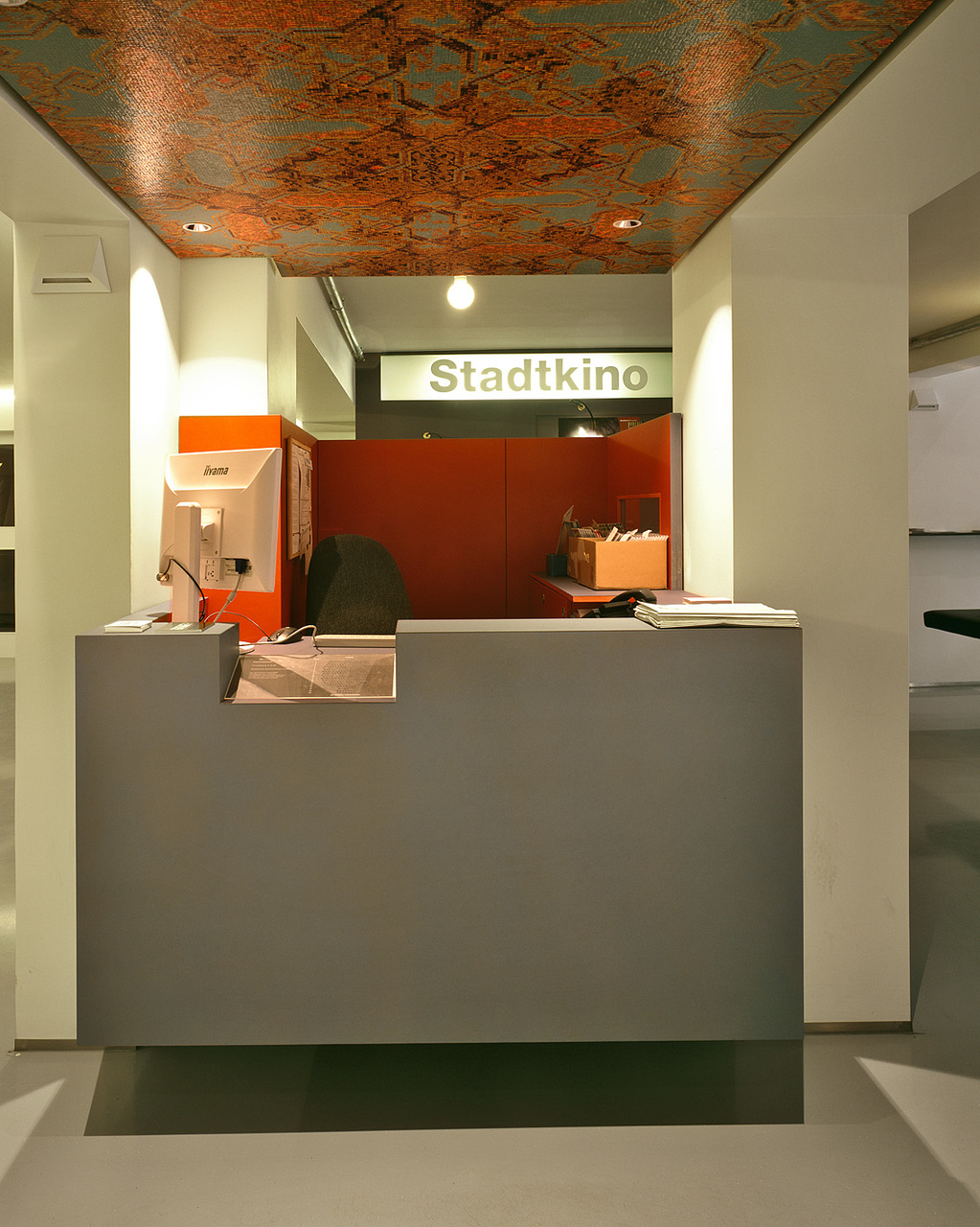 Für die gesamte Möblierung wurde eine Bar-Ebene von 1,15 m Höhe durchgezogen. Die Höhe wirkt wie eine subtile Klammer für die vielfältigen Sitzgelegenheiten. Im Kinofoyer befindet sich auch ein Lokal. Die Differenzierung der Sitzplätze (mit/ohne Konsumationspflicht) erfolgt einerseits über die Farbe: die Möbel des Foyers sind blau. Andererseits über die Flexibilität: Die MDF-Möbel des Lokals sind mobil und können bei Bedarf entfernt werden.