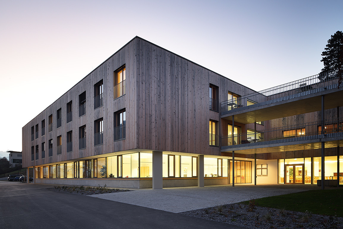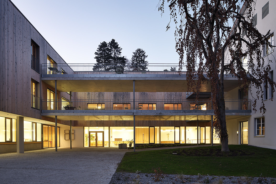Die einzelnen Funktionsbereiche Pflegeheim, Tagesbetreuung MOHI, Betreutes Wohnen, Kindergarten sind jeweils über klar getrennte Eingänge erschlossen. Es gibt nur zwei Stiegenhäuser, die Fluchtwege funktionieren über die Außenräume. Von beiden Geschoßen mit den Pflegezimmern werden Terrasse und Garten barrierefrei erreicht. Die Hanglage ist damit klug genutzt. Über den zentralen Vorplatz erreicht man das Foyer im Neubau des Pflegeheimes. Er übernimmt die Verteilerfunktion zu den einzelnen Bereichen wie Verwaltung, Krankenpflegeverein, Kaffeestube, Mehrzweckraum und den Verbindungsgang zum Altbau mit Zentralküche und Wäscherei. Der Kindergarten im Erdgeschoss des Altbaus wird über den bisherigen Zugang erschlossen und durch eingezogenen Windfang und Barrierefreiheit verbessert. Die Kapelle und die Wohnungen der Schwestern befinden sich ebenfalls weiterhin im Altbau.