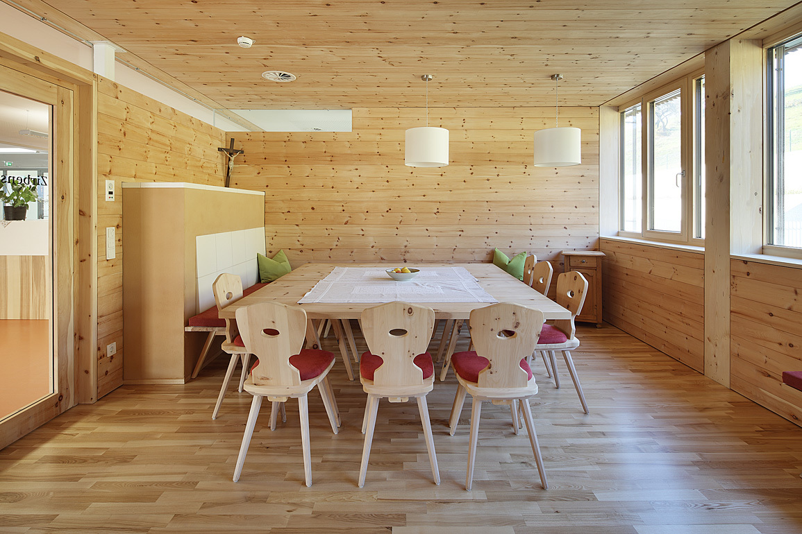 Die Zimmereinheiten lassen sich von den raumhohen Fenstern außen ablesen. Vorherrschendes Material ist Holz: Fassade Fichte aus Feldkirchs Wäldern, am Boden, Türen und Möbel Braunkernesche. Die Gänge sind hell und weiß, Trockenbau, am Boden Linoleum. Übersichtlichkeit und Freiraumbezug hatten Priorität. Zirbenstube und Strahlungswärme durch eine Art von Kachelofen, in dem die Heizschlangen der Fußbodenheizung hoch gezogen werden, sind Attribute an die Behaglichkeit. Die einzelnen „Haus“Eingänge bekommen Hausnummern und erlauben mit kleinen Bords persönliche Gestaltung. Insgesamt ist die Signaletik bemerkenswert und entspricht mit den logischen, abstrakten Schwarz-Weiß-Spiegelungen dem übersichtlichen Gesamtkonzept.