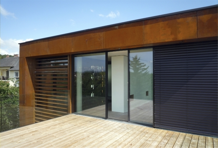 Eine besondere Attraktion ist das Schlafzimmer im Dachgeschoss: auf drei Seiten raumhoch verglast, bietet es einen Rundumblick auf die Stadt und Sicht auf den Garten. In der warmen Jahreszeit wird dieser als erweiteter Wohnraum genutzt. Unterhalb vom Schwimmbiotop befindet sich ein Salettl aus Holz, das sich in der ersten Saison bereits sehr bewährt hat.