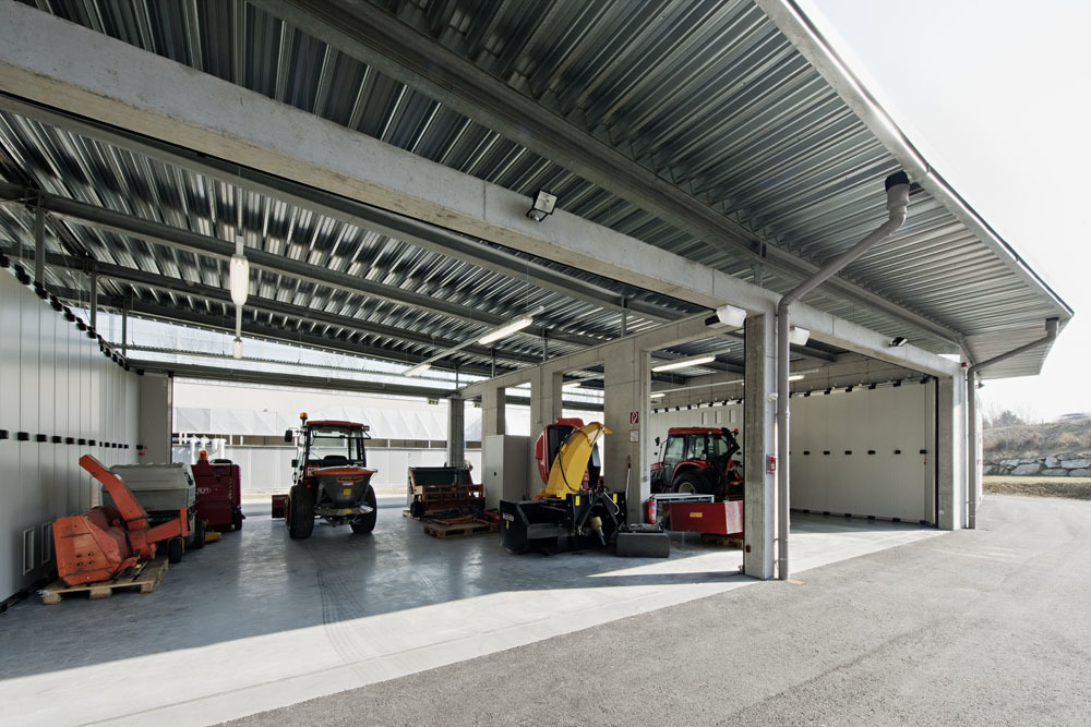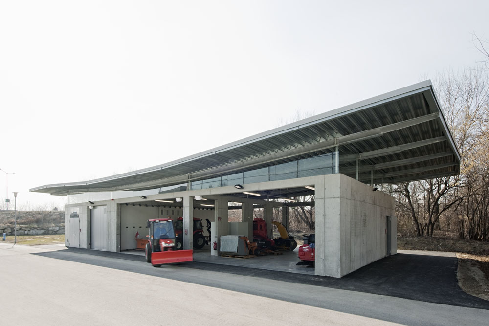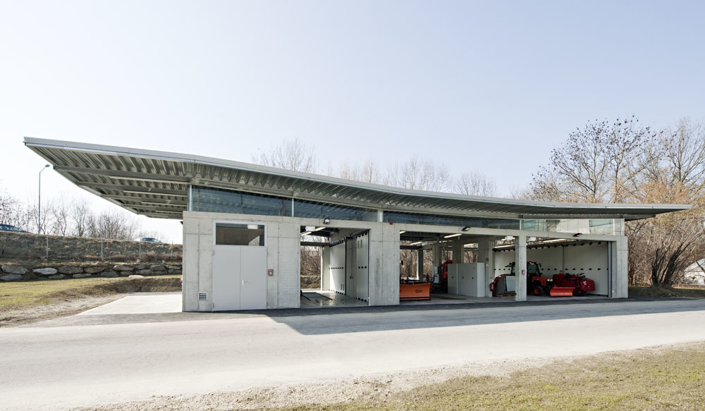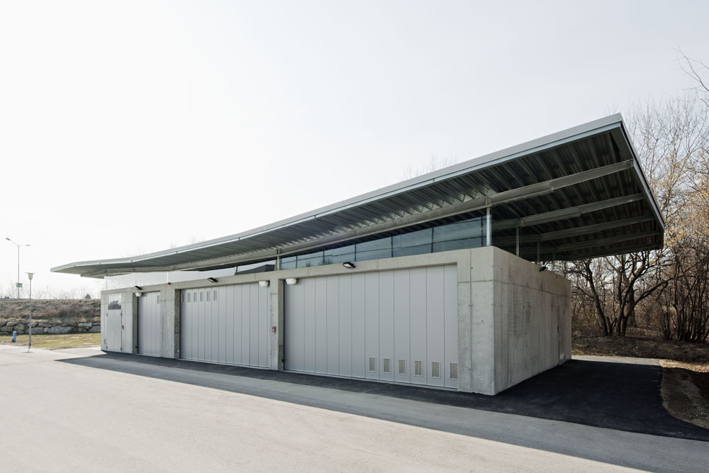 Neue Sicherheitsstandards bescherten der Sportwelt ein weitere architektonische Maßanfertigung auf einen Grundzwickel an der westlichen Zufahrt. Irene Ott-Reinisch plante den knapp 10 Meter breiten, 25 Meter langen, smarten Fuhrpark mit privater Mini-Tankstelle. Das feine Stück Gebrauchsarchitektur mit dem weit auskragenden, markanten Flugdach aus Trapezblech kreuzt die komprimierte Infrastruktur einer Tankstelle inklusive Montagegrube und Garage mit Funktionalität, Umweltbewusstsein und Schönheit.