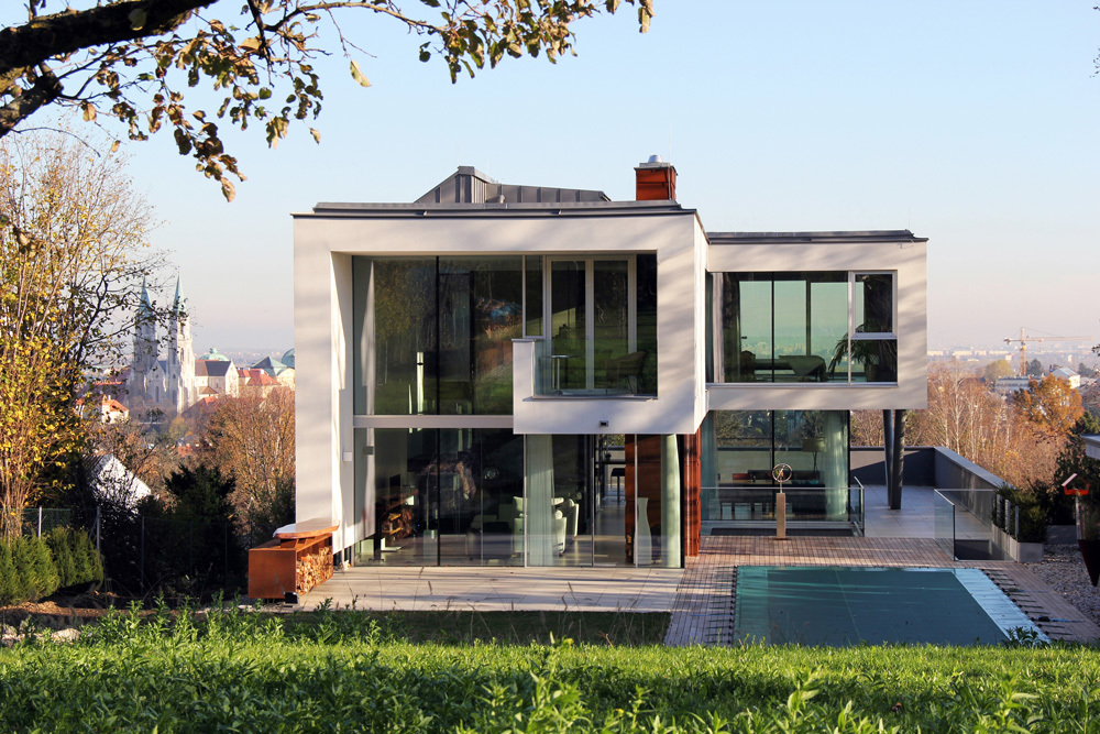 Der gesamte Baukörper ist in eine zweigeschoßige, teilweise eingegrabene Basis und einen darauf aufbauenden luftigen, zweigeschoßigen weißen Baukörper gegliedert. Die Basis bildet einen Teil des Gartens, vom oberen Baukörper durch einen durchgehenden Spalt an der Nordseite und durch die Glasfassade getrennt. Eine begrünte Rampe in Norden ermöglicht die Zufahrt zum Garten und folgt dem bestehenden Verlauf des Hügels.