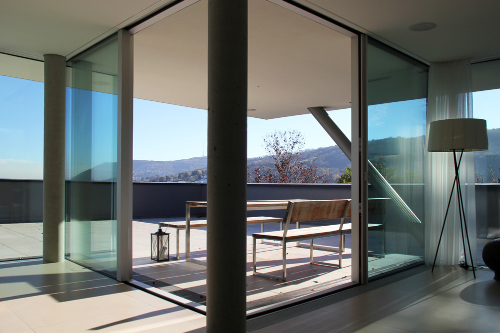 Vollständig von der Strasse verborgen bleibt die große Wohnebene, die in einen Außenraum mit Pool und Garten übergeht. Innen und Außen sind nur durch eine raumhohe Verglasung getrennt und werden durch einen einheitlichen Keramikbelag optisch verbunden. Die Küche mit Esszimmer und überdachter Terrasse an der Straßenseite münden in ein zweigeschoßiges, hofseitiges Wohnzimmer mit Arbeitsgalerie. Eine hohe überdachte Terrasse an der Poolseite und ein mit Corten-Stahl verkleidetes Nebengebäude ergänzen das Raumangebot.