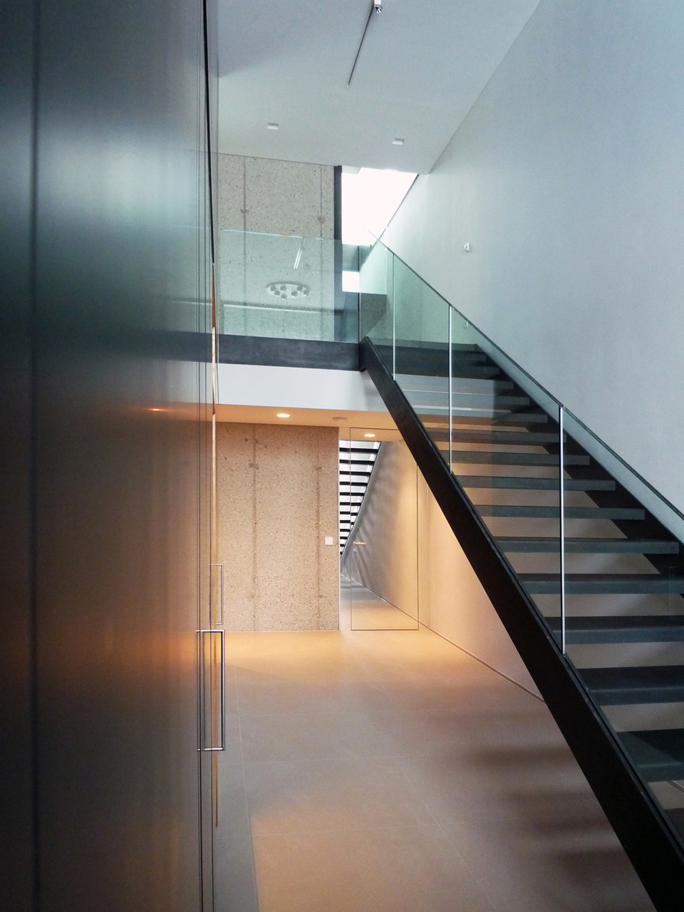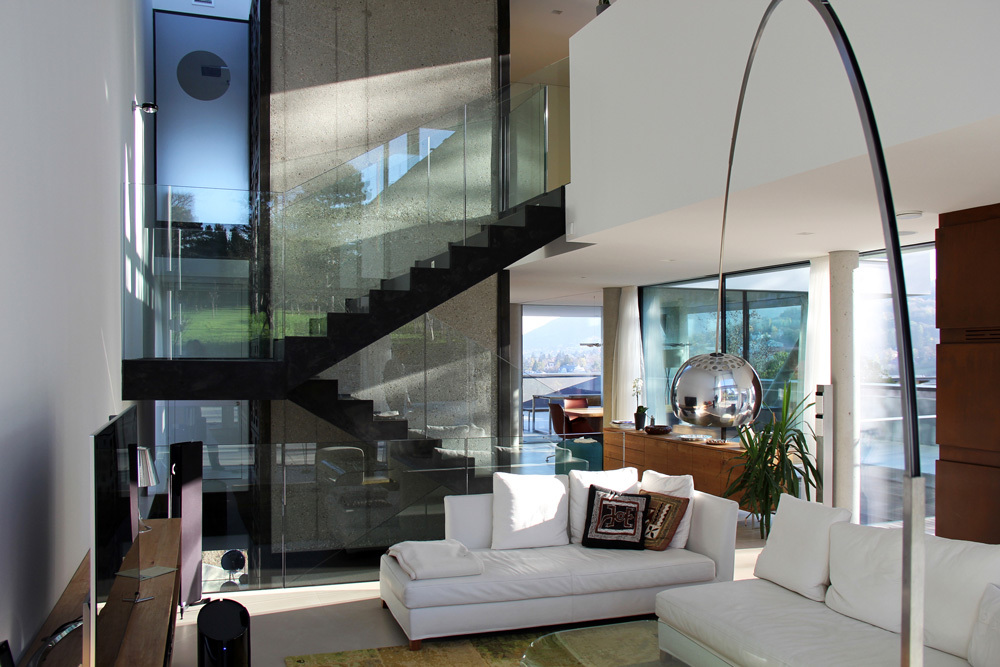 Im obersten Geschoß befindet sich ein teilbares Schlafzimmer mit Bad und Garderobe, sowie ein Arbeitsbereich mit Bibliothek an der Galerie des Wohnzimmers. Eine diagonale Licht- und Sichtverbindung zwischen Eingangshalle und dem hohen Raum des Wohnzimmers - mit einem Oberlicht und einem durchgehenden Aufzugsturm senkrecht konterkariert - verleiht dem Haus Leichtigkeit und Eleganz.