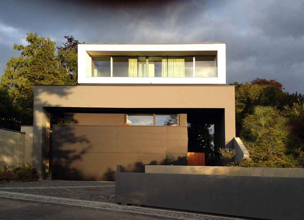 Von der Strasse im Süden gelangt man auf eine mit Granitwürfeln gepflasterte Ebene, die an einer zweigeschoßigen dunklen Fassade (Metallpaneele, Putz) mündet. Der einzige zweigeschoßige Spalt führt durch helle Holztüren in eine hohe Eingangshalle, die ebenfalls mit den dunklen Metallpaneelen verkleidet ist. Das Gebäude wird durch eine einläufige, brünierte Metallstiege und einen Aufzug erschlossen. In der zweiten Ebene öffnet sich ein helles, begrüntes Atrium in südliche Richtung. Es teilt den Raum in eine Einliegerwohnung, einen großzügigen Wellness-Bereich mit Außensauna und eine weitere Stiege mit Aufzug nach oben.