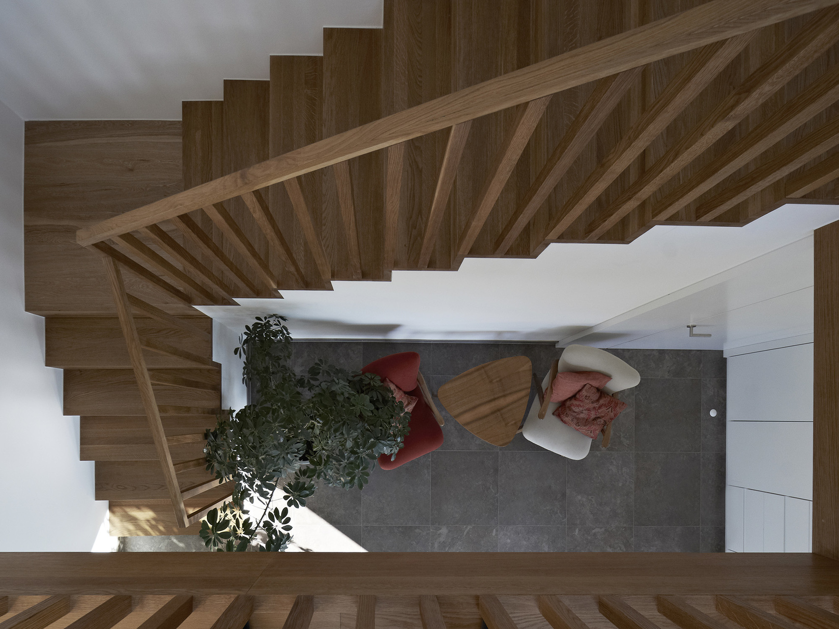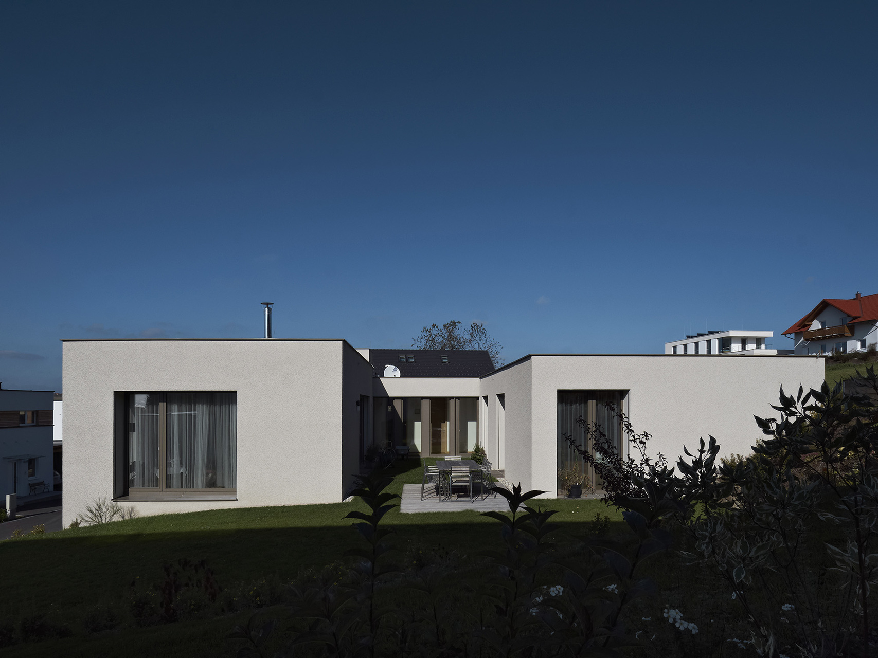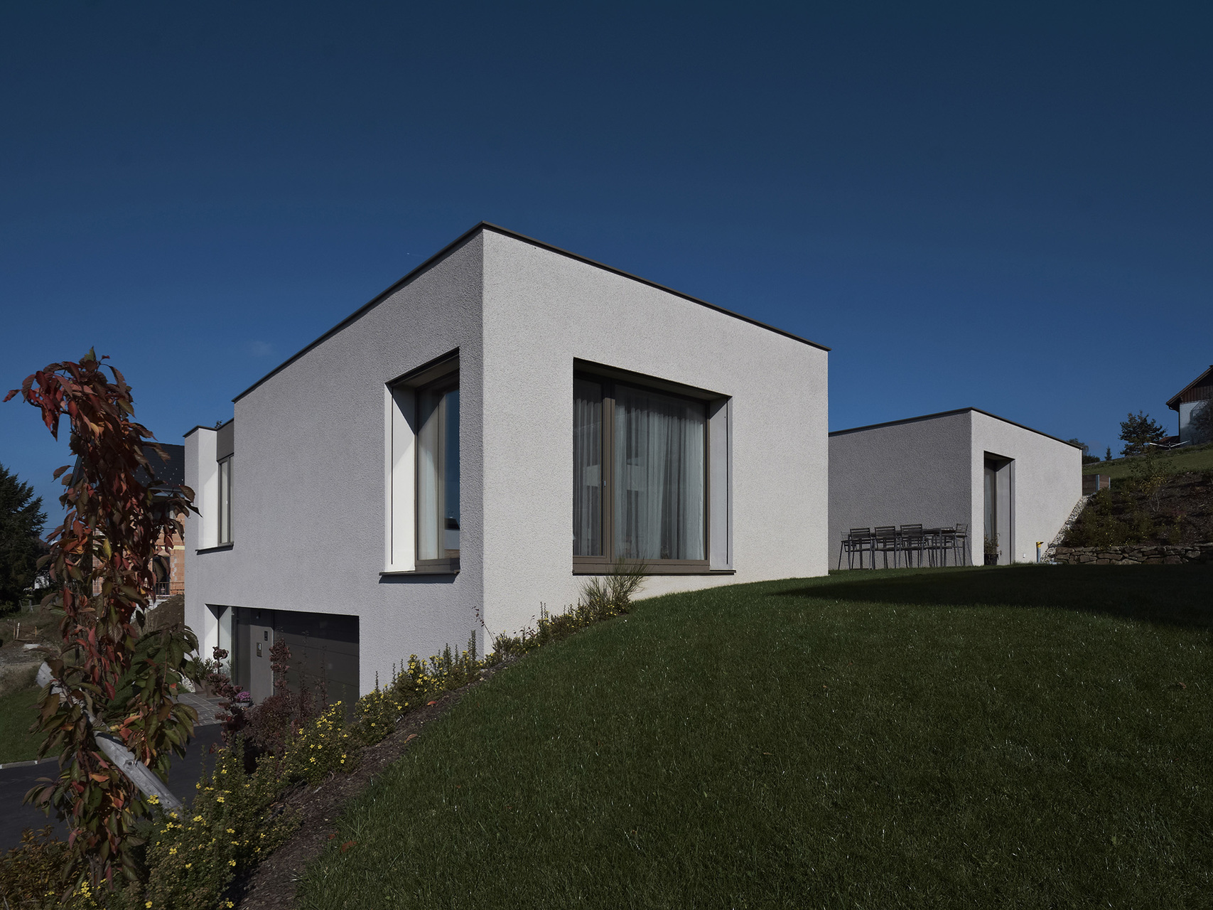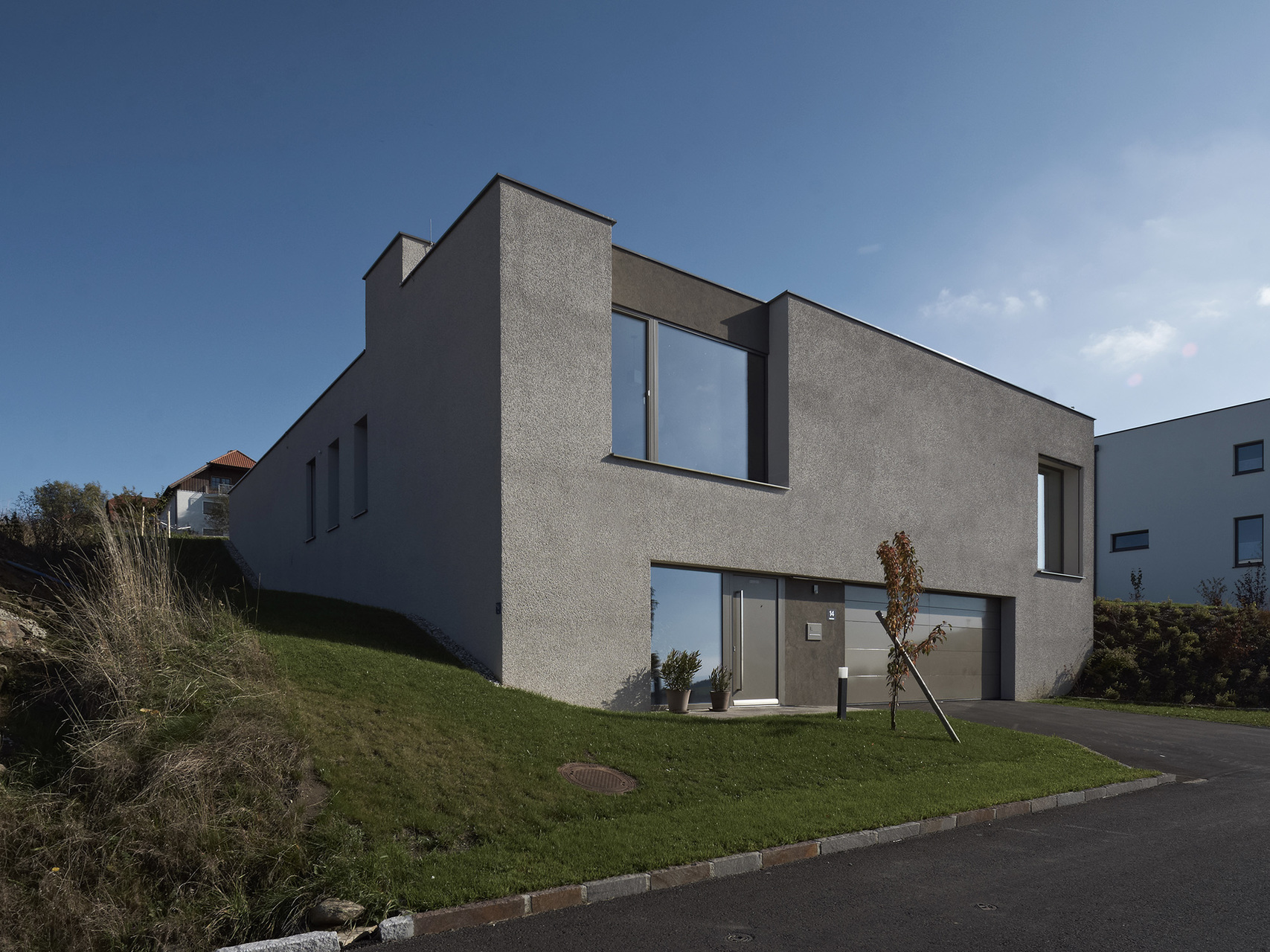 Die Bauherren haben während des Entwurfsprozesses großen Wert auf die Erhaltung der ursprünglichen Geländecharakteristik gelegt. Das Grundstück liegt in begünstigter Hanglage in einem kontinuierlich wachsenden Siedlungsbereich. Aus diesem Grund waren Entscheidungen in der Entwurfsphase stark mit der umliegenden Bebauungsstruktur und den zu erwartenden Doppelhausbebauungen in nächster Nähe verknüpft. Aus dieser Analyse der örtlichen Umstände resultiert die Festsetzung des Fußbodenniveaus und der gerichteten Ausblicke, sodass trotz der Fokussierung auf innenräumliche Qualitäten auch die gewünschte Interaktion mit dem öffentlichen Raum gegeben bleibt.