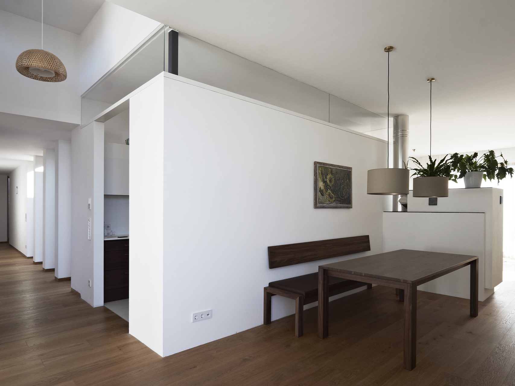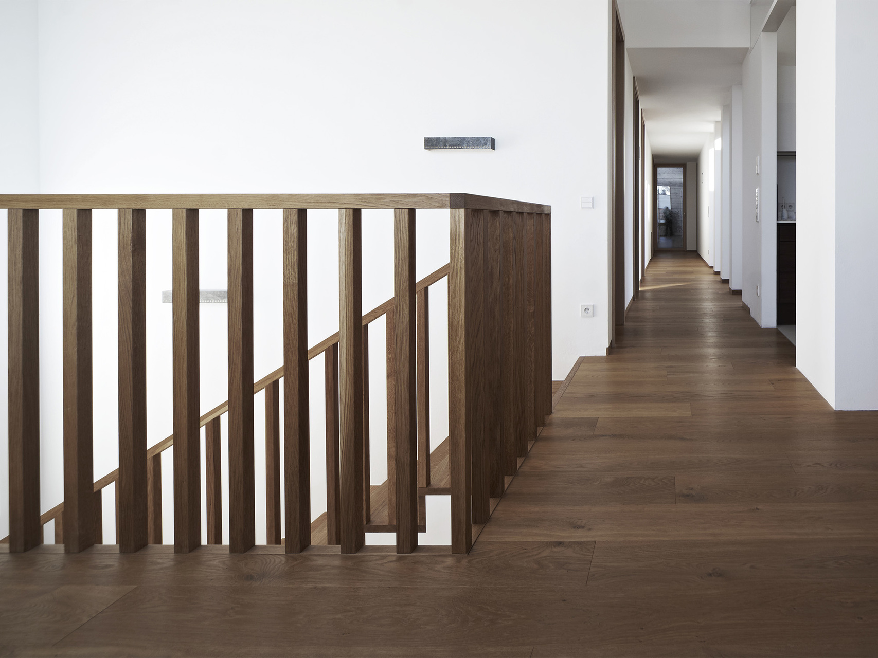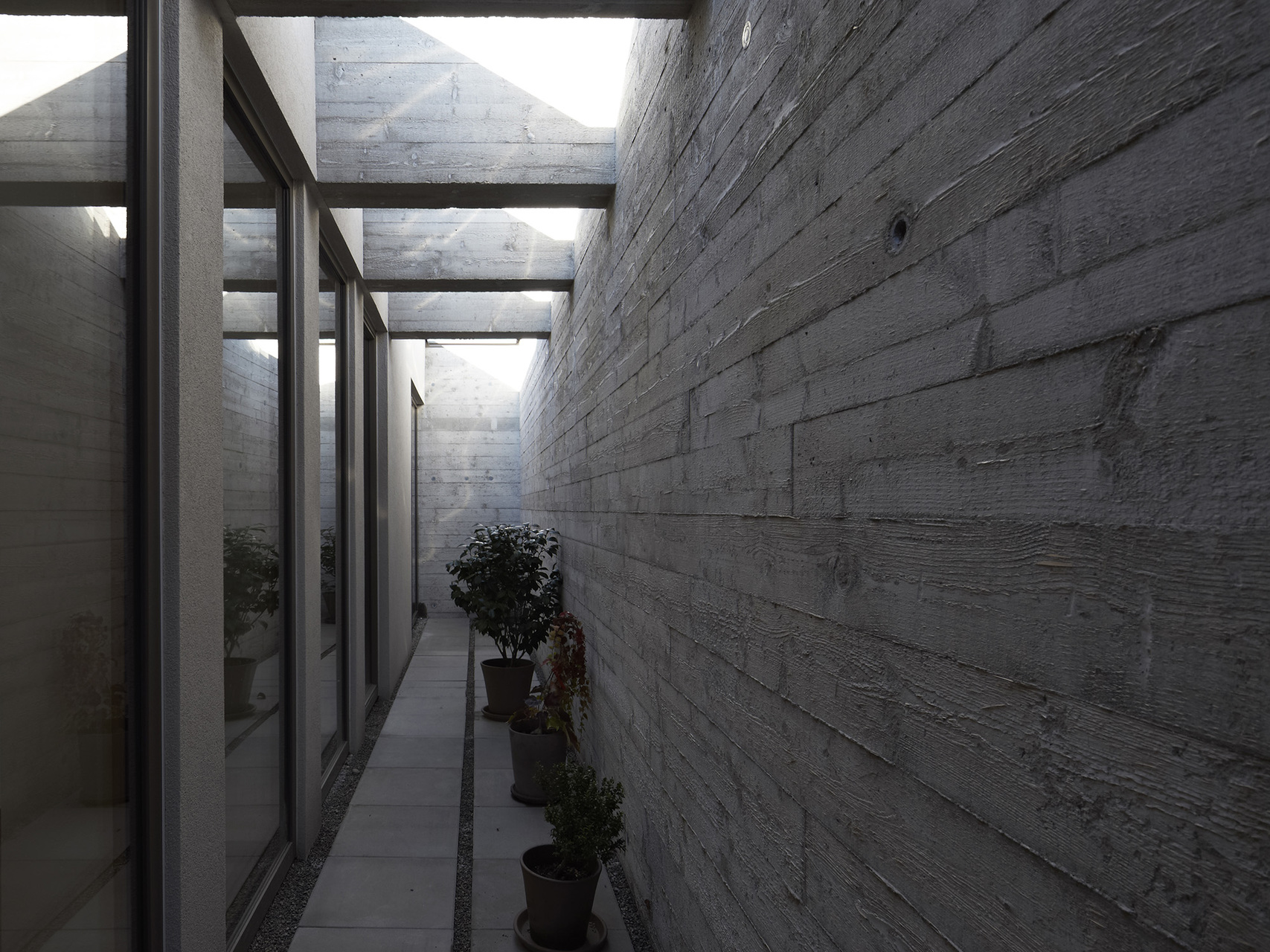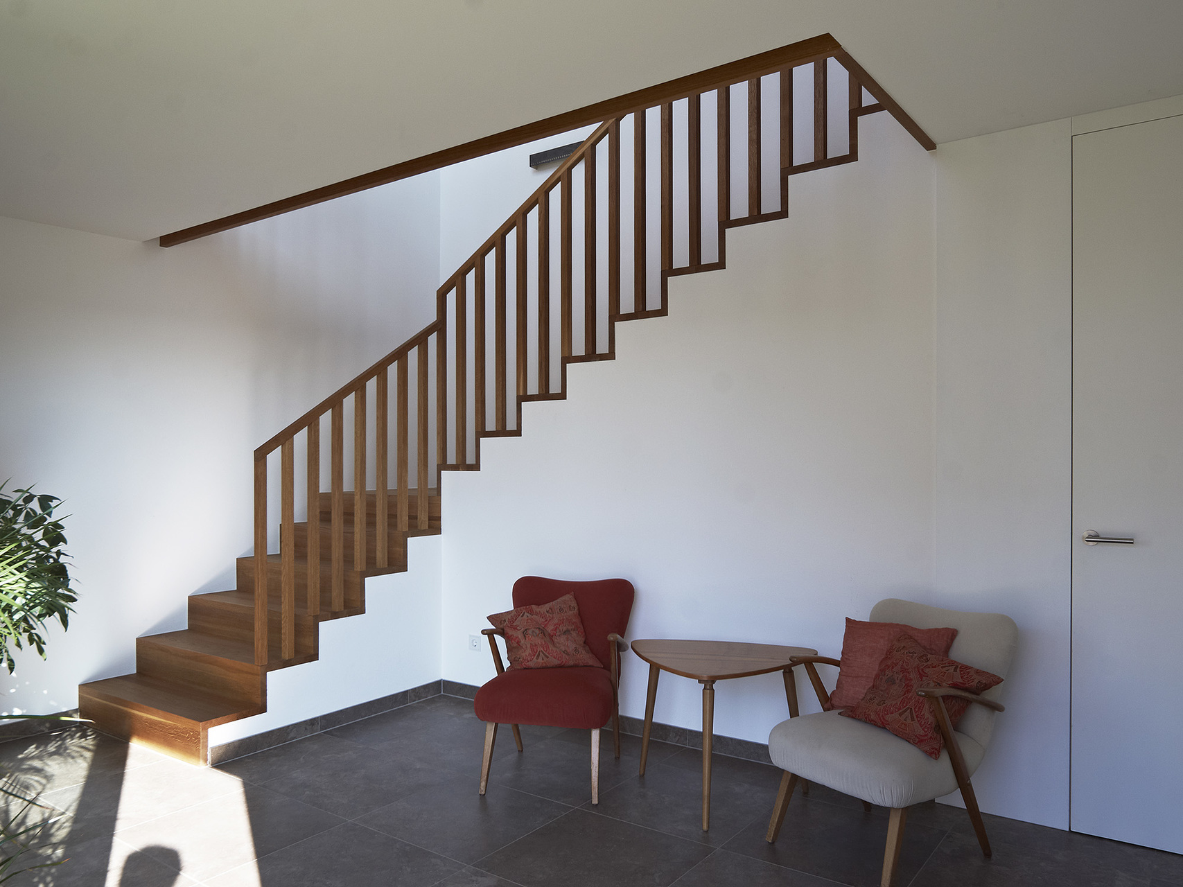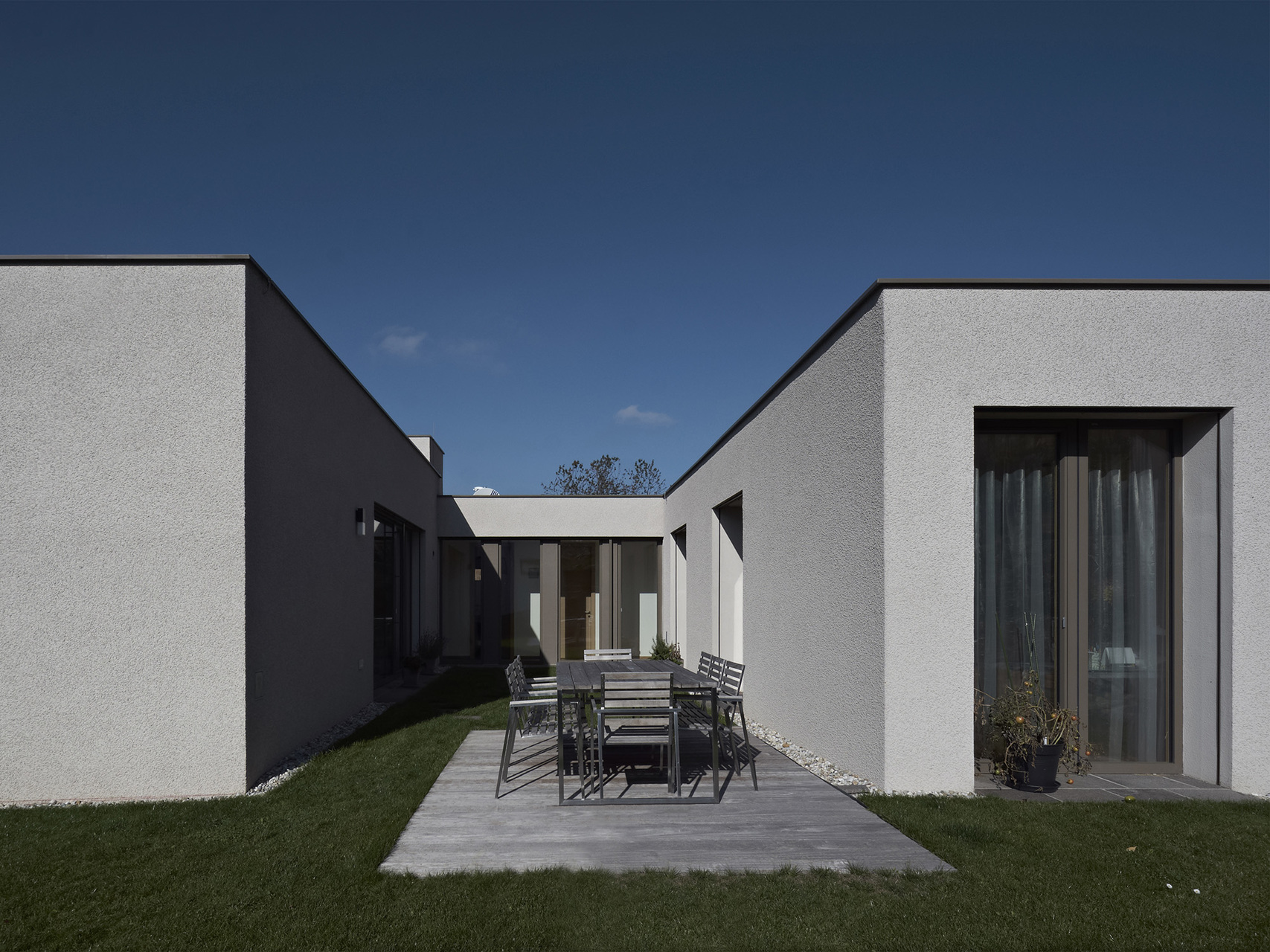 Die Bauherren haben während des Entwurfsprozesses großen Wert auf die Erhaltung der ursprünglichen Geländecharakteristik gelegt. Das Grundstück liegt in begünstigter Hanglage in einem kontinuierlich wachsenden Siedlungsbereich. Aus diesem Grund waren Entscheidungen in der Entwurfsphase stark mit der umliegenden Bebauungsstruktur und den zu erwartenden Doppelhausbebauungen in nächster Nähe verknüpft. Aus dieser Analyse der örtlichen Umstände resultiert die Festsetzung des Fußbodenniveaus und der gerichteten Ausblicke, sodass trotz der Fokussierung auf innenräumliche Qualitäten auch die gewünschte Interaktion mit dem öffentlichen Raum gegeben bleibt.