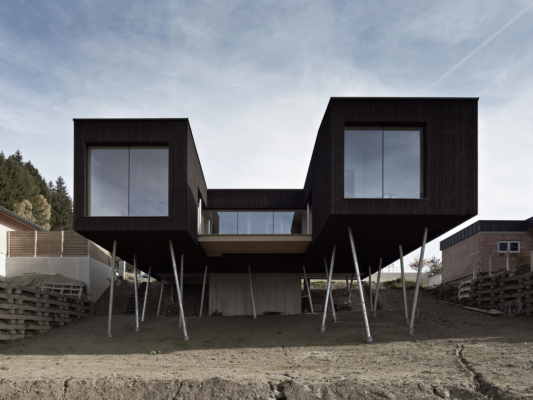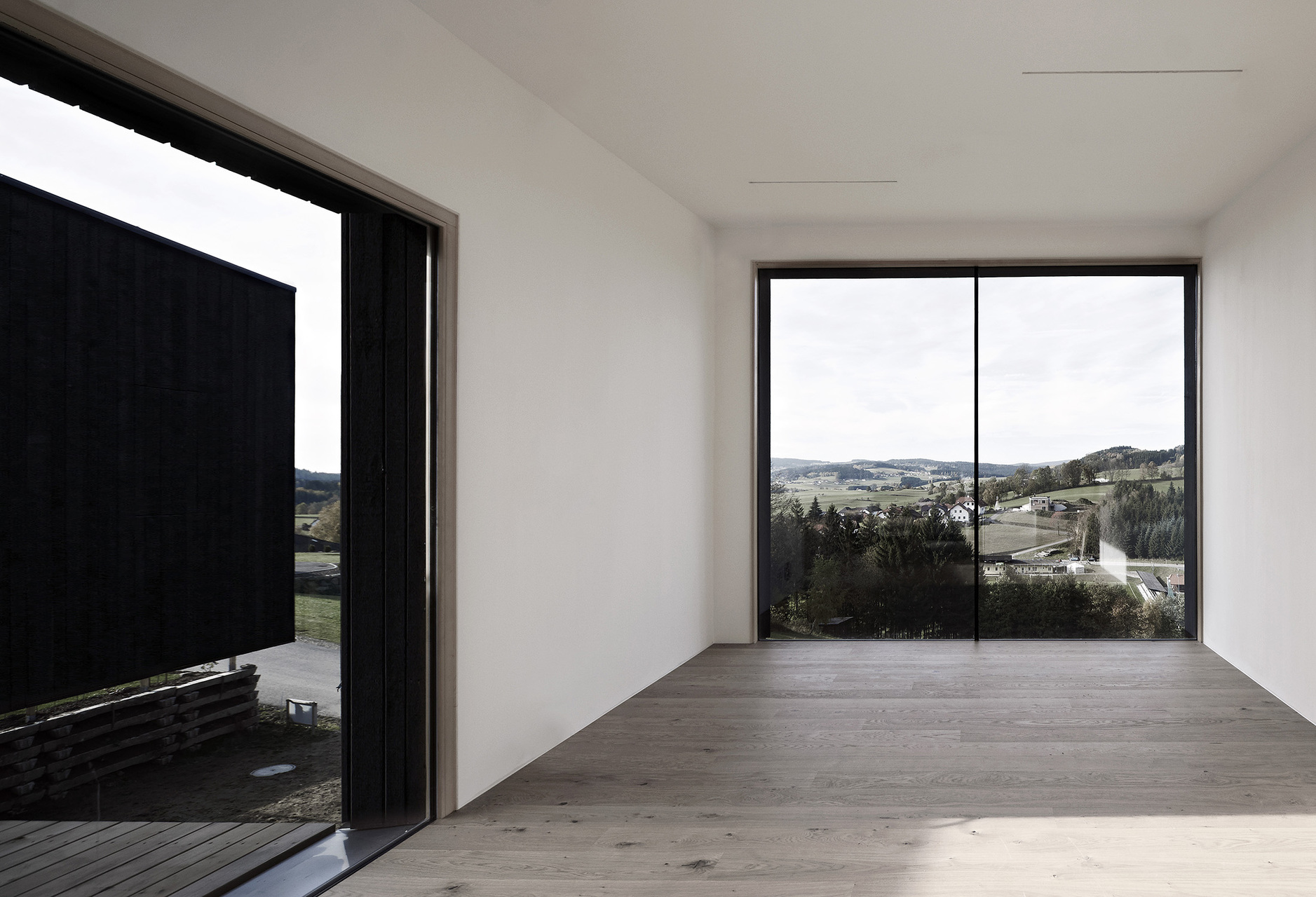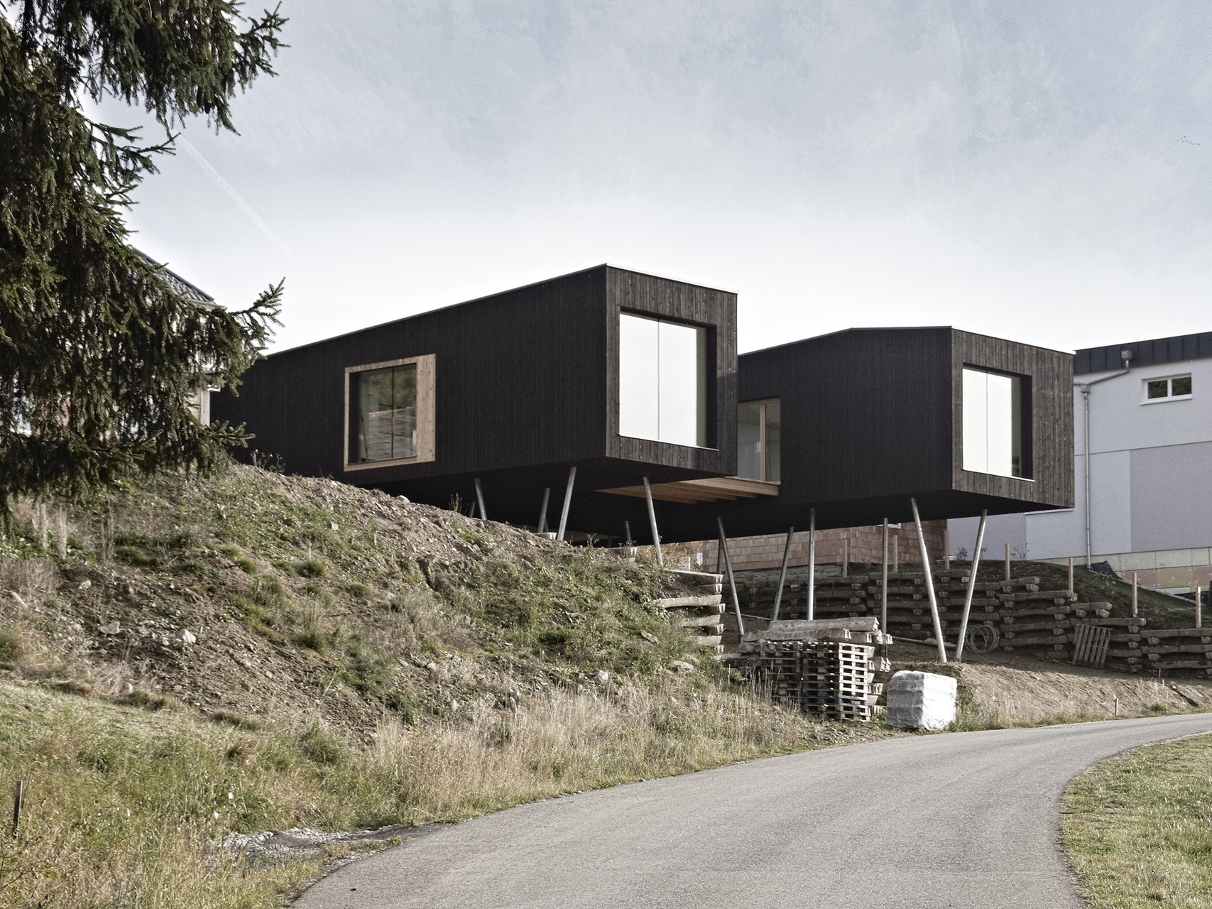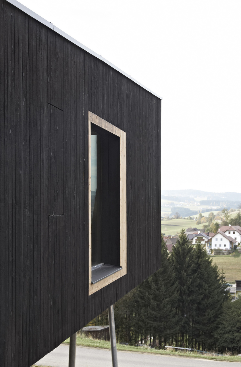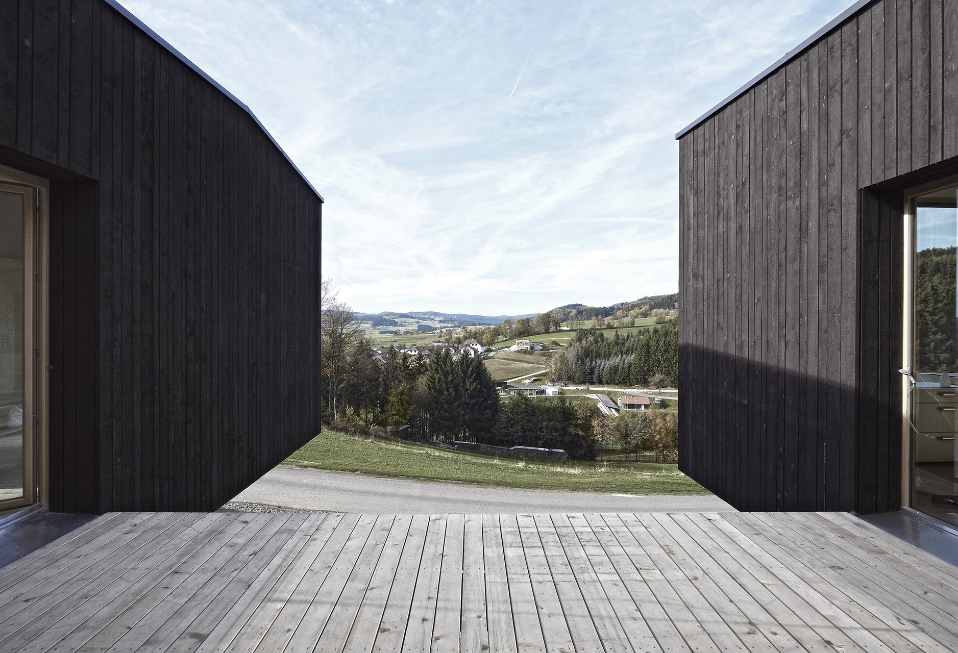 Als Fassadenmaterial wurden sägerauhe Fichtenbretter aus der Region gewählt. Die Beschichtung mit schwarzer, matter Schlammfarbe hebt die raue Oberflächenstruktur hervor, im Streiflicht erscheint die Oberfläche samtig weich.