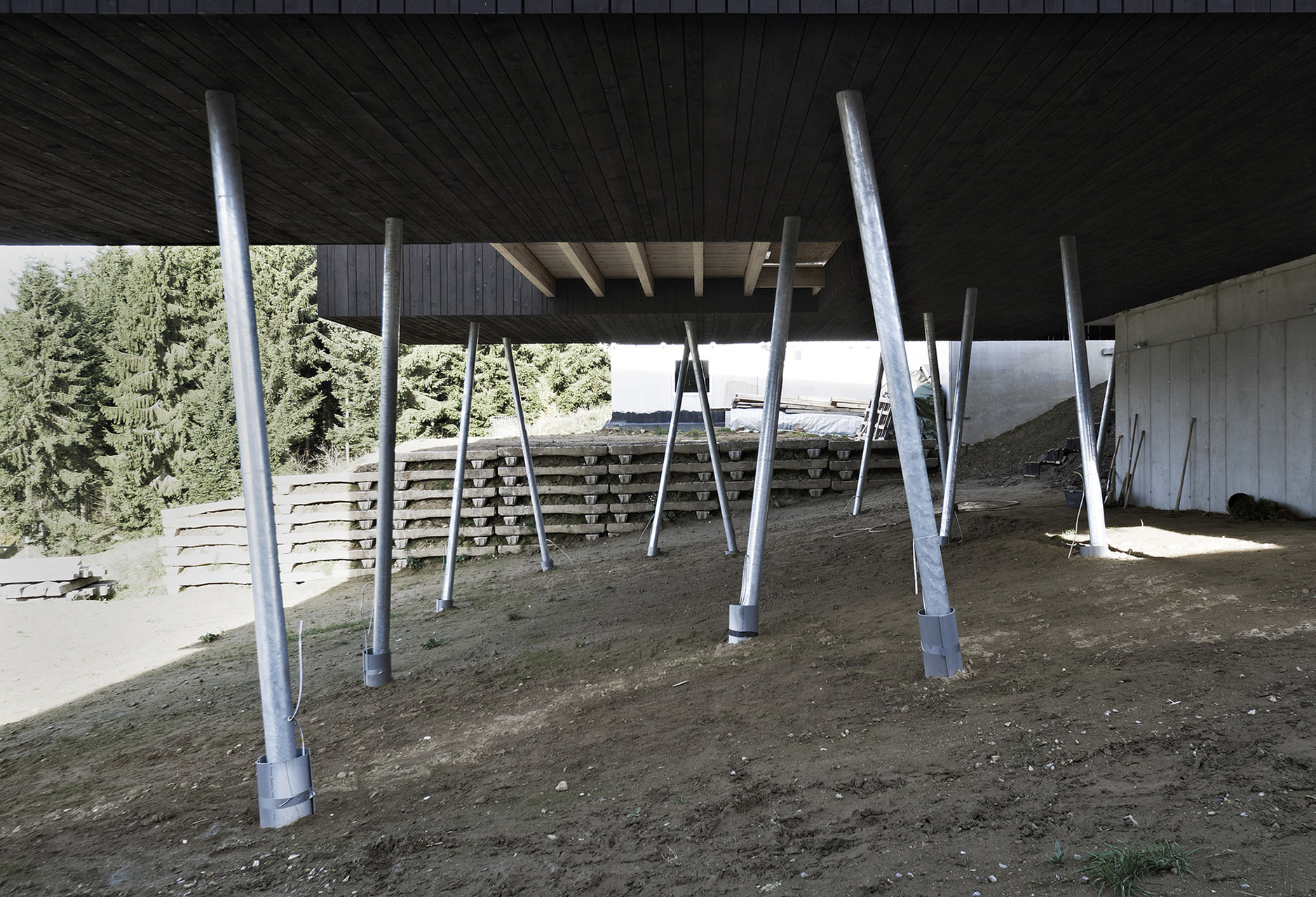 Die Stahlstützen sind auf den Holzbauraster ausgerichtet, durch die schräge Anordnung wird dieser Raster aufgelöst und es entsteht ein unregelmäßiges Erscheinungsbild. Ein kompakter Stahlbetonkern, der die Haustechnik und einen kleinen Lagerraum beinhaltet, steift das Gebäude gegen Windlasten aus.