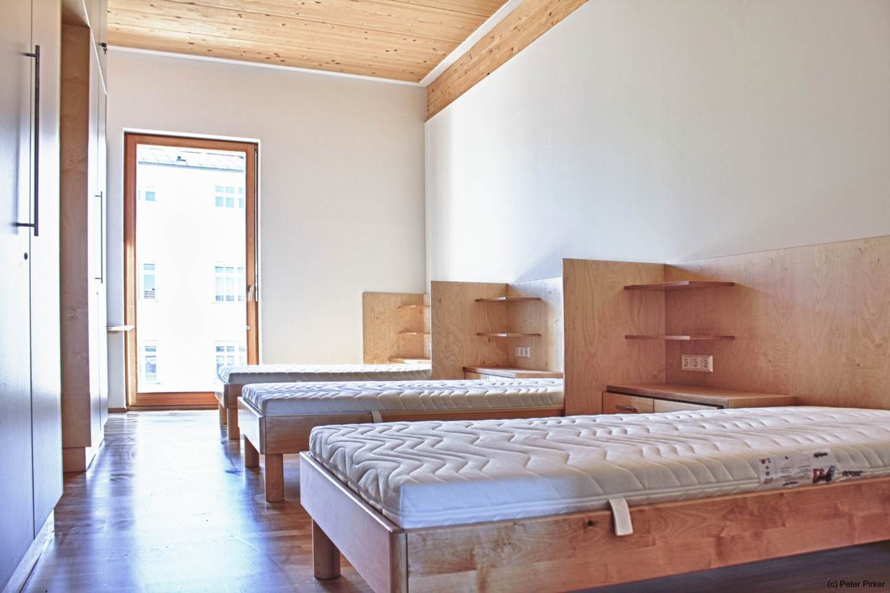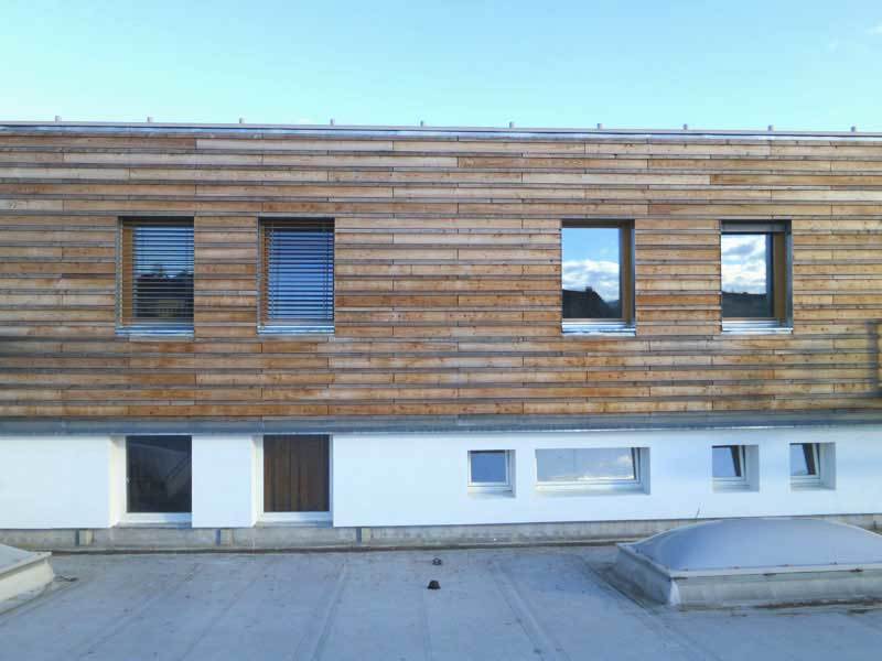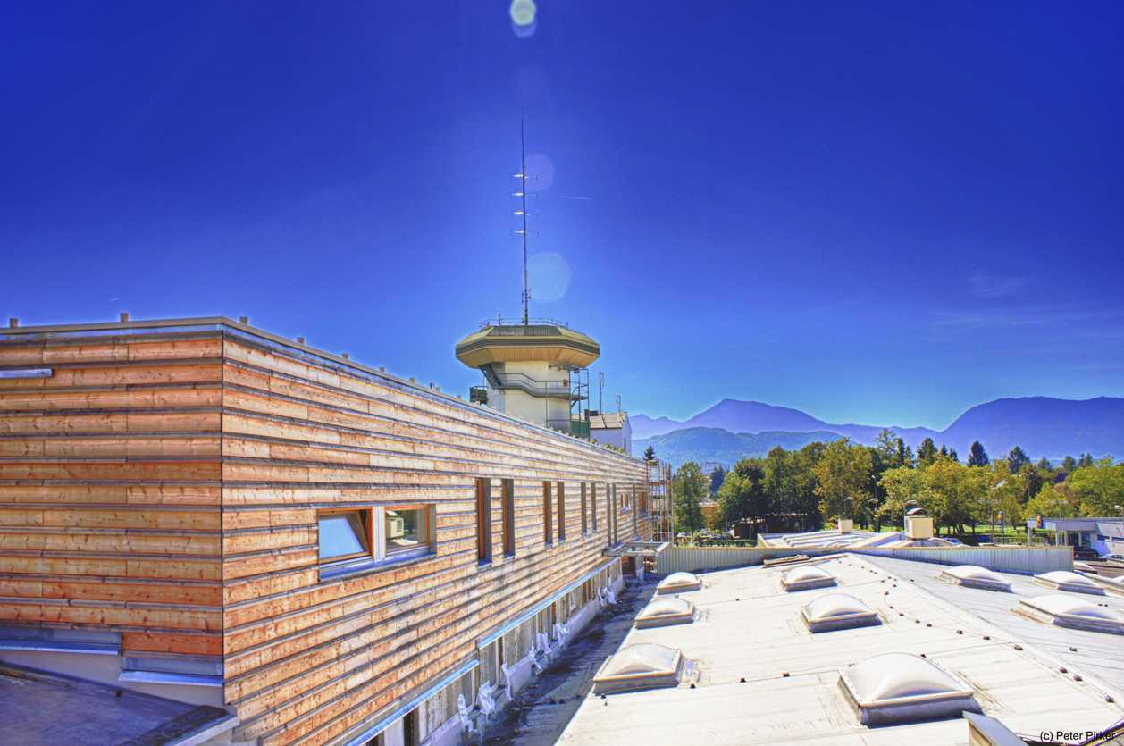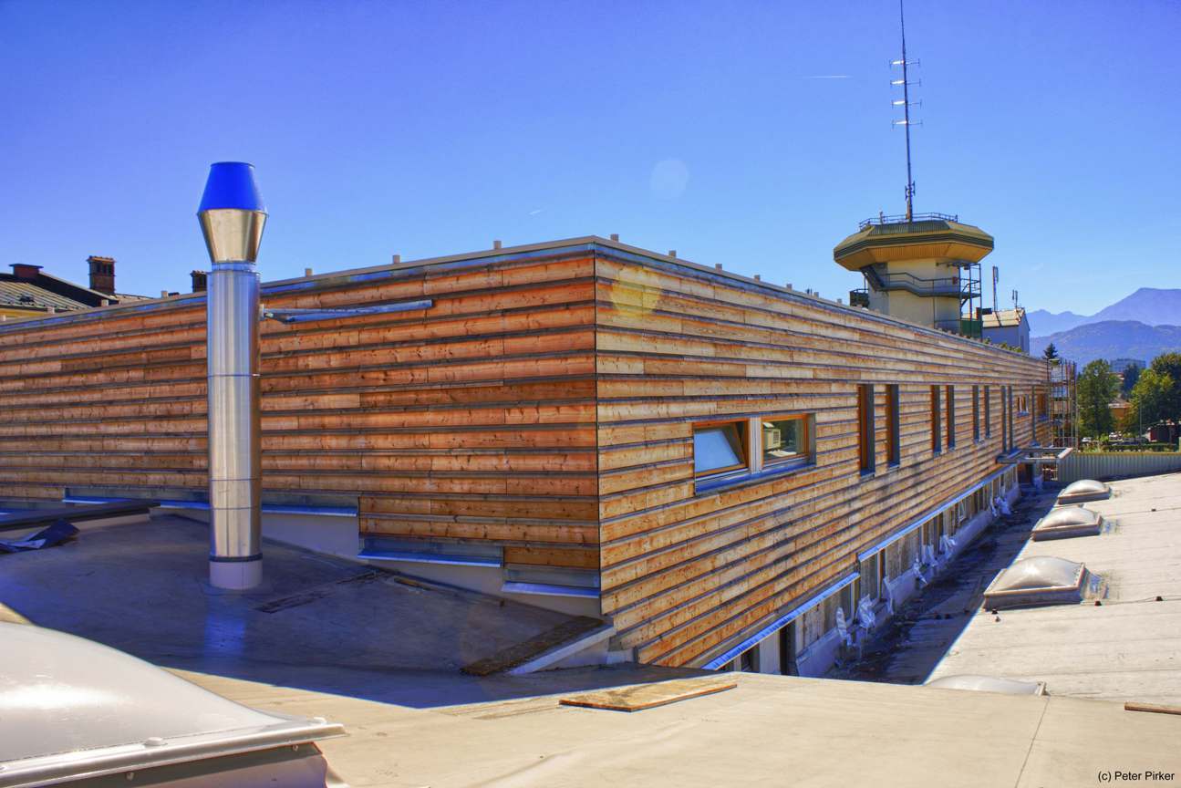 „Die Berufsfeuerwehr Klagenfurt verwendete bei der eingeschoßigen Aufstockung auch aus statischen Gründen eine Stahl- Holzkonstruktion mit einer sichtbaren Brettstapeldecke. Das Projekt verdeutlicht die Eignung des Baustoffes Holz für innerstädtische Aufstockungen. Bei dem Projekt wurden auf Wunsch der Betreiber sowohl an den baulichen (90 Minuten Feuerwiderstand) als auch den anlagentechnischen (Brandmeldeanlage mit Alarmierung der im Haus befindlichen Feuerwehr) Brandschutz hohe Anforderungen gestellt. Im Sinne der Wirtschaftlichkeit wären Reduktionen ohne Einschränkungen der Schutzziele möglich gewesen.“