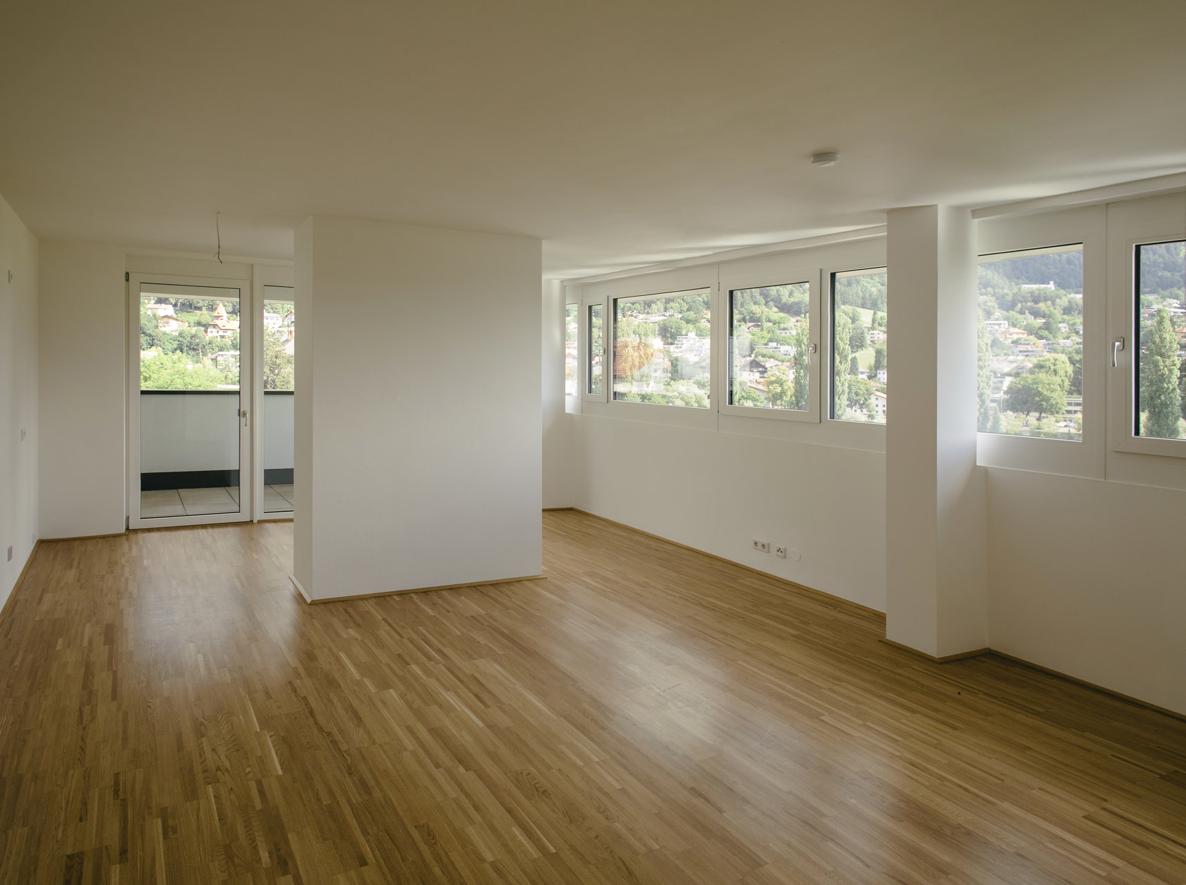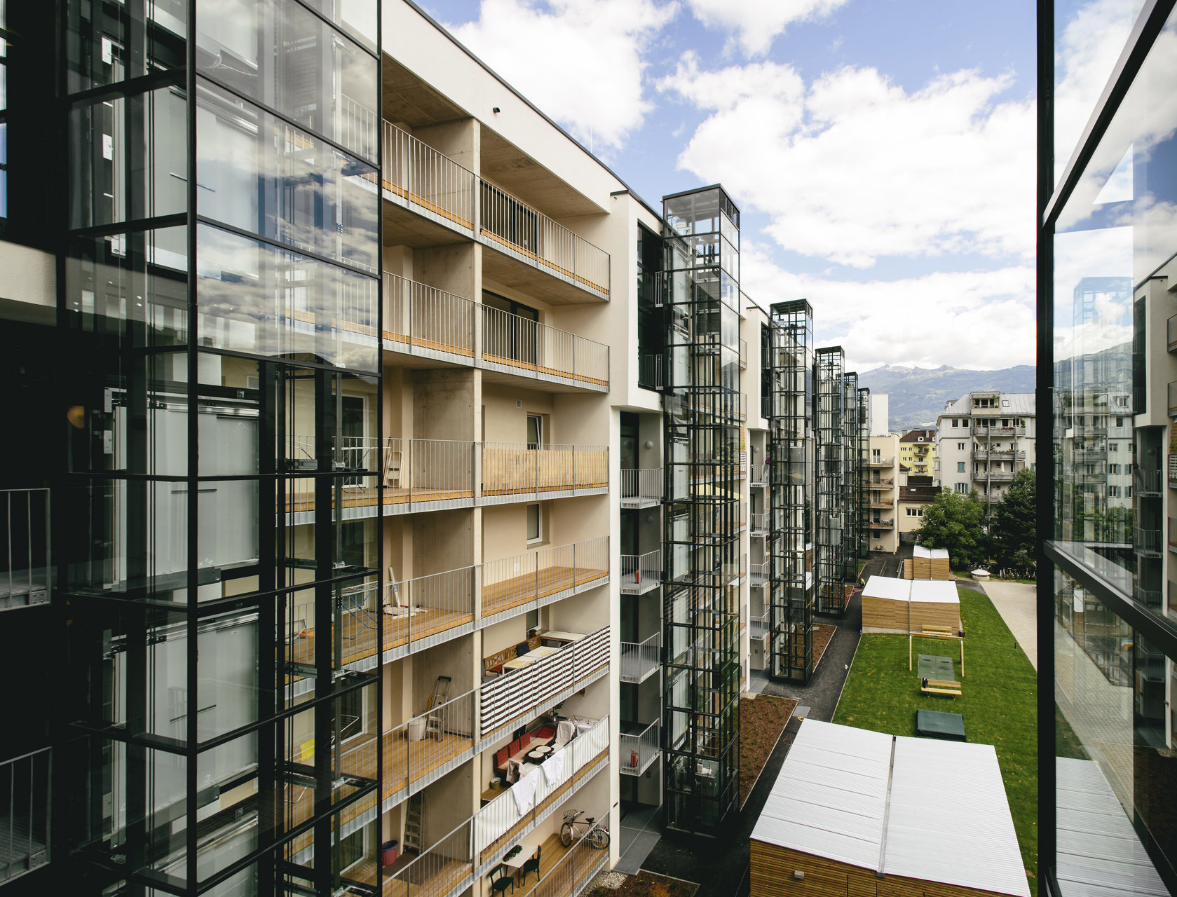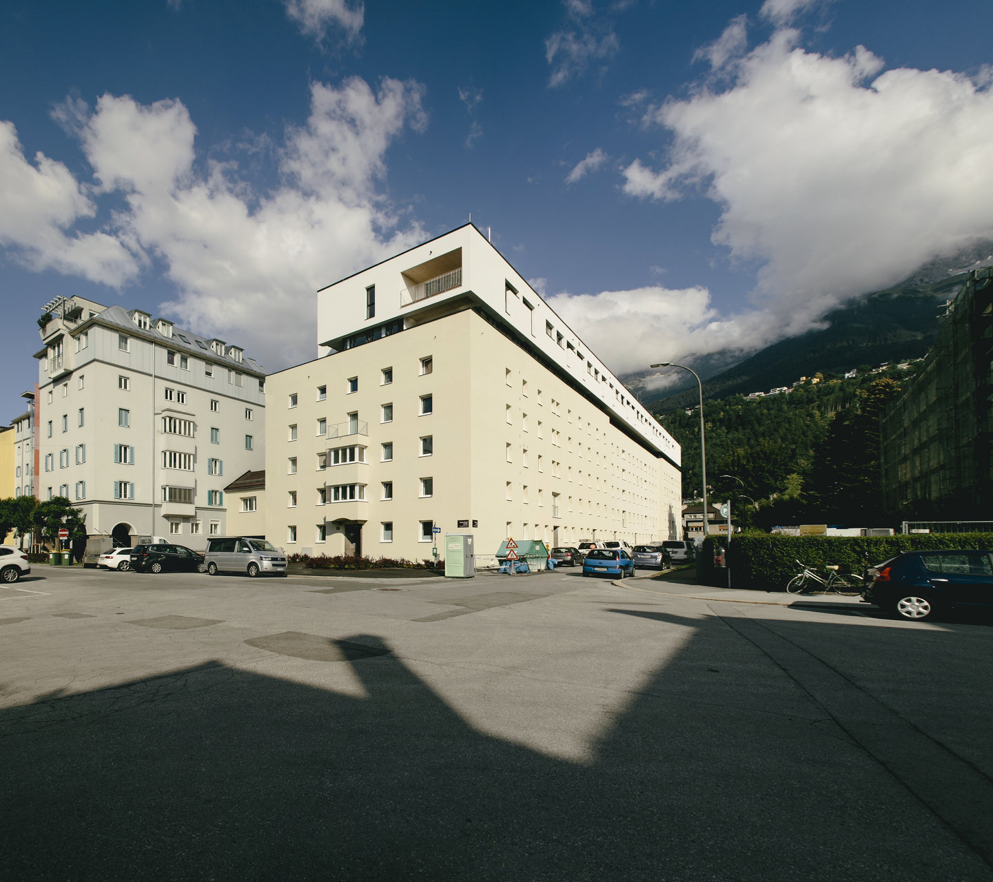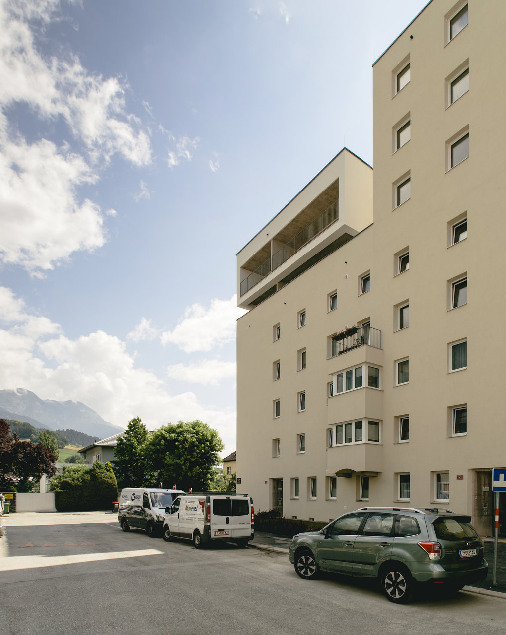 Eine Wohnanlage aus den 1950er Jahren mit 92 Wohnungen wurde umfassend saniert und gleichzeitig mit einer zweigeschoßigen Aufstockung um 32 Wohnungen erweitert. Neben der thermischen Sanierung erhielt ein Großteil der Wohnungen einen Liftanschluss und größere Balkone. Dämmmaßnahmen und der Einbau der dezentralen Be- und Entlüftung mit Wärmerückgewinnung wurden im bewohnten Zustand durchgeführt Die Aufstockung setzt sich durch ein straßenseitig umlaufendes Fensterband vom sanierten Bestand ab, gliedert sich in Ihrer Höhe aber ohne weiteres in die umgebende Bebauung ein. Sowohl die Sanierung des Bestands als auch die umfassende Aufstockung erfolgte nach den Qualitätsmaßstäben des Passivhaus-Instituts. (Text: Staatspreis Architektur & Nachhaltigkeit 2019)